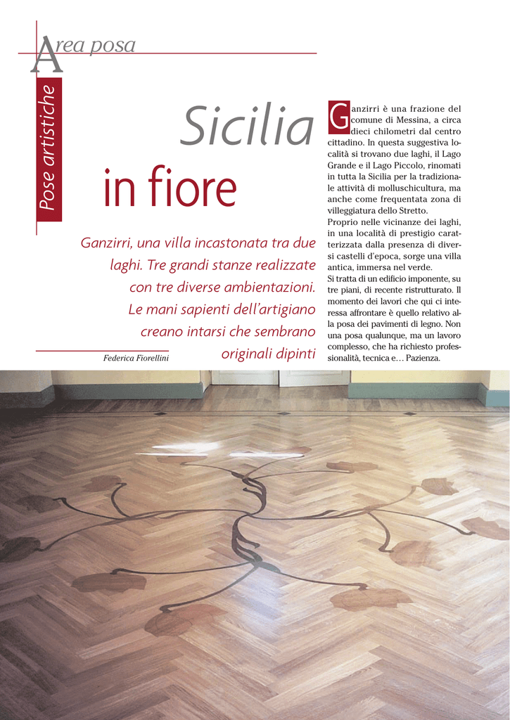 A Pose artistiche rea posa Sicilia in fiore Ganzirri, una villa incastonata tra due laghi. Tre grandi stanze realizzate con tre diverse ambientazioni. Le mani sapienti dell’artigiano creano intarsi che sembrano originali dipinti Federica Fiorellini G anzirri è una frazione del comune di Messina, a circa dieci chilometri dal centro cittadino. In questa suggestiva località si trovano due laghi, il Lago Grande e il Lago Piccolo, rinomati in tutta la Sicilia per la tradizionale attività di molluschicultura, ma anche come frequentata zona di villeggiatura dello Stretto. Proprio nelle vicinanze dei laghi, in una località di prestigio caratterizzata dalla presenza di diversi castelli d'epoca, sorge una villa antica, immersa nel verde. Si tratta di un edificio imponente, su tre piani, di recente ristrutturato. Il momento dei lavori che qui ci interessa affrontare è quello relativo alla posa dei pavimenti di legno. Non una posa qualunque, ma un lavoro complesso, che ha richiesto professionalità, tecnica e… Pazienza. A Pose artistiche rea posa Il particolare intreccio di calle realizzato manualmente negli angoli del salone. Si tratta di una posa molto particolare e di prestigio, ma al tempo stesso complessa, ogni stanza, infatti, doveva avere una composizione a sé, come se si trattasse di una serie di ambientazioni a tema. Il progetto, in particolare, prevedeva: w la realizzazione di un complesso decoro floreale al centro del salone di rappresentanza della villa; w la realizzazione di una serie di bordure caratterizzate da un particolare decoro, con un intreccio di calle; w una composizione costituita da due diverse specie legnose, montate a scalare e a scacchiera; w una composizione ottagonale e una romboidale, realizzate con specie legnose diverse. Lo studio tecnico Antonio Galeano, che ha seguito il progetto, ha affidato questo “arduo compito” alla ditta di Bruno Ciampi, vecchia conoscenza di Professional Parquet, un artigiano diventato negli anni uno dei posatori più quotati della sua zona. Le zona relax e notte Ma vediamo da vicino il lavoro di posa, partendo dal piano terra, caratterizzato da due grandi stanze: una sala biliardo e una zona relax. Nella zona biliardo il progettista ha studiato un disegno composto da tre tipi di legno - Wengé, Rovere e Doussié - da realizzare “a tappeto”, con doghe da 10 mm di spessore e dimensioni 60 x 300 mm. Il tappeto è composto da un esagono di Wengé intrecciato a un altro esagono di Doussié, riempiti entrambi all'interno da listelli di legno di Rovere. Il tutto racchiuso da una bindellatura di Doussié. Parallelamente alla bindellatura, sono stati poi creati dei corridoi di Rovere montati a tolda di nave diagonale. Nella zona realax è stata studiata una composizione diversa, realizzata anche qui con due tipi di legno - Doussié e Rovere - montati sempre a tappeto, questa volta composto da rombi in Doussié. L'interno dei rombi è stato realizzato con tavolette di Rovere. Anche questa sala è stata “racchiusa” da una bindellatura di Doussié, con corridoi in Rovere montati a tolda di nave diagonale. Con lo stesso procedimento, ma con una composizione geometrica diversa, è stata realizzata la zona notte, dove sono state creati, sempre con Doussié e Rovere, un disegno “scalare” e una scacchiera. Il soggiorno La posa più complessa, però, è stata senza dubbio quella realizzata nel soggiorno padronale, un ampio salone composto da tre aree (separate da porte doppie a giorno) di metrature diverse: la più ampia di 60 mq, le altre due di circa 20 mq ciascuna. 48 A Pose artistiche rea posa Il legno utilizzato è stato anche questa volta il Rovere, posato qui a spina di pesce (70 x 450 mm con 14 mm di spessore le dimensioni delle doghe); per le bindellature è stato utilizzato il Wengè. Nelle due sale è stata realizzata una bindellatura semplice doppia, parallela alle pareti. Negli angoli è stato realizzato il disegno di un “intreccio di calle”. La sala più piccola è caratterizzata da una bindellatura doppia tagliata in 3 cm; all'interno della bindellatura qui è stato inserito un tozzetto di Wengè, sezionato in quattro parti e montato a punta di diamante. Pazienza certosina Per la zona notte è stata scelta una scacchiera in Rovere e Doussié. 50 Per la sala grande l'architetto, Antonio Galeano, si è “sbizzarrito”, disegnando al centro della stanza un enorme intreccio di fiori, con quattro rami, ciascuno composto da tre boccioli. Proprio questo intreccio è il fiore all’occhiello dell’intero lavoro. Un occhio distratto potrebbe scambiarlo per un lavoro realiz- zato con il laser o ancora per un un disegno realizzato sul pavimento, invece no: ogni parte del decoro floreale è stata studiata e realizzata manualmente dai più validi operai di Bruno Ciampi, che hanno passato diverse notti insonni, supervisionati naturalmente dal titolare. Per la realizzazione del disegno i posatori sono partiti da due tavoloni da 14 mm tagliati in laboratorio: in essenza di Wengé per la realizzazione dei rami e in Doussié per i boccioli. Ciampi ha prima riprodotto il disegno dell’architetto su un enorme foglio di carta velina, che ha poi bucherellato con un ago seguendone il contorno; quindi ha riempito un collant di nylon con della terra d'ocra e l'ha tamponato sul disegno, facendo fuoriuscire la polvere, che andava a comporre l’inreccio. Tutta le fasi successive del lavoro sono state eseguite sotto l'occhio vigile di Ciampi: le giunte della spina di pesce dovevano essere tutte allineate tra di loro e nessuna doveva “stonare” con i rami e i fiori. Insomma, doveva sembrare un dipinto eseguito su parquet. La stessa tecnica - e la stessa pignoleria - ha caratterizzato la realizzazione delle calle che racchiudevano la spina di pesce (lunga 45 cm). Anche in questo caso, infatti, le calle curvate all'interno del pavimento dovevano essere perfettamente allineate. A lavori ultimati, la soddisfazione di tutto il team è stata 