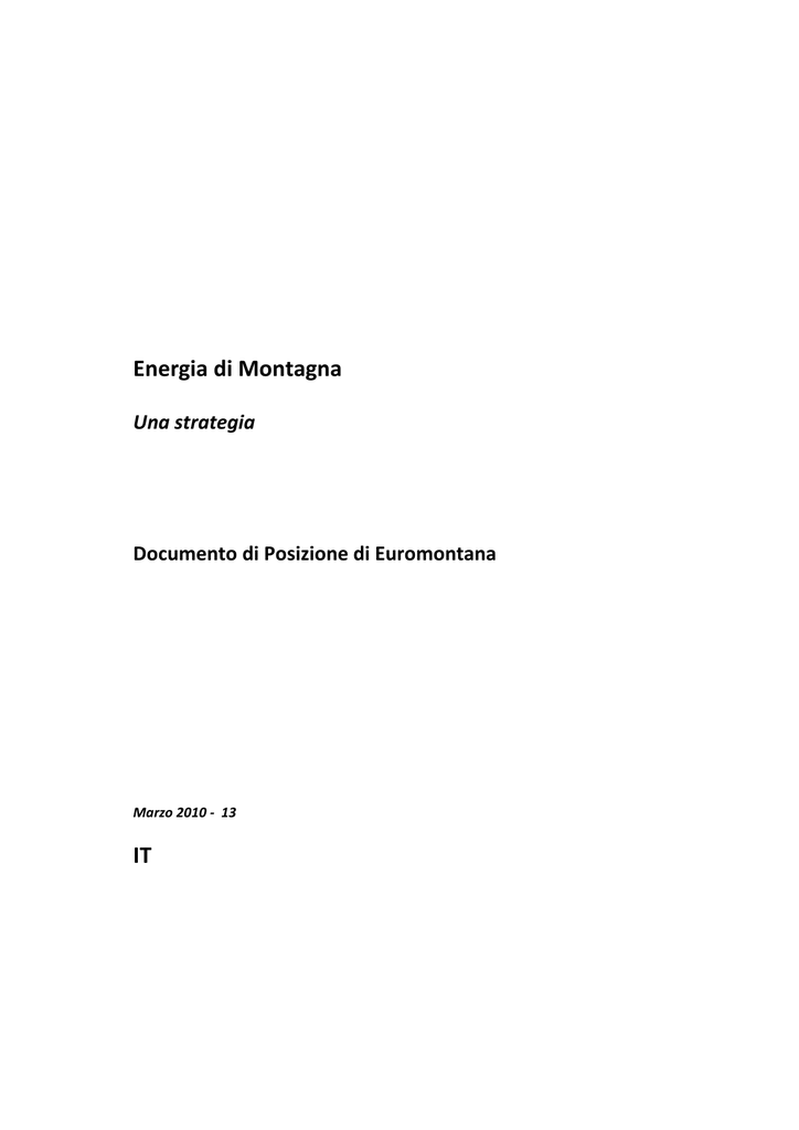Energia di Montagna Una strategia Documento di Posizione di Euromontana Marzo 2010 - 13 IT 1. Il Contesto 1.1. Le politiche dell’Unione Europea per l’Energia -> Ruolo della Montagna 1.1.1. La Commissione Europea ha proposto nel marzo 2006 il documento “Libro Verde sull’Energia” (COM(2006) 105), in cui ha dettagliatamente tracciato il quadro della situazione presente e delle prospettive future dei consumi, dell’approvvigionamento energetico, e delle strategie per la competitività e la liberalizzazione del mercato energetico, la riduzione dei carichi inquinanti e la sicurezza degli approvvigionamenti e delle reti nel mercato interno, traguardando un possibile futuro di autosufficienza energetica in ambito UE. 1.1.2. Tuttavia nel documento, che prende in considerazione con estremo realismo la situazione attuale del mercato dell’energia, si considerano in misura marginale le fonti di energia naturali e rinnovabili rispetto a quelle di origine fossile, e soprattutto non si prende in considerazione la specificità e le risorse di territori – quali la montagna – che in realtà rivestono un’importanza del tutto particolare in ambito europeo. 1.1.3. La Montagna infatti può rappresentare l’ambito privilegiato, per natura e per cultura dei suoi abitanti, della riduzione dei consumi in un quadro di alta qualità della vita, e della sperimentazione su larga scala di fonti rinnovabili. L’autosufficienza energetica di un territorio che rappresenta il 40,6 per cento dell’Unione, e il 19,1 per cento dei suoi abitanti1 (quasi 90 milioni su 450), può dare una spinta decisiva al raggiungimento degli obiettivi al 2020 (“20-20-20”), e a considerare la prospettiva dell’autosufficienza globale un traguardo possibile e non utopistico. 1.1.4. Questo documento infine delinea quattro obiettivi fondamentali per il futuro della Montagna: a) Diventare il territorio più efficiente possibile, sotto il profilo energetico; b) Aiutare le comunità a diventare autosufficienti attraverso lo sviluppo della produzione locale di energia da fonti diverse; c) Creare il know-how e la più appropriata rete di distribuzione tra territori montani per consentire un’esportazione dell’energia prodotta localmente; d) Generare una capacità professionale dei territori montani in materia di energia, attraverso la ricerca e lo sviluppo di progetti-pilota, così da scambiarsi buone pratiche tra territori diversi della Montagna europea. 1 Mountain Areas in Europe, Analysis of mountain areas in EU Member States, acceding and other European countries, commissioned by DG Regio to Nordregio, 2004. Energia di Montagna – Una strategia -Documento di Posizione Euromontana - Marzo 2010 2 1.1.5. Questo documento tuttavia riconosce trattarsi di un primo passo in un nuovo processo di sviluppo di strategie energetiche per il futuro dell’Europa. Inoltre, a questo stadio, questo documento può realisticamente indicare solo dei princìpi-guida e delle opportunità che la Montagna può offrire per aiutare la Commissione Europea a sviluppare una nuova Strategia Europea per l’Energia. Con questo obiettivo, Euromontana accoglierà volentieri qualsiasi ulteriore e più approfondito documento sulle diverse fonti di energia utilizzabili, su possibili modelli di sviluppo, reti di trasmissione e di conservazione, e quant’altro possa emergere dallo sviluppo della tecnologia e dalla ricerca scientifica e tecnologica nei territori montani. 1.2. Mercato dell’elettricità ed approvvigionamento di base 1.2.1. I recenti fenomeni di blackout, nell’Unione Europea e negli Stati Uniti, testimoniano la necessità di definire delle norme chiare in materia di gestione della rete di trasporto e di conseguenza assicurare una manutenzione e uno sviluppo corretto della rete stessa. Il “Libro bianco sui servizi di interesse generale” (COM(2004) 374) stabilisce il principio, che ogni cittadino ed ogni impresa dell’Unione Europea devono beneficiare di servizi di interesse generale a costi accessibili. Tale principio vale ugualmente per l’approvvigionamento in elettricità. Dal 1° luglio 2007 il mercato europeo dell’elettricità è stato interamente liberalizzato. Tale apertura del mercato ha posto la questione se il mercato possa assicurare l’approvigionamento di base ad ogni cittadino e impresa in tutte le regioni. La definizione della responsabilità di tale approvvigionamento di base incombe sulle legislazioni nazionali le quali possono prevedere una delega ai livelli inferiori. 1.2.2. Gli Stati Membri debbono definire, in materia di sicurezza dell’approvvigionamento, una politica generale e trasparente, non discriminatoria e compatibile con le esigenze di un mercato unico e concorrenziale dell’elettricità. Devono definire e rendere pubblici il ruolo e le responsabilità delle autorità competenti e dei diversi attori del mercato. (Base legale: Direttiva 2005/89/CE del Parlamento Europeo e del Consiglio del 18 gennaio 2006 concernente misure per la sicurezza dell’approvvigionamento di elettricità e per gli investimenti nelle infrastrutture.) 1.2.3. Quando adottano le misure di esecuzione di tale politica, gli Stati Membri devono prendere in considerazione alcuni elementi, in particolare, la necessità di: • assicurare la continuità dei fornitori di elettricità; • studiare il mercato interno e le possibilità di cooperazione transfrontaliera in materia di sicurezza dell’approviggionamento in elettricità; • ridurre gli effetti a lungo termine della crescita della domanda di elettricità; Energia di Montagna – Una strategia -Documento di Posizione Euromontana - Marzo 2010 3 • • • diversificare la produzione dell’elettricità al scopo di assicurare un equilibrio ragionevole tra i diversi combustibili; promuovere l’efficienza energetica e l’adozione di nuove tecnologie; rinnovare in permanenza le reti di trasporto e di distribuzione allo scopo di mantenere la performance. 1.2.4. I gestori dell