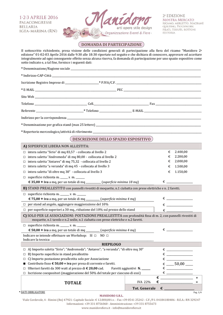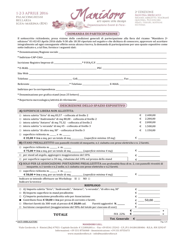 DOMANDA DI PARTECIPAZIONE Il sottoscritto richiedente, presa visione delle condizioni generali di partecipazione alla fiera del ricamo “Manidoro 2a edizione” 01-02-03 Aprile 2016 dalle 9:30 alle 18:30 riportate nel seguito e che dichiara di conoscere, approvare ed accettare integralmente ad ogni conseguente effetto senza alcuna riserva, fa domanda di partecipazione per uno spazio espositivo come sotto indicato e, a tal fine, fornisce i seguenti dati: * Denominazione/Ragione sociale ________________________________________________________________________________________________________ * Indirizzo-CAP-Città _______________________________________________________________________________________________________________________ Iscrizione Registro Imprese di ___________________________* P.IVA/C.F. ____________________________________________________________________ * E-MAIL _________________________________________________________________ PEC ______________________________________________________________ Sito Web _____________________________________________________________________________________________________________________________________ Telefono __________________________________________ Cell.____________________________________________ Fax _____________________________________ Referente ______________________________________* Telefono __________________________ E-MAIL ______________________________________________ Indirizzo per la corrispondenza ___________________________________________________________________________________________________________ * Denominazione per grafica stand (max 25 lettere) ____________________________________________________________________________________ * Repertorio merceologico/attività di riferimento _______________________________________________________________________________________ DESCRIZIONE DELLO SPAZIO ESPOSITIVO A) SUPERFICIE LIBERA NON ALLESTITA: □ □ □ □ □ □ intera saletta “Sirio” di mq 83,57 - collocata al livello 2 intera saletta “Andromeda” di mq 80,00 - collocata al livello 2 intera saletta “Antares” di mq 75,32 - collocata al livello 2 intera saletta “a veranda” di mq 45 - collocata al livello 3 € € € 2.400,00 2.200,00 2.000,00 € 1.500,00 intera saletta “di oltre mq 30” - collocata al livello 3 € 1.150,00 superficie richiesta m. ______ x m. _______ € 35,00 + iva a mq, per un totale di mq ____________ (superficie minima 18 mq) € _____________________ B) STAND PREALLESTITO con pannelli rivestiti di moquette, n.1 ciabatta con prese elettriche e n. 2 faretti. □ superficie richiesta m. _______ x m. _______ € 75,00 + iva a mq, per un totale di mq ___________ (superficie minima 4 mq) □ per stand ad angolo, aggiungere maggiorazione del 10% □ per superficie superiori a 30 mq., riduzione del 10% sul prezzo dello stand € _____________________ € _____________________ € _____________________ C) SOLO PER LE ASSOCIAZIONI: POSTAZIONE PREALLESTITA con profondità fissa di m. 2, con pannelli rivestiti di moquette, n.1 tavolo e n.2 sedie, n.1 ciabatta con prese elettriche e n.2 faretti. □ superficie richiesta m. _______ x m. _______ € 50,00 + iva a mq, per un totale di mq ___________ (superficie minima 4 mq) Indicare se intende effettuare un Workshop: SI □ NO □ € _____________________ Indicare la tecnica: __________________________________________________________________________________ RIEPILOGO □ □ □ ■ □ □ A) Importo saletta “Sirio”; “Andromeda”; “Antares”; “a veranda”; “di oltre mq 30” B) Importo superficie in stand preallestito C) Importo postazione preallestita solo per Associazione Contributo fisso € 50,00 + iva per presa di corrente e faretti. Ulteriori faretti da 300 watt al prezzo di € 20,00 cad. Faretti aggiuntivi N. _______ Iscrizione coespositori (maggiorazione del 50% del totale per ciascuno di essi) TOTALE * DATI OBBLIGATORI € _____________________ € _____________________ € _____________________ IVA 22% € ______ 50,00 ______ € _____________________ € _____________________ € __________________________ + € __________________________ = Tot. Generale € ________________________ Pag. 1/4 MANIDORO S.R.L. Viale Cordevole, 4 - Rimini (Rn) 47921- Capitale Sociale: € 12.000,00 i.v. - Fax +39 0541 25242 - C.F./P.I. 04184180406 - R.E.A.: RN 329247 Informazioni: +39 331 8756060 - Amministrazione: +39 331 8755673 www.manidorofiera.it - [email protected] Da compilare solo in cado si presenza di co-espositore. Dati coespositore ___________________________________________________________________________________________________________________________________________ Ragione sociale _____________________________________________________ Indirizzo-CAP-Città ______________________________________________________________ Iscrizione Registro Imprese di __________________________________________ P.IVA/C.F. __________________________________________________________________ E-MAIL ________________________________________________________________________ PEC _________________________________________________________________________ Sito Web _____________________________________________________________________ Telefono/Fax ______________________________________________________________ □ SCONTO FEDELTÀ Gli espositori che hanno partecipato alla fiera del ricamo “Manidoro 1a edizione” potranno usufruire di uno sconto pari a € 50,00. (Lo sconto è da calcolare solo dopo il conteggio del totale generale, comprensivo di iva). TOTALE QUOTA DI PARTECIPAZIONE * * quota di iscrizione e parcheggio gratuiti anche per la 2a edizione € ____________________________________ METODO DI PAGAMENTO I pagamenti, intestati a “MANIDORO S.R.L.”, dovranno essere eseguiti mediante bonifico bancario con il seguente codice IBAN: IT91 R089 9524 2080 0309 0011 336 , di cui: Acconto : pari al 30% dell’ammontare della quota di partecipazione, andrà corr