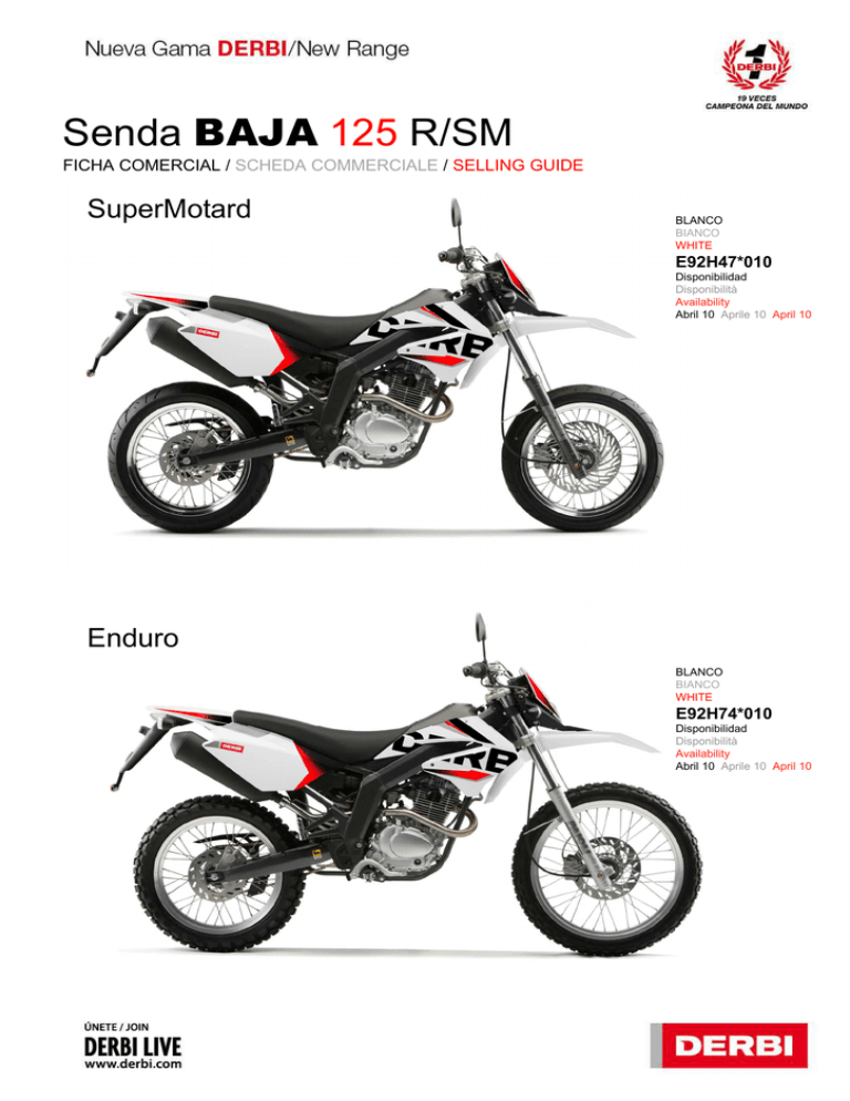 Senda BAJA 125 R/SM FICHA COMERCIAL / SCHEDA COMMERCIALE / SELLING GUIDE SuperMotard BLANCO BIANCO WHITE E92H47*010 Disponibilidad Disponibilità Availability Abril 10 Aprile 10 April 10 Enduro BLANCO BIANCO WHITE E92H74*010 Disponibilidad Disponibilità Availability Abril 10 Aprile 10 April 10 Senda BAJA 125 R/SM FICHA TÉCNICA / SCHEDA TECNICA / TECHNICAL DATA SHEET SENDA BAJA 125 R Motor / Engine / Motore Cilindrada / Displacement / Cilindrata Diámetro x carrera / Bore x stroke / Alessaggio x corsa Alimentación / Fuel supply / Alimentazione Refrigeración / Cooling System / Refrigerazione Lubricación / Lubrication System / Lubrificazione Arranque / Starting System / Avviamento Cambio / Gear Box / Cambio Embrague / Clutch / Frizione Bastidor / Frame / Telaio Suspensión delantera / Front Suspension / Sospensione anteriore Monocilíndrico 4T 2V Euro 3 / Single cylinder 4Stroke 2V Euro 3 / Monocilindrico 4T 2V Euro 3 124 cc Monocilíndrico 4T 2V Euro 3 / Single cylinder 4Stroke 2V Euro 3 / Monocilindrico 4T 2V Euro 3 124 cc 56,5 x 49,5 mm 56,5 x 49,5 mm Carburador Ø26 / Ø26 Carburettor / Ø26Carburatore Aire/ Air / Aria Cárter húmedo / Wet sump / Carter umido Arranque eléctrico / Electric starter / Avviamento elettrico Carburador Ø26 / Ø26 Carburettor / Ø26Carburatore Aire/ Air / Aria Cárter húmedo / Wet sump / Carter umido Arranque eléctrico / Electric starter / Avviamento elettrico 5 velocidades / 5 speeds / 5 velocità Multidisco / Multi-plate / Dischi multipli doble viga de acero / steel perimetral double beam/ Profilo perimetrale in acciaio 5 velocidades / 5 speeds / 5 velocità Multidisco / Multi-plate / Dischi multipli doble viga de acero / steel perimetral double beam/ Profilo perimetrale in acciaio Horquilla hidr. Ø41 mm. Recorrido 195 mm/ Ø41 mm. hydraulic fork. 195 mm travel/ Forcella convenzionale Ø41 mm, corsa mm Suspensión posterior / 195 Monoamortiguador con regulación de Rear suspension / precarga. Recorrido 200 mm / Sospensione posteriore Monoshock with adjustable preload. Wheel travel 200 mm / Monoammortizzatore con regolazione in pre carico. Corsa 200 mm Freno anterior / Disco / Disc / Disco: ∅ 260 mm Front brake / Freno anteriore Freno posterior / Disco / Disc / Disco: ∅ 220 mm Rear brake / Freno posteriore Neumáticos / Delantero / Front / Anteriore: 3,00 x 21” Tyres / Trasero / Rear / Posteriore: 4,10 x 18” Pneumatici Longitud máxima / Maximum Lenght / Lunghezza massima Anchura máxima / Maximun width / Larghezza massima Distancia entre ejes / Wheelbase / Interasse Altura asiento / Seat Height / Altezza sella Dep. de combustible / Fuel Tank / Capacità serbatoio SENDA BAJA 125 SM Horquilla hidr. Ø41 mm. Recorrido 195 mm/ Ø41 mm. hydraulic fork. 195 mm travel/ Forcella convenzionale Ø41 mm, corsa 195 mm Monoamortiguador con regulación de precarga. Recorrido 200 mm / Monoshock with adjustable preload. Wheel travel 200 mm / Monoammortizzatore con regolazione in pre carico. Corsa 200 mm Disco / Disc / Disco: ∅ 300 mm Disco / Disc / Disco: ∅ 220 mm Delantero / Front / Anteriore: 110/80x17" Trasero / Rear / Posteriore: 130/70X17" 2.154 mm 2.104 mm 818 mm 818 mm 1.452 mm 1.452 mm 890 mm 845 mm 8 L (1,5 L reserve) 8 L (1,5 L reserve) Senda DRD 125 R/SM CARACTERÍSTICAS PRINCIPALES / CARATTERISTICHE PRINCIPALI / MAIN FEATURES 1. Fiable Motor 125 4T 2V Euro3 2. Chasis robusto, derivado de la familia Terra/DRD 3. Resistentes llantas en aluminio 4. Asiento cómodo prolongado sobre el deposito para un mejor control de la moto 5. Potente frenada mediante frenos de disco delantero y trasero. 6. Resistente basculante en acero de sección variable 7. Piloto posterior de LEDS y soporte de matrícula desmontable. 8. Estética renovada más actual y 1. Affidabile motore 125 4T 2V Euro3 2. Telaio robusto direttamente derivato dalla famiglia Terra/DRD 3. Resistente cerchi in alluminio 4. Sella comoda che si prolunga sopra il serbatoio, per un migliore controllo di guida 5. Impressionante capacità di frenata mediante impianto a doppio disco (anteriore e posteriore) 6. Forcellone in acciaio a sezione variabile 7. Fanale posteriore a LEDS 8. Estética rinnovata, più moderna ed sportiva 1. Reliable 125 4T 2V engine Euro3 2. Resistant chassis from Derbi Terra/DRD product range 3. Aluminum rims 4. Comfortable saddle is extended over tank fo ensure a better riding control 5. Outstanding braking capacity by means of dual disc brake system (front and rear) 6. Variable section steel swing arm 7. Rear LED light 8. Renewed and more sporty design and graphics deportiva 7 4 8 2 3 1 6 5 Senda BAJA 125 R/SM ACCESORIOS/ ACCESSORI / ACCESSORIES 862902 Kit cubremanetas SM Kit copri manopole SM / Closed SM protector kit 865081 Kit protectores maneta ENDURO Kit copri manopole ENDURO / ENDURO grips protector kit 866473 Manillar Aluminio 6061DRD-Parts Ø22mm Manubrio in Alluminio 6061 DRD- Parts / Handlebar Alu 6061 DRD-Parts 866474 Barra de refuerzo central para manillar Ø22mm Barra di rinforzo centrale manubrio Ø22mm / alu. cross bar 865411 Kit cofre35 Bauletto 35 l / Top case 35 l 866481 Leva desembrague DRD-Parts Leva frizione in Ergal / Aluminium clutch lever 866512 Kit empuñaduras de silicona bicolor Domino Kit manopole Domino bicolor in silicona / Dual layer Domino grips 866678 Kit intermitentes LED Kit indicatori di direzione a LED / LED turnlight Kit 866679 TapetaFreno-DRD-Parts en Aluminio Kit tapo pompa di freno DRD-Parts / Aluminium brake reservoir tap 866258 Kit 8 stickers “RACING COMPETITION" 17“ Kit 8 decalco “RACING COMPETITION" 17“ / Kit 8 stickers 8666060001 Kit 8 stickers “RACING" 17“ (versión SM) Kit 8 stickers “RACING " 17“ (versión SM) / Kit 8 stickers 866477 Espuma de protección para manillar Spugna paracolpi per manubrio DRD-Parts / Handlebar crossbar pad 866548 Antirrobo universal 1m Catena antifurto universale / Anti-theft device standard 866684 Antirrobo universal blindado 1m Catena antifuro universale blindato / Anti-theft 