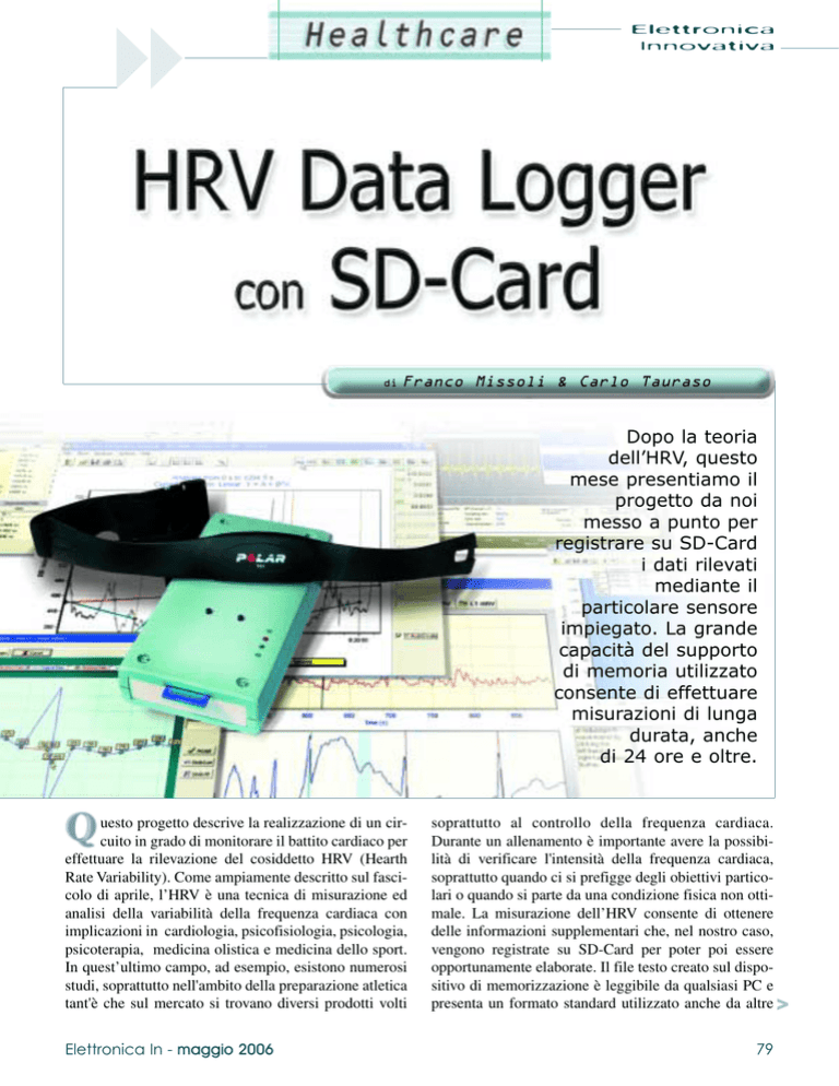! Elettronica Innovativa di Franco Missoli & Carlo Tauraso Dopo la teoria dell’HRV, questo mese presentiamo il progetto da noi messo a punto per registrare su SD-Card i dati rilevati mediante il particolare sensore impiegato. La grande capacità del supporto di memoria utilizzato consente di effettuare misurazioni di lunga durata, anche di 24 ore e oltre. uesto progetto descrive la realizzazione di un circuito in grado di monitorare il battito cardiaco per effettuare la rilevazione del cosiddetto HRV (Hearth Rate Variability). Come ampiamente descritto sul fascicolo di aprile, l’HRV è una tecnica di misurazione ed analisi della variabilità della frequenza cardiaca con implicazioni in cardiologia, psicofisiologia, psicologia, psicoterapia, medicina olistica e medicina dello sport. In quest’ultimo campo, ad esempio, esistono numerosi studi, soprattutto nell'ambito della preparazione atletica tant'è che sul mercato si trovano diversi prodotti volti Elettronica In - maggio 2006 soprattutto al controllo della frequenza cardiaca. Durante un allenamento è importante avere la possibilità di verificare l'intensità della frequenza cardiaca, soprattutto quando ci si prefigge degli obiettivi particolari o quando si parte da una condizione fisica non ottimale. La misurazione dell’HRV consente di ottenere delle informazioni supplementari che, nel nostro caso, vengono registrate su SD-Card per poter poi essere opportunamente elaborate. Il file testo creato sul dispositivo di memorizzazione è leggibile da qualsiasi PC e presenta un formato standard utilizzato anche da altre > 79 apparecchiature medicali. Il circuito prevede inoltre la possibilità di evidenziare all'interno del tracciato l'inizio ed il termine di uno specifico evento. In questo modo è possibile verificare il differente comportamento del muscolo cardiaco in funzione dell’attività svolta. Ad esempio, durante una corsa, sarà possibile evidenziare il momento in cui l'atleta deve superare un percorso in salita che richiede un maggior sforzo. La segnalazione avviene in maniera da non influenzare la misura degli intervalli di tempo tra un battito e l'altro. Sul tracciato viene inserito un apposito “marker” affinché il software di analisi sia in grado di evidenziare le diverse attività intercorse durante l'allenamento. Per rilevare il battito cardiaco abbiamo utilizzato una cintura trasmettitore ed un piccolo ricevitore prodotti dalla Polar (www.polar.fi), la più nota azienda operante in questo campo. La cintura (identica a quella dei tradizionali cardiofrequenzimetri) va indossata prima di avviare il monitoraggio: i battiti cardiaci rilevati vengono trasmessi via radio ad un piccolo ricevitore presente nel nostro circuito che li trasforma in impulsi elettrici. Questi ultimi vengono elaborati da Fig. 1 TX 80 un microcontrollore che calcola il tempo intercorrente tra l'uno e l'altro sulla base di un segnale di clock generato attraverso un apposito quarzo. Naturalmente messa così la cosa sembra piuttosto semplice, in realtà il firmware deve essere in grado di gestire la SD-card con un file system compatibile Windows, registrare gli eventi sul supporto di memorizzazione attivando e disattivando un timer interno ed effettuare i controlli sul circuito nella maniera più rapida possibile. Il sistema prevede, inoltre, l'alimentazione a batteria ed il monitoraggio della carica della stessa oltre ad un'accensione e spegnimento controllati direttamente dal micro. Iniziamo descrivendo il funzionamento della cintura trasmittente e del modulo di ricezione. Ci riferiamo in particolare alla documentazione resa disponibile dalla Polar. Modulo TX/RX La rilevazione del battito cardiaco viene effettuata tramite una cintura elastica che deve essere indossata in maniera tale da far aderire al torace due piccoli elettrodi posti sul retro della stessa. Per rendere il monitoraggio ottimale la cintura deve essere posta al di sotto dei muscoli pettorali ed il trasmettitore deve trovarsi al centro in corrispondenza dello sterno. La parte di pelle a contatRX to con gli elettrodi deve essere leggermente inumidita e la banda elastica deve essere regolata in maniera da essere sufficientemente stretta senza che questo comporti però un fastidio per la persona che deve indossarla. Il trasmettitore lavora su una frequenza di 5,5 kHz ed invia i dati al ricevitore in maniera non codificata. Non è quindi esente da possibili interferenze da parte di altri trasmettitori posti nelle vicinanze. In particolare il raggio di utilizzo del sistema TX/RX si aggira attorno al metro, pertanto bisogna fare attenzione a posizionare il ricevitore non troppo lontano (la distanza dal trasmettitore non deve superare gli 80 cm). Secondo quanto descritto nei datasheet, la migliore ricezione avviene nel momento in cui l'asse della bobina presente sul modulo ricevente è parallela al flusso magnetico generato dalla cintura. Dai test effettuati questo fatto non è molto critico a patto che la distanza dal trasmettitore non si avvicini troppo al limite estremo (vedi Fig. 1). Il modulo ricevente è composto da una piccola basetta in SMD con 6 pad divise in due gruppi da 3 in maniera da poter essere montata con l'asse della bobina di ricezione parallelo al lato più lungo. Per facilitare il fissaggio al nostro circuito abbiamo utilizzato le pad più grandi con una maggiore spaziatura (J4, J5, J6). Nel box riportato nella pagina seguente viene riassunta la piedinatura del ricevitore. La tensione di alimentazione va da 3V a un massimo di 12V per un assorbimento decisamente basso considerando che al massimo arriva a 55 µA. Il modulo ricevente dispone di un'uscita digitale di tipo 0-3V. Ad ogni impulso proveniente dal trasmettitore corrisponde un livello logico alto (3V) che viene mantenuto per circa 10ms. Pertanto, in uscita si genera un segnale facilmente interpretabile dal microcontrollore il quale dovrà utilizzare un apposito segnale di timing per calcolare l'intervallo di t