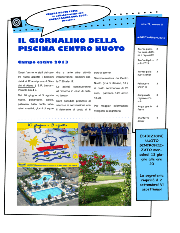 CE TO LEC O NUO e con R n T N io E z C . abora . COOP C in coll NA SO I G A P ta VOLTA presen Anno II, numero 5 IL GIORNALINO DELLA PISCINA CENTRO NUOTO Quest ’ anno lo staff del cen- dra e tante altre attività tro nuoto aspetta i bambini intratterranno i bambini daldai 4 ai 12 anni presso I Giar- le 7.30 alle 17. Vernole km 4 ) . Le attività continueranno all ’ interno in caso di catti- Dal 10 giugno al 3 agosto vo tempo. nuoto, Trofeo pueri- 2 tia: rana, delfino e regionali!!! Trofeo Hydro- 2 polis 2013 Campo estivo 2013 dini di Atena ( S.P. Lecce – MAG GIO-GIUGNO2013 Sommario: pallanuoto, calcio, Sarà possibile pranzare al pallavolo, ballo, canto, labo- sacco o in convenzione con ratori creativi, giochi di squa- il ristorante al costo di 6 euro al giorno. Torneo pallanuoto senior 3 Pallanuoto under 13 3 Campionato regionale Fisdir 3 Acqua gym in festa! 4 Staffette senior 4 Servizio minibus dal Centro Nuoto ( via di Ussano, 51 ) al costo settimanale di 20 euro, partenza 8.20 arrivo 13.20. Per maggiori informazioni rivolgersi in segreteria! ESIBIZIONE NUOTO SINCRONIZZATO mercoledì 12 giugno alle ore 20 La segreteria riaprirà il 2 settembre! Vi aspettiamo! Trofeo “Pueritia”: rana, delfino e regionali!!! Nella terza giornata del Trofeo per scuole nuoto della provincia di Lecce, tenutasi a Maglie, il 7 aprile 2013 si sono disputate le gare a rana e nuoto con ostacoli. Nella gara a rana si sono aggiudicati l’oro: Mirko Colonna, Francesco Nitti, Federica Imbò, Gaia De Rinaldis, Federica De Rinaldis; l’argento: Gaia Papi, Andrea De Filippi, Laura Iurlano, Andrea Cesario, Luca Mazzotta, Francesco greco; il bronzo: Valeria Paladini, Giovanni Solazzo, Eugenio Conte, Sofia Calogiuri, Giovanni Mazzotta. Nella gara del nuoto a ostacoli hanno meritato l’oro: Sofia Calogiuri, Giovanni Nella quarta giornata della fase provinciale del circuito, disputatesi a Lecce presso la MUV, il 5 maggio si sono svolte le gare a delfino e le staffette. E finalmente le fasi regionali il 19 e 26 maggio!! Le nostre medaglie d’oro: Mirko Colonna 25 m Ra, Umberto Di Chiara 50 m Do, Federica De Rinaldis 50 m Do. Ecco i risultati: oro a Giovanni Solazzo, Giulia Scarano, Sofia Calogiuri, Gaia De Rinaldis, Federica De Rinaldis, Brenda Raho, Francesco Greco, Alessandro Albani; argento a Laura Iurlano; bronzo a Andrea De Filippi, Francesca D’Amico, Federica Imbò, Federica De Filippis. Le nostre medaglie d’argento: Giovanni Solazzo 25 m De, Francesca Greco 50 m Do, Federica De Rinaldis 100 m misti. La staffetta ( Giulia Scarano dorso, Mattia Conte rana, Riccardo De Filippo delfino, Francesca D’Amico stile) è arrivata seconda. Le medaglie di bronzo: Federico De Filippi 50 m Do, Alessandro Albani 50 m De, Giovanni Mazzotta 50 m Sl, Federica Imbò 50 m Ra, Sofia Calogiuri 50 De, Gaia De Rinaldis 50 m De, Brenda Raho 50 m De, Francesca D’Amico 50 m Sl, Alessandro Albani 100 m misti. Bravi ragazziiiiiiii!!!!! Mazzotta, Federica De Filippi, Umberto Di Chiara, Federica De Rinaldis, Francesco Greco; l’argento: Giulia Scarano, Ivan Mazzeo; il bronzo: Riccardo De Filippo, Federica Imbò, Gaia De Rinaldis. Trofeo Hydropolis 2013 Ecco i nomi dei partecipanti allo staffettoIl 14 aprile a Poggiardo si è svolto il 6° Trofeo Hydropolis ed ancora una volta la nostra società è arrivata prima!!! ne 2013: Mattia Conte, Carola Guida, Euge- 16 ragazzi, nati tra il 2004 e il 1997, si Mazzotta, Sofia Calogiuri, Matteo Giuri, sono cimentati in tre prove di staffetta sui 25 metri: sottopassaggio, nuoto con la palla, torpedo. Pagina 2 nio Conte, Martina Paladini, Laura Iurlano, Francesco Nitti, Federica Imbò, Giovanni Michel Conte, Gaia De Rinaldis, Federica De Filippi, Gianluca Pariti, Federica De Rinaldis, Francesco Mazzeo. IL GIORNALINO DELLA PISCINA CENTRO NUOTO Torneo pallanuoto senior Le partite del 24 aprile sono state combattute! Gli Squali hanno avuto la meglio sui Barracuda, con il punteggio di 4 a 2 e i Piranha sui Delfini per 4 a 3. Alla finale del 29 maggio si sono scontrate Delfini e Barracuda, mentre la partita decisiva tra Squali e Piranha è stata interrotta per l’ eccessivo agonismo in campo! Il premio dell’iscrizione gratuita per la prossima stagione è stato così assegnato alla squadra dei Barracuda. Pallanuoto under 13 Sincronette A Molfetta abbiamo vinto contro WP Bari e affrontato con grinta anche il Molfetta. Gli impegni del campionato continuano con le partite del 9 giugno e con una finalissima il 23 giugno a Bari. Sabato 8 le nostre sincronette andranno a Taranto per esibirsi nelle loro coreografie nell’ambito del Campionato regionale estivo propaganda. Domenica 16 la nostra squadra di agoniste si cimenterà nei balletti preparati per il Campionato regionale estivo agoniste. A fine mese Rosalba D’Elia andrà alla fase nazionale. In programma anche la consueta esibizione esticva. Capocannoniere del torneo è risultato Stefano Pasca con 8 gol. Bravoooooo!!! Acqua gym in festa! Si è svolta domenica 26 maggio la festa dell’acquagym!! Una lezione tutta speciale con Paola, Pasquale, Marilena e Barbara . Mentre mercoledì 6 giugno le più fedeli frequentatrici dei corsi di acqua gym si sono ritrovate in pizzeria per concludere l’a stagione prima della pausa estiva e festeggiare i compleanni di Gianpaolo e Marilena. Medaglie master Campionato regionale Fisdir Il 21 aprile a Bari Daniela Marra si è aggiudicata la sua ennesima medaglia sui 50 mt dorso. Il 21 aprile a Gioia del Colle (BA) Cristian Luafa è arrivato primo nei 50 mt rana e secondo nei 25 mt stile libero. Il 19 maggio a Modugno Michael Raho ha guadagnato il bronzo nei 50 mt dorso. Anno II, numero 5 Pagina 3 CENTRO NUOTO LECCE Scuola nuoto federale Via di Ussano, 55 Tel.: 0832/244022 Cell.: 328/3203516 E-mail: [email protected] Sito web: www.centronuotolecce.it La tua piscina è differente! Seguici sul sito e su fb!!! Staffette senior! Grande successo per l’edizione 2013 delle gare sociali senior!! Ben 18 squadre si son