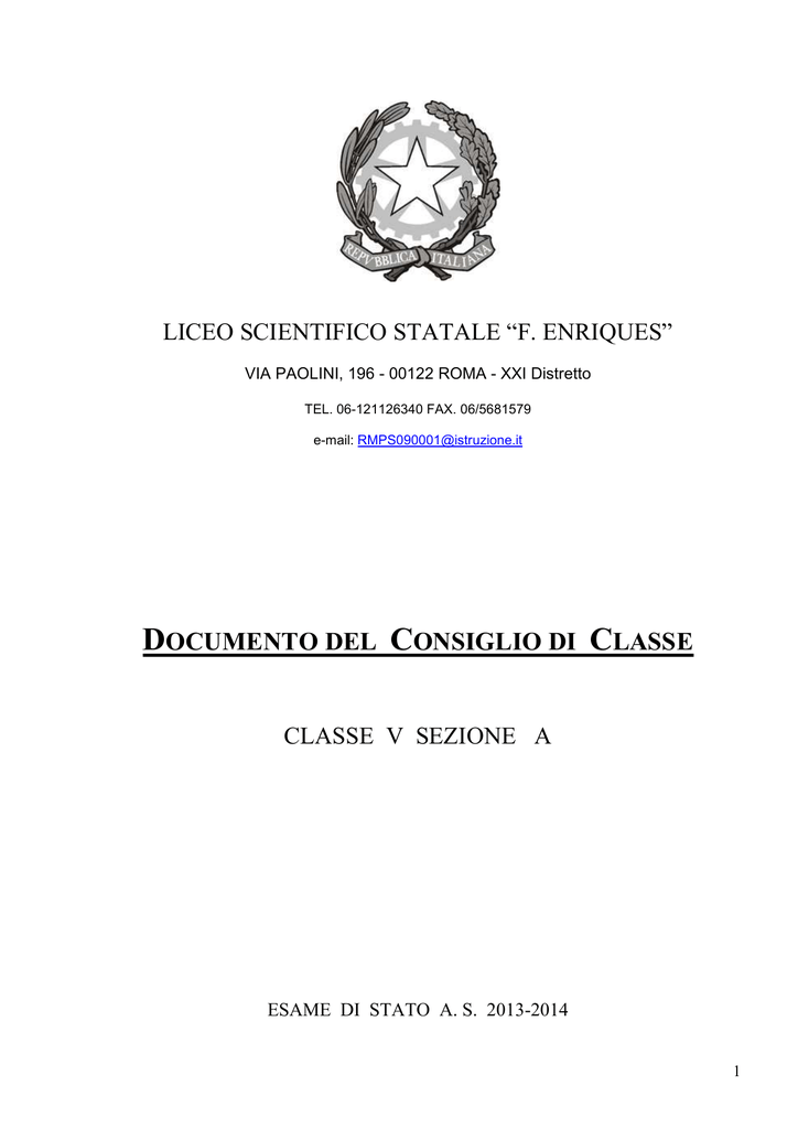 LICEO SCIENTIFICO STATALE “F. ENRIQUES” VIA PAOLINI, 196 - 00122 ROMA - XXI Distretto TEL. 06-121126340 FAX. 06/5681579 e-mail: [email protected] DOCUMENTO DEL CONSIGLIO DI CLASSE CLASSE V SEZIONE A ESAME DI STATO A. S. 2013-2014 1 LICEO SCIENTIFICO STATALE “F. ENRIQUES” VIA F. PAOLINI, 196 – 00122 ROMA ESAME DI STATO A.S. 2013– 2014 DOCUMENTO DEL CONSIGLIO DI CLASSE CLASSE 5^ SEZIONE A INDIRIZZO SCIENTIFICO DISCIPLINA RELIGIONE ITALIANO – LATINO STORIA – FILOSOFIA MATEMATICA - FISICA I LINGUA STRANIERA (Inglese) II LINGUA STRANIERA (Francese) III LINGUA STRANIERA (Spagnolo) SCIENZE STORIA DELL’ARTE ED. FISICA RAPPRESENTANTE GENITORI RAPPRESENTANTE GENITORI RAPPRESENTANTE STUDENTI RAPPRESENTANTESTUDENTI PRESIDE Roma, 13/05/2014 DOCENTE Saeli Agnese Fantuzzi Marisa Filippi Silvia Mancini Rossella Barattucci Marcella FIRMA D’Ubaldo Antonio Cantagallo Rita Piersimoni Antonio Gil Calzado Maria Ana DeAngelis Alessandro Ruisi Francesco CRESPINA Elena IL DIRIGENTE SCOLASTICO Elena Crespina 2 SOMMARIO 1. Presentazione dell’Istituto 2. Strutture a disposizione della didattica 3. Finalità educative e obiettivi trasversali 4. Profilo della classe 5. Modalità di lavoro 6. Strumenti di valutazione 7. Criteri di valutazione 8. Attività di recupero e/o di sostegno 9. Attività extracurriculari 10. Prove simulate 11. Relazioni finali 12. Programmi svolti 13. Griglia valutazione prima prova scritta in allegato 14. Griglia valutazione seconda prova scritta in allegato 15. Griglia valutazione terza prova scritta in allegato 16.Griglia di valutazione del colloquio in allegato 3 1. PRESENTAZIONE DELL’ISTITUTO Il Liceo Scientifico “ Federigo Enriques” è il primo Liceo Scientifico sorto sul territorio e la sua storia si intreccia con quella del rapido ed intenso sviluppo della XIII Circoscrizione. Attualmente ha sede in via Federico Paolini, 196 e nella succursale di via Olivieri n. 141. Il Liceo Scientifico “F. Enriques” garantisce un’istruzione ispirata ai principi della democrazia e dell’uguaglianza ispirandosi a tale scopo ai seguenti principi fondamentali: l’uguaglianza e la pari dignità nell’erogazione del servizio scolastico, escludendo ogni forma di discriminazione; l’integrazione di studenti in situazione di particolare difficoltà (studenti lavoratori, stranieri, portatori di handicap): la realizzazione di attività extrascolastiche e parascolastiche, che contribuiscono a rendere la scuola centro di promozione culturale, sociale e civile; l’aggiornamento e la formazione, intesi come diritto – dovere per tutto il personale scolastico e compito per l’amministrazione la libertà di insegnamento dei docenti e la formazione globale degli alunni nel rispetto degli obiettivi formativi. Il bacino d’utenza dell’Istituto copre una vasta area territoriale e include centri abitati anche al di fuori del XXI distretto. L’itinerario didattico -formativo finora seguito e quello proposto per il futuro mira a coniugare la cultura scientifica con la cultura umanistica , a potenziare le competenze linguistica di L1 ed L2 , con il concorso di tutte le discipline . Fondandosi su questi principi, il Collegio dei Docenti, ha orientato i percorsi formativi nei seguenti indirizzi di studio: 1. 2. 3. 4. 5. Liceo Scientifico “Nuovo Ordinamento” Liceo Scientifico tradizionale (classi V) Liceo Scientifico con sperimentazione di Scienze (classi V) Liceo Linguistico “Nuovo Ordinamento” Liceo Scientifico con Indirizzo Linguistico (classi V) 4 2. STRUTTURE PER LA DIDATTICA SEDE CENTRALE (Via Paolini, 196) UNA BIBLIOTECA UNA PALESTRA UN’AULA MAGNA UN LABORATORIO DI LINGUE MULTIMEDIALE UN LABORATORIO DI FISICA UN LABORATORIO DI SCIENZE UN LABORATORIO DI INFORMATICA UN LABORATORIO MULTIMEDIALE SEDE SUCCURSALE (Via Olivieri, 141) UNA BIBLIOTECA UNA PALESTRA UN’AULA MAGNA UN LABORATORIO DI SCIENZE E FISICA UN LABORATORIO MULTIMEDIALE UN LABORATORIO LINGUISTICO UN LABORATORIO DI INFORMATICA SEDE SUCCURSALE (Via A. Da Garessio,109) UN LABORATORIO MULTIMEDIALE 5 3. FINALITA’ EDUCATIVE L’attività educativa dell’istituto è finalizzata alla formazione integrale della persona attraverso un insieme di relazioni e di rapporti che favoriscano la crescita comune di docenti, studenti, genitori e di tutto il personale scolastico. Ci si propone dunque di costruire un clima di forte motivazione al lavoro e di cooperazione di tutte le componenti che renda ognuna di esse parte attiva del processo formativo e del rapporto educativo. In una società complessa, soggetta a continui mutamenti sociali e lavorativi, l’attività educativa dell’Istituto si prefigge di essere sempre più polivalente attenta ad un continuo rinnovamento didattico e rispondente alle esigenze di una preparazione orientata verso l’acquisizione di abilità intellettuali funzionali allo sviluppo di capacità e competenze utili alla prosecuzione degli studi universitari, nel mondo del lavoro, nei rapporti con le istituzioni civili e nei rapporti sociali e interpersonali, in un contesto sia nazionale che internazionale. Tali finalità possono essere ricondotte ai seguenti ambiti: Etico – Civile 1. Formare l’uomo e il cittadino educandolo al rispetto degli altri, dell’ambiente in cui vive alla consapevole accettazione delle responsabilità civiche e all’osservanza delle leggi 2. Coltivare la coscienza che l’appartenenza al proprio Paese non è ostacolo, ma presupposto di piena adesione alla Comunità europea e mondiale, che esige impegno concreto per la pace e la solidarietà tra i popoli. 3. Sviluppare il senso di responsabilità e la formazione di un quadro stabile di valori sociali, quali l’uguaglianza, la giustizia, la libertà e la solidarietà. 4. Lottare contro ogni forma di pregiudizio e di acritico conformismo per superare preclusioni mentali, posizioni preconcette e resistenza al cambiamento. 5. Sostenere il processo di transizione all’età adulta, promuovendo la capacità di assumere