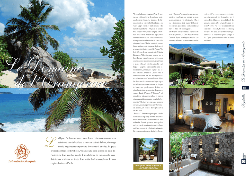 L a Digue, l’isola senza tempo, dove le macchine non sono ammesse e si circola solo in bicicletta o con carri trainati da buoi, dove ogni piccolo angolo sembra riprodurre il concetto di paradiso. In questa preziosa gemma delle Seychelles, vicino ad una delle spiagge più belle del- l’arcipelago, dove maestosi blocchi di granito fanno da contorno alla splendida laguna, vi attende un rifugio dove sentire il calore accogliente di casa e cogliere l’anima dell’isola. QUOTE A PARTIRE DA € 191,00 al gg Prezzi aggiornati sul sito www.skorpiontravel.com sola e dell’oceano, ma propone trattamenti rigeneranti per lo spirito e per il corpo fatti utilizzando prodotti locali dai profumi esotici, oltre ad un attrezzato Fitness Centre. Ma sono sicuramente da esplorare i fondali, facendo snorkeling, l’interno dell’isola, con camminate lungo i sentieri, e le altre meravigliose spiagge di La Digue, prendendo una delle biciclette dell’hotel. Le Domaine de l’Orangeraie rante “Combava” propone invece cene romantiche e raffinate con menù à la carte, accompagnate da vini selezionati. Due i bar a disposizione degli ospiti: “L’Alambic” con terrazza panoramica a strapiombo sul mare ed il bar dell “infinity pool”. Situata sulle alture della baia e circondata da massi granitici, la Eden Rock Wellness Centre & Spa è un rifugio tranquillo che non solo offre una vista mozzafiato dell’i- 115 Seychelles Le Domaine de l’Orangeraie Vicino alla famosa spiaggia di Anse Severe, su una collina che va degradando lentamente verso il mare, Le Domaine de l’Orangeraie è un piccolo hotel dedicato a chi vuole fuggire per un po’ dalla frenesia e dal rumore quotidiano e rifugiarsi in un’oasi fatta di relax, tranquillità e semplici camminate nella natura. Il calore del legno, i toni caldi della terra e uno stile architettonico che riprende la tradizione locale contraddistinguono le sue 63 ville inserite in un ambiente idilliaco, tra il cinguettio degli uccelli e i profumi di fiori tropicali. 20 Garden Villa di 60 mq, alcune comunicanti; 8 Family Residence Villa, disegnate apposta per le famiglie: un piano terra con patio, zona giorno dove si possono sistemare un terzo e quarto letto, un piccolo cucinotto e un bagno, e un primo piano con balcone, camera da letto, un lussuoso bagno e una cabina armadio. 31 Villas de Charme sono in cima alla collina, con una meravigliosa vista sull’oceano e sull’isola di Praslin; abbellite da materiali naturali come legno e granito che danno un tocco esotico ed elegante, hanno una grande camera da letto, un piccolo salottino, guardaroba, bagno con vasca e doccia all’aperto. 3 “Elegance” più appartate e più ampie regalano il piacere di una vasca idromassaggio, mentre la Presidential Villa è un vero e proprio santuario del lusso, con maggiordomo privato, terrazza, piscina, un chiosco dove pranzare e un’area relax. “Santosha”, il ristorante principale a buffet con live cooking, sorge di fronte ad un mare turchese con una vista sublime sull’Isola di Praslin. Tutto il giorno si potrà godere del piacere di sapori mediterranei influenzati da accenti creoli ed asiatici e di specialità create appositamente dagli chef. Il risto-