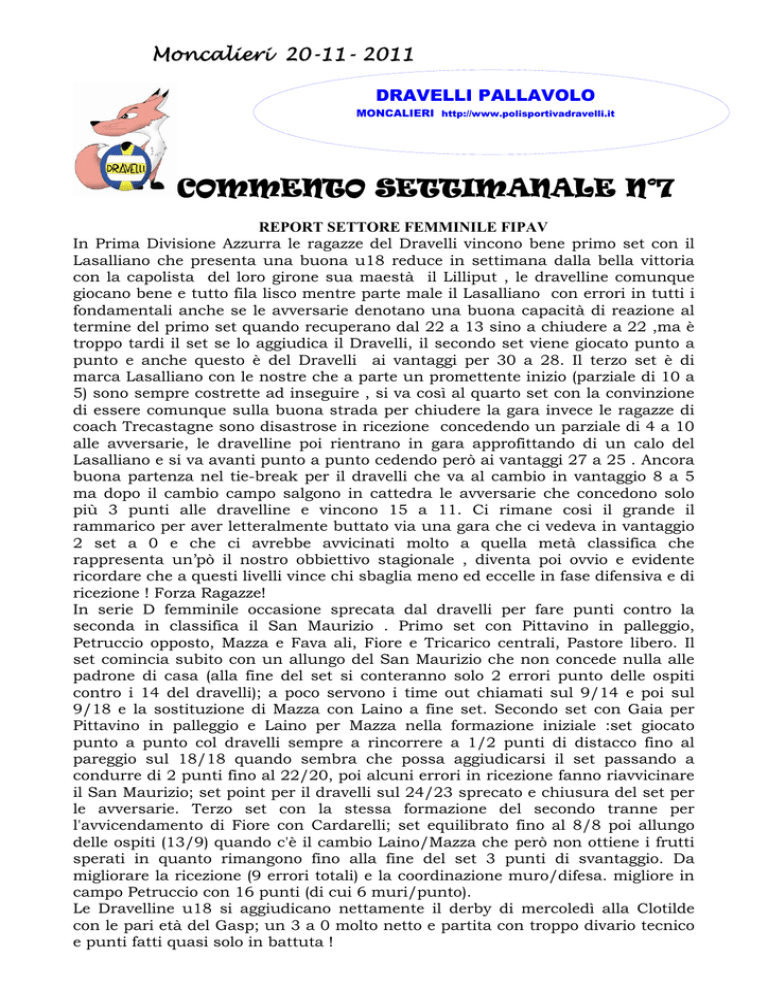 Moncalieri 20-11- 2011 DRAVELLI PALLAVOLO MONCALIERI http://www.polisportivadravelli.it COMMENTO SETTIMANALE N°7 REPORT SETTORE FEMMINILE FIPAV In Prima Divisione Azzurra le ragazze del Dravelli vincono bene primo set con il Lasalliano che presenta una buona u18 reduce in settimana dalla bella vittoria con la capolista del loro girone sua maestà il Lilliput , le dravelline comunque giocano bene e tutto fila lisco mentre parte male il Lasalliano con errori in tutti i fondamentali anche se le avversarie denotano una buona capacità di reazione al termine del primo set quando recuperano dal 22 a 13 sino a chiudere a 22 ,ma è troppo tardi il set se lo aggiudica il Dravelli, il secondo set viene giocato punto a punto e anche questo è del Dravelli ai vantaggi per 30 a 28. Il terzo set è di marca Lasalliano con le nostre che a parte un promettente inizio (parziale di 10 a 5) sono sempre costrette ad inseguire , si va così al quarto set con la convinzione di essere comunque sulla buona strada per chiudere la gara invece le ragazze di coach Trecastagne sono disastrose in ricezione concedendo un parziale di 4 a 10 alle avversarie, le dravelline poi rientrano in gara approfittando di un calo del Lasalliano e si va avanti punto a punto cedendo però ai vantaggi 27 a 25 . Ancora buona partenza nel tie-break per il dravelli che va al cambio in vantaggio 8 a 5 ma dopo il cambio campo salgono in cattedra le avversarie che concedono solo più 3 punti alle dravelline e vincono 15 a 11. Ci rimane cosi il grande il rammarico per aver letteralmente buttato via una gara che ci vedeva in vantaggio 2 set a 0 e che ci avrebbe avvicinati molto a quella metà classifica che rappresenta un’pò il nostro obbiettivo stagionale , diventa poi ovvio e evidente ricordare che a questi livelli vince chi sbaglia meno ed eccelle in fase difensiva e di ricezione ! Forza Ragazze! In serie D femminile occasione sprecata dal dravelli per fare punti contro la seconda in classifica il San Maurizio . Primo set con Pittavino in palleggio, Petruccio opposto, Mazza e Fava ali, Fiore e Tricarico centrali, Pastore libero. Il set comincia subito con un allungo del San Maurizio che non concede nulla alle padrone di casa (alla fine del set si conteranno solo 2 errori punto delle ospiti contro i 14 del dravelli); a poco servono i time out chiamati sul 9/14 e poi sul 9/18 e la sostituzione di Mazza con Laino a fine set. Secondo set con Gaia per Pittavino in palleggio e Laino per Mazza nella formazione iniziale :set giocato punto a punto col dravelli sempre a rincorrere a 1/2 punti di distacco fino al pareggio sul 18/18 quando sembra che possa aggiudicarsi il set passando a condurre di 2 punti fino al 22/20, poi alcuni errori in ricezione fanno riavvicinare il San Maurizio; set point per il dravelli sul 24/23 sprecato e chiusura del set per le avversarie. Terzo set con la stessa formazione del secondo tranne per l'avvicendamento di Fiore con Cardarelli; set equilibrato fino al 8/8 poi allungo delle ospiti (13/9) quando c'è il cambio Laino/Mazza che però non ottiene i frutti sperati in quanto rimangono fino alla fine del set 3 punti di svantaggio. Da migliorare la ricezione (9 errori totali) e la coordinazione muro/difesa. migliore in campo Petruccio con 16 punti (di cui 6 muri/punto). Le Dravelline u18 si aggiudicano nettamente il derby di mercoledì alla Clotilde con le pari età del Gasp; un 3 a 0 molto netto e partita con troppo divario tecnico e punti fatti quasi solo in battuta ! Prima partita del girone di ritorno per le ragazze dell’U16F che oggi, guidate dal coach Folli, si sono imposte sul campo del Val Noce vincendo per 3 set a 0 , portandosi a casa altri 3 punti. Fondamentali saranno i prossimi due appuntamenti delle Dravelline contro l’Union For Volley e il Testona Gialla, partite molto sentite ed importanti per la classifica finale del girone.… forza ragazze !!! Continua intanto la marcia trionfale della nostra u14f , le ragazze di coach Leone regolano 3-0 il Magic Pinerolo 98 e comandano la classifica del girone G con 18 punti, 6 vittorie su 6 gare .Gara ben giocata con turn-over totale in campo di tutte le atlete ; migliore in campo Paola Fucci. REPORT SETTORE MASCHILE FIPAV PMT I ragazzi di Prima Divisione della Pmt Dravelli escono sconfitti dal campo di Osasco dal Galup Pinerolo ma nonostante il risultato, è stata una gara equilibrata, risolta dai padroni di casa solo ai vantaggi nel secondo e terzo set al termine di forti rimonte da parte dei giovani della Pmt, abili a ribaltare svantaggi anche di 7-8 punti con la diagonale Romero-Santoro sugli scudi. Forza ragazzi !! Per la nostra u18m vi è da registrare una netta sconfitta dei Dravellini in casa del Nuncas Chieri :partita sempre in mano ai collinari che non lasciano scampo alla Pmt costretta ad inseguire per i primi due set. Poca consistenza in attacco, da ogni parte della rete rende agevole la vita ai ragazzi di Sergio Ravera che alterna diverse formazioni. Nella terza frazione Momenté torna al modulo col doppio alzatore inserendo Santoro (rientrato da due settimane di assenza) in diagonale con Romero; si viaggia punto a punto fino al 23 pari quando Chieri trova l’allungo decisivo. Secondo concentramento per i giovani atleti u14M di cocah Scarpa che questa settimana si è tenuto alla Battisti di Moncalieri : avversari erano il Nuncas Chieri ed il Benassi Alba entrambi superati per 3 a 0 dai dravellini che come la settimana scorsa si comportano bene nei fondamentali e sono bravi soprattutto al servizio . Migliori in campo Alessandro V. e Alex M. Ora vediamo le altre squadre PMT : In serie C dopo la netta vittoria ottenuta con il fanalino di coda del girone la Torino Pallavolo continua la corsa solitaria in vetta alla classifica dei ragazzi di coach Balestra 6 gare e 6 vittorie ! prossima importante gara sabato 26 quando i ragazzi di coach Balestra faranno visita Novara Volley secondo in classifica. Importante anche la netta vittoria ottenuta dai ragazz