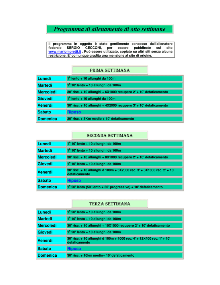 Programma di allenamento di otto settimane Il programma in oggetto è stato gentilmente concesso dall’allenatore federale SERGIO CECCONI, per essere pubblicato sul sito www.mariomoretti.it . Può essere utilizzato, copiato su altri siti senza alcuna restrizione. E’ comunque gradita una menzione al sito di origine. PRIMA SETTIMANA Lunedi 1h lento + 10 allunghi da 100m Martedi 1h 10' lento + 10 allunghi da 100m Mercoledi 30' risc. + 10 allunghi + 6X1000 recupero 2' + 10' defaticamento Giovedi 1h lento + 10 allunghi da 100m Venerdi 30' risc. + 10 allunghi + 4X2000 recupero 3' + 10' defaticamento Sabato Riposo Domenica 30' risc. + 8Km medio + 10' defaticamento SECONDA SETTIMANA h Lunedi 1 10' lento + 10 allunghi da 100m Martedi 1 10' lento + 10 allunghi da 100m Mercoledi 30' risc. + 10 allunghi + 8X1000 recupero 2' + 10' defaticamento Giovedi 1 10' lento + 10 allunghi da 100m Venerdi 30' risc. + 10 allunghi d 100m + 3X2000 rec. 3' + 3X1000 rec. 2' + 10' defaticamento Sabato Riposo Domenica 1 20' lento (50' lento + 30' progressivo) + 10' defaticamento h h h TERZA SETTIMANA h Lunedi 1 20' lento + 10 allunghi da 100m Martedi 1 10' lento + 10 allunghi da 100m Mercoledi 30' risc. + 10 allunghi + 10X1000 recupero 2' + 10' defaticamento Giovedi 1 20' lento + 10 allunghi da 100m Venerdi 30' risc. + 10 allunghi d 100m + 1000 rec. 4' + 12X400 rec. 1' + 10' defaticamento Sabato Riposo Domenica 30' risc. + 10km medio+ 10' defaticamento h h QUARTA SETTIMANA h Lunedi 1 10' lento + 10 allunghi da 100m Martedi 1h 20' lento + 10 allunghi da 100m Mercoledi 30' risc. + 10 allunghi + 6X1500 (ultimi 500m più veloci di 5" recupero 3' + 10' defaticamento Giovedi 1 10' lento + 10 allunghi da 100m Venerdi 30' risc. + 10 allunghi d 100m + 1000 rec. 4' + 12X400 rec. 1' + 10' defaticamento Sabato Riposo Domenica 30' risc. + 14km medio+ 10' defaticamento h QUINTA SETTIMANA Lunedi 1h 10' lento + 10 allunghi da 100m Martedi 1h 20' lento + 10 allunghi da 100m Mercoledi 30' risc. + 10 allunghi + 3000 rec. 3' + 2X2000 rec. 3' + 3X1000 re. 3' + 10' defaticamento Giovedi 1h 20' lento + 10 allunghi da 100m Venerdi 30' risc. + 10 allunghi d 100m + 20X500 (500 r.g. , 500 r.g. +20")+ 10' defaticamento (r.g. = ritmo gara riferito ad una gara di 10km) Sabato Riposo Domenica 1h 40' lento (1h lento + 40' più veloci di 10" km) SESTA SETTIMANA Lunedi 1h 15' lento + 10 allunghi da 100m Martedi 30' risc + 10 allunghi da 100m +2000 rec. 4' + 12X400 rec. 1' + 10' defat. Mercoledi 1 20' lento + 10 allunghi da 100m Giovedi 1 20' lento + 10 allunghi da 100m Venerdi 30' risc. + 10 allunghi + 2X1000 + 2X3000 + 2X2000 rec. 3' + 10' defat. Sabato Riposo Domenica 1h 30' lento + 10 allunghi 100m h h SETTIMA SETTIMANA Lunedi 30' risc. + 10 allunghi da 100m + 16km medio Martedi 1h 10' lento + 10 allunghi da 100m Mercoledi 1h 20' lento + 10 allunghi da 100m Giovedi 30' risc. + 10 allunghi da 100m + 3X3000 rec.3' + 2X2000 rec. 2' Venerdi 1 20' lento + 10 allunghi da 100m Sabato Riposo Domenica 1 30' lento + 10 allunghi 100m h h OTTAVA SETTIMANA Lunedi 30' risc. + 10 allunghi d 100m + 20X500 (500 r.g. , 500 r.g. +20")+ 10' defaticamento (r.g. = ritmo gara riferito ad una gara di 10km) Martedi 1 20' lento + 10 allunghi da 100m Mercoledi 30' risc. + 10 allunghi da 100m + 3X2000 rec.3' + 1000 + 10' defatic. Giovedi 1h 10' lento + 10 allunghi da 100m Venerdi 50' lento + 10' progressione Sabato Riposo Domenica GARA h