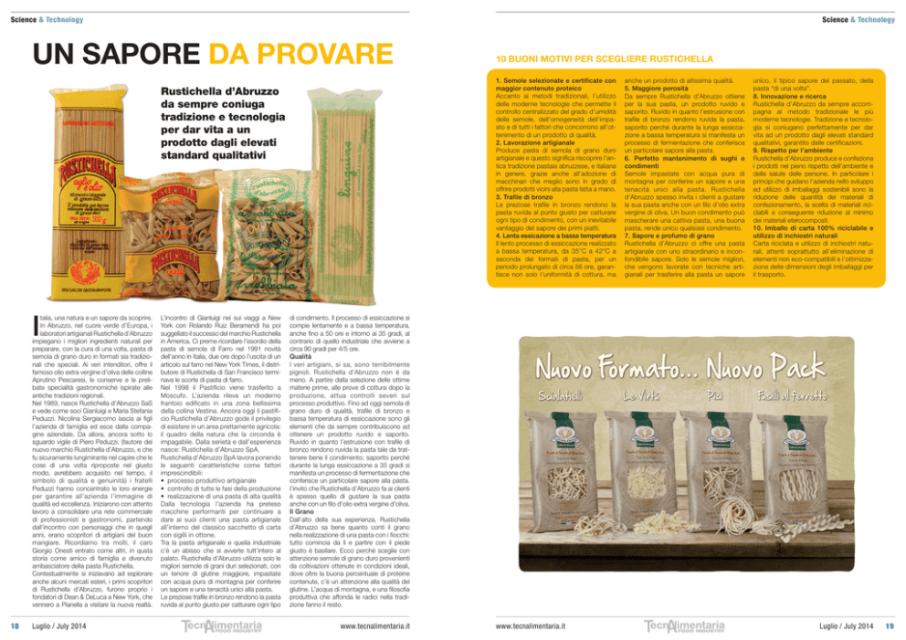 Science & Technology Science & Technology UN SAPORE DA PROVARE 1. Semole selezionate e certificate con maggior contenuto proteico Accanto ai metodi tradizionali, l’utilizzo delle moderne tecnologie che permette il controllo centralizzato del grado d’umidità delle semole, dell’omogeneità dell’impasto e di tutti i fattori che concorrono all’ottenimento di un prodotto di qualità. 2. Lavorazione artigianale Produce pasta di semola di grano duro artigianale e questo significa riscoprire l’antica tradizione pastaia abruzzese, e italiana in genere, grazie anche all’adozione di macchinari che meglio sono in grado di offrire prodotti vicini alla pasta fatta a mano. 3. Trafile di bronzo Le preziose trafile in bronzo rendono la pasta ruvida al punto giusto per catturare ogni tipo di condimento, con un inevitabile vantaggio del sapore dei primi piatti. 4. Lenta essicazione a bassa temperatura Il lento processo di essiccazione realizzato a bassa temperatura, da 35°C a 42°C a seconda dei formati di pasta, per un periodo prolungato di circa 56 ore, garantisce non solo l’uniformità di cottura, ma Rustichella d’Abruzzo da sempre coniuga tradizione e tecnologia per dar vita a un prodotto dagli elevati standard qualitativi I talia, una natura e un sapore da scoprire. In Abruzzo, nel cuore verde d’Europa, i laboratori artigianali Rustichella d’Abruzzo impiegano i migliori ingredienti naturali per preparare, con la cura di una volta, pasta di semola di grano duro in formati sia tradizionali che speciali. Ai veri intenditori, offre il famoso olio extra vergine d’oliva delle colline Aprutino Pescaresi, le conserve e le prelibate specialità gastronomiche ispirate alle antiche tradizioni regionali. Nel 1989, nasce Rustichella d’Abruzzo SaS e vede come soci Gianluigi e Maria Stefania Peduzzi. Nicolina Sergiacomo lascia ai figli l’azienda di famiglia ed esce dalla compagine aziendale. Da allora, ancora sotto lo sguardo vigile di Piero Peduzzi, (fautore del nuovo marchio Rustichella d’Abruzzo, e che fu sicuramente lungimirante nel capire che le cose di una volta riproposte nel giusto modo, avrebbero acquisito nel tempo, il simbolo di qualità e genuinità) i fratelli Peduzzi hanno concentrato le loro energie per garantire all’azienda l’immagine di qualità ed eccellenza. Iniziarono con attento lavoro a consolidare una rete commerciale di professionisti e gastronomi, partendo dall’incontro con personaggi che in quegli anni, erano scopritori di artigiani del buon mangiare. Ricordiamo tra molti, il caro Giorgio Onesti entrato come altri, in qusta storia come amico di famiglia e divenuto ambasciatore della pasta Rustichella. Contestualmente si iniziavano ad esplorare anche alcuni mercati esteri, i primi scopritori di Rustichella d’Abruzzo, furono proprio i fondatori di Dean & DeLuca a New York, che vennero a Pianella a visitare la nuova realtà. 18 Luglio / July 2014 L’incontro di Gianluigi nei sui viaggi a New York con Rolando Ruiz Beramendi ha poi suggellato il successo del marchio Rustichella in America. Ci preme ricordare l’esordio della pasta di semola di Farro nel 1991 novità dell’anno in Italia, due ore dopo l’uscita di un articolo sul farro nel New York Times, il distributore di Rustichella di San Francisco terminava le scorte di pasta di farro. Nel 1998 il Pastificio viene trasferito a Moscufo. L’azienda rileva un moderno frantoio edificato in una zona bellissima della collina Vestina. Ancora oggi il pastificio Rustichella d’Abruzzo gode il privilegio di esistere in un area prettamente agricola: il quadro della natura che la circonda è impagabile. Dalla serietà e dall’esperienza nasce: Rustichella d’Abruzzo SpA. Rustichella d’Abruzzo SpA lavora ponendo le seguenti caratteristiche come fattori imprescindibili: • processo produttivo artigianale • controllo di tutte le fasi della produzione • realizzazione di una pasta di alta qualità Dalla tecnologia l’azienda ha preteso macchine performanti per continuare a dare ai suoi clienti una pasta artigianale all’interno del classico sacchetto di carta con sigilli in ottone. Tra la pasta artigianale e quella industriale c’è un abisso che si avverte tutt’intero al palato. Rustichella d’Abruzzo utilizza solo le migliori semole di grani duri selezionati, con un tenore di glutine maggiore, impastate con acqua pura di montagna per conferire un sapore e una tenacità unici alla pasta. Le preziose trafile in bronzo rendono la pasta ruvida al punto giusto per catturare ogni tipo FOOD INDUSTRY 10 BUONI MOTIVI PER SCEGLIERE RUSTICHELLA anche un prodotto di altissima qualità. 5. Maggiore porosità Da sempre Rustichella d’Abruzzo ottiene per la sua pasta, un prodotto ruvido e saporito. Ruvido in quanto l’estrusione con trafile di bronzo rendono ruvida la pasta, saporito perché durante la lunga essiccazione a bassa temperatura si manifesta un processo di fermentazione che conferisce un particolare sapore alla pasta. 6. Perfetto mantenimento di sughi e condimenti Semole impastate con acqua pura di montagna per conferire un sapore e una tenacità unici alla pasta. Rustichella d’Abruzzo spesso invita i clienti a gustare la sua pasta anche con un filo d’olio extra vergine di oliva. Un buon condimento può mascherare una cattiva pasta, una buona pasta, rende unico qualsiasi condimento. 7. Sapore e profumo di grano Rustichella d’Abruzzo ci offre una pasta artigianale con uno straordinario e inconfondibile sapore. Solo le semole migliori, che vengono lavorate con tecniche artigianali per trasferire alla pasta un sapore unico, il tipico sapore del passato, della pasta “di una volta”. 8. Innovazione e ricerca Rustichella d’Abruzzo da sempre accompagna al metodo tradizionale le più moderne tecnologie. Tradizione e tecnologia si coniugano perfettamente per dar vita ad un prodotto dagli elevati standard qualitativi, garantito dalle certificazioni. 9. Rispetto per l’ambiente Rustichella d’Ab