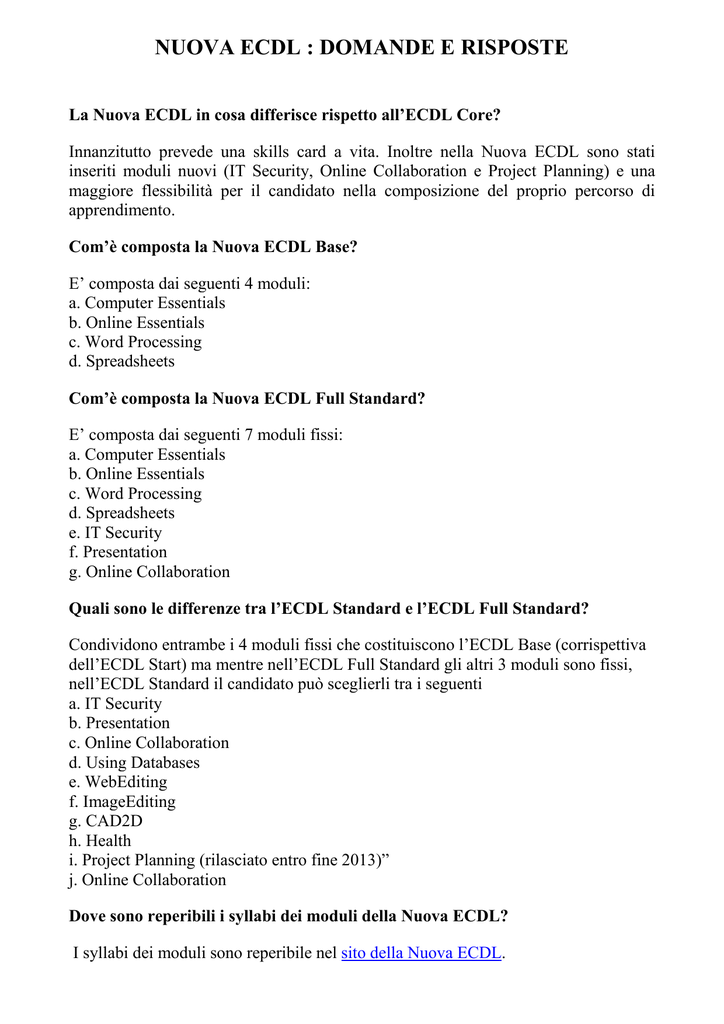 NUOVA ECDL : DOMANDE E RISPOSTE La Nuova ECDL in cosa differisce rispetto all’ECDL Core? Innanzitutto prevede una skills card a vita. Inoltre nella Nuova ECDL sono stati inseriti moduli nuovi (IT Security, Online Collaboration e Project Planning) e una maggiore flessibilità per il candidato nella composizione del proprio percorso di apprendimento. Com’è composta la Nuova ECDL Base? E’ composta dai seguenti 4 moduli: a. Computer Essentials b. Online Essentials c. Word Processing d. Spreadsheets Com’è composta la Nuova ECDL Full Standard? E’ composta dai seguenti 7 moduli fissi: a. Computer Essentials b. Online Essentials c. Word Processing d. Spreadsheets e. IT Security f. Presentation g. Online Collaboration Quali sono le differenze tra l’ECDL Standard e l’ECDL Full Standard? Condividono entrambe i 4 moduli fissi che costituiscono l’ECDL Base (corrispettiva dell’ECDL Start) ma mentre nell’ECDL Full Standard gli altri 3 moduli sono fissi, nell’ECDL Standard il candidato può sceglierli tra i seguenti a. IT Security b. Presentation c. Online Collaboration d. Using Databases e. WebEditing f. ImageEditing g. CAD2D h. Health i. Project Planning (rilasciato entro fine 2013)” j. Online Collaboration Dove sono reperibili i syllabi dei moduli della Nuova ECDL? I syllabi dei moduli sono reperibile nel sito della Nuova ECDL. Quando saranno disponibili i materiali didattici per i nuovi moduli? Diversi editori hanno già inviato ad AICA i propri materiali, che sono quindi in fase di validazione. Nel frattempo sono disponibili le Guide Rapide su AICA Shop I riconoscimenti attribuiti alla Nuova ECDL saranno gli stessi dell’ECDL Core? Premesso che i riconoscimenti non dipendono da AICA, già diverse Istituzioni hanno confermato la propria volontà di affiancare agli esistenti riconoscimenti ECDL Start ed ECDL Core le nuove versioni ECDL Base ed ECDL Full Standard. Fino a quando sarà possibile acquistare skills card ECDL Core e sostenere gli esami? I Test Center potranno vendere skills card ECDL Core fino al 31/08/2014. Dopo tale data, si potranno acquistare solo skills card della Nuova ECDL e comunque sarà garantita la possibilità di sostenere esami ECDL Core fino alla naturale scadenza delle skills card. Su quali software suite sono disponibili i moduli della Nuova ECDL? Le software suite disponibili sono: - Computer essential: WINDOWS 7 - Ubuntu 12.04 (a breve Windows XP) - Online essential: Firefox - Thunderbird 15.0.1 - IE10-Mail - IE10-Gmail - Elaborazione testi: MS OFFICE 2007 - MS OFFICE 2010 – LibreOffice 3.5 - Fogli elettronici: MS OFFICE 2007 - MS OFFICE 2010 – LibreOffice 3.5 - Data base: MS OFFICE 2007 - MS OFFICE 2010 - Strumenti di presentazione: MS OFFICE 2007 - MS OFFICE 2010 - Sicurezza IT: generica - Online collaboration: Google Suite Cos’è ECDL Profile? E’ il libretto del candidato, cioè un documento su cui sono registrati tutti gli esami sostenuti dal candidato, con il dettaglio della data, della software suite, del syllabus e della lingua con cui sono stati svolti. Il candidato dove può controllare la sua ECDL Profile? Nel nuovo portale del candidato che sarà rilasciato nell’arco del 2014. Quando posso richiedere la stampa dell’ECDL Profile che attesta gli esami superati e le certificazioni conseguite? L’ECDL Profile sarà resa disponibile, in formato PDF, sul portale del candidato nel corso del 2014. Sono già disponibili i certificati Base e Full Standard? Sì, i certificati Ecdl Base e Full Standard sono già disponibili. Gli altri certificati saranno resi disponibili a partire da gennaio 2014. Qual è il costo dei certificati? La versione PDF non ha alcun costo. Se il candidato desidera averne una versione stampata su cartoncino, potrà acquistarla a breve da AICA Shop. Se passo alla Nuova ECDL, la certificazione ECDL Core conseguita, rimane valida? Sì, rimane un titolo valido. Da quando è possibile eseguire il passaggio degli esami alla Nuova ECDL? È già possibile Voglio passare alla Nuova ECDL, cosa devo fare? • Se possiedi una skills card ECDL Core (o di altra certificazione) attiva, hai tempo fino al 31/12/2014 per recarti in un Test Center e richiedere la conversione gratuita alla Nuova ECDL • Se possiedi una skills card ECDL Core scaduta contenente esami sostenuti con il Syllabus 5.0, puoi acquistare una nuova skill card e trasferire gli esami (v. percentuali di conversione per i moduli 1, 2 e 7) • Se possiedi una skills card ECDL Core scaduta contenente esami sostenuti con Syllabi antecedenti al 5.0, il candidato può sostenere il modulo Update solo se la skills card Core contiene almeno 4 esami (superati con syllabus precedente al 5.0). In particolare, il candidato ha due opzioni: 1. Sostenere il modulo Update sulla skills card scaduta e, una volta superato, lo stesso codice di skills card può essere "gratuitamente" abilitato alla Nuova ECDL (compare il bottone “Attiva Nuova ECDL”). Potranno quindi essere convertiti i moduli (secondo le regole di conversione) sulla skills card abilitata alla Nuova ECDL e dovranno essere sostenuti i moduli mancanti al conseguimento di un certificato. Va sottolineato al candidato che il modulo Update 5.0 copre, in un’unica prova, tutti e sette moduli dell’ECDL Core. 2. Acquistare una skills card Nuova ECDL e sostenere i moduli che gli consentono di conseguire la certificazione Base o Full Standard • Se possiedi una skills card di altra certificazione scaduta, bisogna acquistare una skills card Nuova ECDL e richiedere al Test Center la conversione dei moduli superati Sarà ancora possibile passare alla Nuova ECDL dopo il 31/12/2014? Come? Si, acquistando una skill card della Nuova ECDL Ė vero che nel passaggio dalla Ecdl Core alla Nuova Ecdl posso perdere 1 o 2 esami? Nella Nuova ECDL il modulo 1 concorre a creare, insieme al modulo 2, il nuovo modulo “Computer Essential” e, insieme al modulo 7, il nuovo modulo “Online Essential”. Pertanto, la mancanza del modul