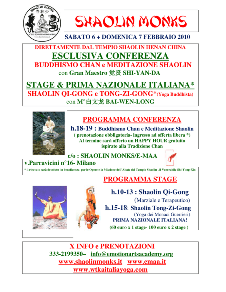 SHAOLIN MONKS SABATO 6 + DOMENICA 7 FEBBRAIO 2010 DIRETTAMENTE DAL TEMPIO SHAOLIN HENAN CHINA ESCLUSIVA CONFERENZA BUDDHISMO CHAN e MEDITAZIONE SHAOLIN con Gran Maestro 觉贤 SHI-YAN-DA STAGE & PRIMA NAZIONALE ITALIANA* SHAOLIN QI-GONG e TONG-ZI-GONG*(Yoga Buddhista) con M°白文龙 白文龙 BAI-WEN-LONG PROGRAMMA CONFERENZA h.18-19 : Buddhismo Chan e Meditazione Shaolin ( prenotazione obbligatoria- ingresso ad offerta libera *) Al termine sarà offerto un HAPPY HOUR gratuito ispirato alla Tradizione Chan c/o : SHAOLIN MONKS/E-MAA v.Parravicini n°16- Milano * il ricavato sarà devoluto in beneficenza per le Opere e la Missione dell’Abate del Tempio Shaolin , il Venerabile Shi-Yong-Xin PROGRAMMA STAGE h.10-13 : Shaolin Qi-Gong (Marziale e Terapeutico) h.15-18: Shaolin Tong-Zi-Gong (Yoga dei Monaci Guerrieri) PRIMA NAZIONALE ITALIANA! (60 euro x 1 stage- 100 euro x 2 stage ) X INFO e PRENOTAZIONI 333-2199350– [email protected] www.shaolinmonks.it www.emaa.it www.wtkaitaliayoga.com