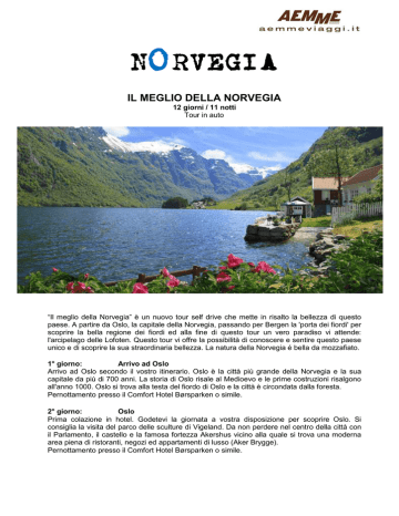 NORVEGIA IL MEGLIO DELLA NORVEGIA 12 giorni / 11 notti Tour in auto “Il meglio della Norvegia” è un nuovo tour self drive che mette in risalto la bellezza di questo paese. A partire da Oslo, la capitale della Norvegia, passando per Bergen la 'porta dei fiordi' per scoprire la bella regione dei fiordi ed alla fine di questo tour un vero paradiso vi attende: l'arcipelago delle Lofoten. Questo tour vi offre la possibilità di conoscere e sentire questo paese unico e di scoprire la sua straordinaria bellezza. La natura della Norvegia é bella da mozzafiato. 1° giorno: Arrivo ad Oslo Arrivo ad Oslo secondo il vostro itinerario. Oslo è la città più grande della Norvegia e la sua capitale da più di 700 anni. La storia di Oslo risale al Medioevo e le prime costruzioni risalgono all'anno 1000. Oslo si trova alla testa del fiordo di Oslo e la città è circondata dalla foresta. Pernottamento presso il Comfort Hotel Børsparken o simile. 2° giorno: Oslo Prima colazione in hotel. Godetevi la giornata a vostra disposizione per scoprire Oslo. Si consiglia la visita del parco delle sculture di Vigeland. Da non perdere nel centro della città con il Parlamento, il castello e la famosa fortezza Akershus vicino alla quale si trova una moderna area piena di ristoranti, negozi ed appartamenti di lusso (Aker Brygge). Pernottamento presso il Comfort Hotel Børsparken o simile. 3° giorno: Oslo – Bergen (treno) Prima colazione in hotel. Al mattino partenza da Oslo in treno. Il viaggio (ca. 6 ore) verso ovest attraversa lo spettacolare paesaggio norvegese. Questa linea ferroviaria collega le due città più importanti della Norvegia e questo viaggio in treno "sopra il tetto della Norvegia", è classificato tra i più belli al mondo, un'esperienza unica. Opzione: Se gradite potete includere un viaggio con la famosa Flåmsbana seguito da con una crociera alla scoperta del famoso Sognefjord e della ripida Stalheimskleiva raggiungendo Bergen poi in serata. Nel pomeriggio arrivo nella capitale dei fiordi: Bergen, unica città al mondo circondata da sette monti e sette fiordi. Pernottamento presso il Grand Hotel Terminus o simile. 4° giorno: Bergen Prima colazione in hotel ed a seguire godetevi la mattinata a disposizione per visitare la bellissima Bergen. Bergen offre molte attrazioni e luoghi d'interesse – tra i più importanti il quartiere anseatico Bryggen, la funicolare Fløibanen, Troldhaugen ed il mercato del pesce e dei fiori. Pernottamento presso il Grand Hotel Terminus o simile. 5° giorno: Bergen – Sogndal – crociera sul Nærøyfjord (ca. 230 km) Prima colazione in hotel, prima di ritirare il vostro veicolo a noleggio (non incluso). Attraverserete la regione Hordaland passando per Voss e per la strada Stalheim che vi offrirà una vista straordinaria sulla stretta valle Nærøy e le montagne circostanti. Al vostro arrivo a Flåm partirete per un’escursione in gommone lungo l’Aurlandsfjord, un braccio del fiordo più lungo e più profondo, il Sognefjord, conosciuto come il “re dei fiordi”. Dopo questa escursione di circa due ore procedete fino a Sogndal, attraversando il Sognefjord con un traghetto (non incluso) tra Fodnes e Mannheller. Pernottamento presso il Hofslund Fjordhotel (o simile) – in camera con vista fiordo. 6° giorno: Sogndal – Bøverdal (ca. 140 km) Prima colazione in hotel. Oggi continuerete il viaggio in direzione nord-est lungo il parco nazionale di Jostedal che comprende il ghiacciaio più grande del continente europeo. Il ghiacciaio Jostedalsbreen copre quasi la metà del parco nazionale. Si consiglia una visita al ghiacciaio Nigardsbreen che fa parte del Jostedal Glacier National Park (escursione da prenotare in anticipo). Percorrerete in seguito una stupenda strada: la Sognefjellet Mountain Road che si trova in alto nelle montagne dello Jotunheimen e corre tra il Sognefjord e la valle di Gudbrandsdalen. Durante in tragitto godrete di panorami mozzafiato. Cena e pernottamento in un hotel di charme in montagna, Elveseter Hotel o simile. 7° giorno: Bøverdal – Ålesund - crociera sul Geirangerfjord (ca. 212 km) Prima colazione in hotel. Partenza da Bøverdal in direzione di Lom dove potrete ammirare una delle poche Stavkirke (chiese in legno) rimaste in Norvegia (ingresso non incluso) prima di arrivare nello splendido villaggio di Geiranger. Il fiordo di Geiranger, le cascate e le maestose montagne di straordinaria bellezza hanno fatto di questa località una delle mete turistiche più visitate in Norvegia. Godetevi un’escursione in barca (ca. 1 ora) sul Geirangerfjord e rilassatevi in questa località idillica. Continuate verso nord in direzione di Ålesund, la vostra destinazione finale. Traversata in traghetto Eisdal – Linge (non inclusa). Pernottamento presso il Quality Hotel Waterfront o simile. 8° giorno: Ålesund – Trondheim (ca. 355 km) Prima colazione in hotel. Mattinata libera per scoprire la città di Ålesund che è stata completamente distrutta da un devastante incendio nel 1904 e nuovamente ricostruita in stile Art Nouveau, rendendola una città davvero unica in Europa. Il centro città si rivela una vivace scena urbana grazie ai ristoranti e caffè ed al pittoresco canale Brosundet con le sue barche da pesca. La bellezza della città può essere apprezzata dal Monte Aksla dove godrete di una vista mozzafiato della città, delle sue montagne, isole e fiordi. Dopo la visita della città riprendete il vostro viaggio attraverso il parco nazionale Dovrefjell oppure potrete scegliere di guidare sulla famosissima “strada dell’Atlantico” prendendo due traghetti (non inclusi). Arrivo a Trondheim in serata. Pernottamento presso lo Scandic Hotel Solsiden o simile. 9° giorno: Trondheim – Isole Lofoten (con volo oppure Hurtigruten con 1 notte a bordo - non inclusi) Prima colazione in hotel. A Trondheim si consiglia una visita alla Cattedrale di Nidaros in stile romanico e gotico che divenne la chiesa di incoronazione dei Re norvegesi a p