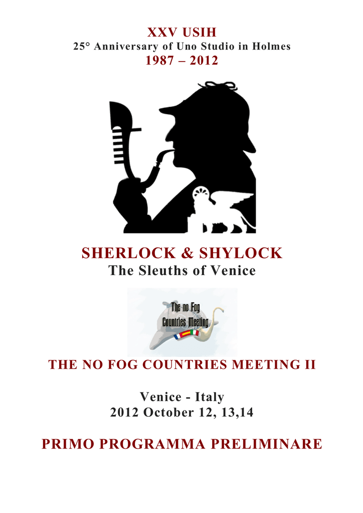 XXV USIH 25° Anniversary of Uno Studio in Holmes 1987 – 2012 SHERLOCK & SHYLOCK The Sleuths of Venice THE NO FOG COUNTRIES MEETING II Venice - Italy 2012 October 12, 13,14 PRIMO PROGRAMMA PRELIMINARE Venerdì 12 ottobre Ore 15.00 Benvenuto e prima camminata in città nei luoghi segreti di Venezia, scortati da Toby-Ivo Lombardo Evento gratuito, non necessaria prenotazione Ore 18.00 Concerto per due violini ed Holmes Evento gratuito, necessaria prenotazione Ore 20.00 Cena Sociale Costo 30 euro, necessaria prenotazione Sabato 13 ottobre Ore 9.00-13.00 Conferenze sul tema: L'agente letterario in Italia Ore 15.00 A caccia dei segreti di Venezia Divisi in squadre di 4 persone, cercando indizi nelle piazze e nelle chiese. Costo 10 euro, necessaria prenotazione Ore 18.00 Assemblea di USIH Evento riservato ai soci Ore 20.00 In gita sulle barche storiche sui canali a caccia di Tonga Costo 20 euro, necessaria prenotazione Domenica 14 ottobre Ore 9.00-13.00 Conferenze Pomeriggio Gita vetrerie al seguito di Toby-Ivo lombardo, o in alternativa visita all’Hotel Danieli per celebrare il soggiorno dell'Agente Letterario Allo studio la possibilità di partite di golf e ulteriori divertimenti comuni. ALBERGHI Ogni partecipante prenoterà per proprio conto la sistemazione alberghiera, dando notizia a Gianluca ed Enrico della partecipazione. Consigliamo di decidere e prenotare IMMEDIATAMENTE l'albergo. Venezia è città affollatissima, e vi si svolgono continuamente eventi. In ottobre è prevista la Biennale di Architettura, che richiama migliaia di persone. Per facilitare la vostra prenotazione vi indichiamo alcune possibilità: • Un buon numero di camere sia in alberghi economici che di lusso (per quanti di voi desiderano regalarsi un week end speciale) è stato bloccato dai nostri amici dell'agenzia che ci aiutò a Firenze, la Baiana: [email protected] 055-2631507 . Potete rivolgervi a loro e chiedere di trovare qualcosa di adatto alle vostre esigenze. • Se amate fare da soli Vi consigliamo: http://booking.com Sappiamo tutti che siamo abituati a organizzarci all'ultimo momento. QUESTA VOLTA NON SI PUO' .....o si rischia di rimanere a terra a mangiarsi le mani.