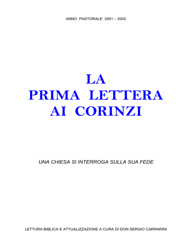 ANNO PASTORALE 2001 – 2002 LA PRIMA LETTERA AI CORINZI UNA CHIESA SI INTERROGA SULLA SUA FEDE LETTURA BIBLICA E ATTUALIZZAZIONE A CURA DI DON SERGIO CARRARINI INTRODUZIONE GENERALE Continuiamo in questo nuovo anno pastorale l’approfondimento biblico sulla missione della Chiesa agli inizi del terzo millennio, iniziato l’anno scorso con la lettura del libro degli Atti degli Apostoli. Attraverso il racconto di Luca abbiamo visto il grande lavoro di evangelizzazione compiuto dalla prima generazione cristiana, negli anni dal 30 al 60 d.C., nelle grandi città dell’impero romano e lungo le principali vie di comunicazione. Abbiamo anche visto il progressivo espandersi della parola di Dio da Gerusalemme alla Giudea, alla Samaria, all’Asia minore, all’Europa, fino a Roma, capitale dell’impero e simbolo di tutti i popoli allora conosciuti. Questo cammino di evangelizzazione parte dagli ebrei e, attraverso gli ellenisti, raggiunge i pagani, fino alla fondazione di Chiese formate quasi interamente da pagani. Questo passaggio ai pagani – molto contrastato – è opera soprattutto di Paolo, neoconvertito e apostolo infaticabile. L’accoglienza della fede da parte dei pagani e la formazione di comunità miste (ebrei e pagani) ha comportato ben presto il problema di tradurre le esigenze della fede nella cultura e nelle tradizioni di vita dei vari popoli, superando le forme religiose dell’ebraismo nel quale era nata. Questo lavoro di inculturazione della fede nel mondo pagano, iniziato da Barnaba e Paolo, con un’intuizione missionaria fortemente voluta dallo Spirito Santo, ha suscitato molte difficoltà con i credenti di origine ebraica, ma anche molti problemi all’interno della cultura e del modo di vivere pagano. Questo lavoro sarà proseguito dalla terza e quarta generazione cristiana e poi dai Padri della Chiesa e dai grandi Vescovi d’Oriente e d’Occidente. La Prima Lettera ai Corinzi è uno specchio ed un esempio concreto (anche se limitato e parziale) di questo impegno di Paolo per tradurre le esigenze della fede nella cultura greca, o almeno nei problemi posti dalla vivacissima e un po’ sgangherata comunità cristiana di Corinto. Attraverso la lettura di questa Lettera potremo cogliere il grande sforzo fatto dai primi missionari del Vangelo per renderlo un messaggio comprensibile dai loro ascoltatori e capace di trasformare la mentalità e cambiare la loro vita. Cercheremo di attualizzare la lettura di questa Lettera in rapporto alla situazione delle nostre Chiese, chiamate, all’inizio del terzo millennio, a rievangelizzare la nostra società occidentale sempre più secolarizzata. Siamo chiamati ad annunciare il Vangelo, e a concretizzarne le scelte conseguenti, in un contesto sociale in rapida evoluzione e caratterizzato dalla presenza di più culture che si sovrappongono e si contrastano tra di loro. Su tutte, comunque, si sta imponendo una cultura tecnico-scientifica e mercantile, che sembra prevalere e scardinare tutte le altre in un fenomeno di globalizzazione che coinvolge tutte le tradizioni, le culture, gli stili di vita, le identità dei popoli e delle religioni. La nostra Chiesa veronese si prepara a celebrare un Sinodo per interrogarsi sulla sua vita e sul suo ruolo in questa società in rapido cambiamento. La “Verona fedele”, conservatrice e missionaria, attenta agli ultimi e attaccata al suo benessere, violenta e solidale, tradizionale e ricca di fermenti nuovi, come sta guardando e preparando il suo futuro? Cosa è essenziale e da valorizzare della sua tradizione e cosa invece è marginale e da superare? Quali nuove esigenze stanno emergendo? Come valorizzare il cammino di rinnovamento di questi ultimi decenni? Quali nuovi ruoli, ministeri, potenzialità a servizio della nuova evangelizzazione e inculturazione della fede? Leggendo la Prima Lettera ai Corinzi non cercheremo la soluzione ai nostri problemi, delle ricette già pronte nella parola di Dio, ma cercheremo di cogliere uno stile di Chiesa nell’affrontare i problemi ed i valori di fondo ai quali ispirare le soluzioni concrete che lo Spirito Santo ispirerà anche alla nostra Chiesa perché risponda alla missione che le ha affidato. 2 L’APOSTOLO PAOLO E LA COMUNITA’ DI CORINTO Prima di entrare nel vivo della Lettera ai Corinzi, ci ricolleghiamo al racconto degli Atti degli Apostoli e alla nascita di questa comunità, durante il secondo viaggio missionario di Paolo. La nascita della comunità di Corinto (Atti 18,1-18) Siamo negli anni 49-50 d.C., durante il secondo viaggio missionario, quello che ha portato Paolo e Luca a sbarcare in Europa. Dopo la fondazione delle Chiese della Macedonia e l’insuccesso di Atene (con il discorso nell’Areopago e gli scherni dei saccenti Ateniesi), Paolo arriva a Corinto, cosmopolita città di mare, dove si ferma un anno e mezzo. E’ ospite di una coppia di artigiani (piccoli industriali come si direbbe oggi) e lavora a fabbricare tende e coperte per l’esercito romano. Corinto era un’antichissima città-stato greca, situata sull’istmo che separa il mare Egeo dal mar Ionio, ed era formata da due porti (Cencre e Lecheo), collegati tra loro da una via lastricata, lungo la quale venivano trascinate le merci per ricaricarle poi nell’altro porto su altre navi. La sua posizione geografica la rendeva una città di commerci, ricca e cosmopolita, malfamata e gaudente. Quella in cui arriva Paolo nel 50 d.C. è la “Nuova Corinto”, rifondata da Giulio Cesare nel 44 a.C. La vecchia Corinto era stata distrutta dai romani nel 146 a.C. perché aveva capeggiato la rivolta contro di loro. Nuova Corinto è la capitale della provincia romana dell’Acaia; è diventata la città più importante e ricca della Grecia con più di 500.000 abitanti. Sede dell’amministrazione romana e di fiorenti commerci, attirava immigrati da ogni regione dell’Asia. In essa dominava un’élite di dignitari e commercianti ricchissimi, sostenuta da una fiorente classe artigianale,