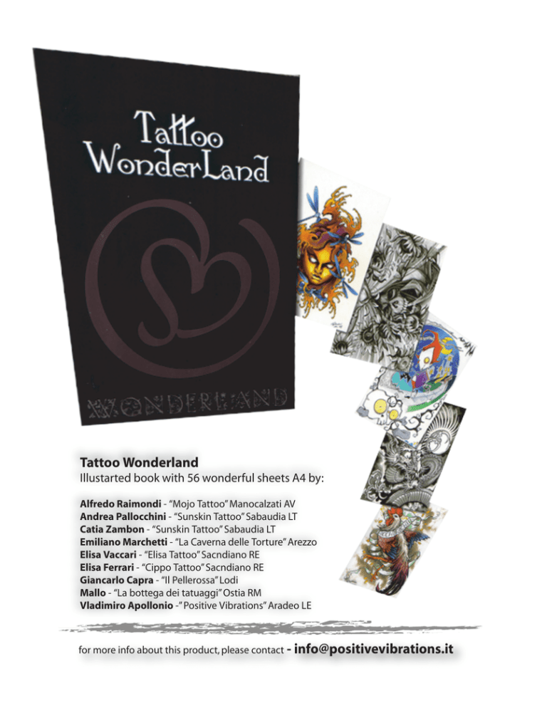 Tattoo Wonderland Illustarted book with 56 wonderful sheets A4 by: Alfredo Raimondi - “Mojo Tattoo” Manocalzati AV Andrea Pallocchini - “Sunskin Tattoo” Sabaudia LT Catia Zambon - “Sunskin Tattoo” Sabaudia LT Emiliano Marchetti - “La Caverna delle Torture” Arezzo Elisa Vaccari - “Elisa Tattoo” Sacndiano RE Elisa Ferrari - “Cippo Tattoo” Sacndiano RE Giancarlo Capra - “Il Pellerossa” Lodi Mallo - “La bottega dei tatuaggi” Ostia RM Vladimiro Apollonio -” Positive Vibrations” Aradeo LE for more info about this product, please contact - [email protected]