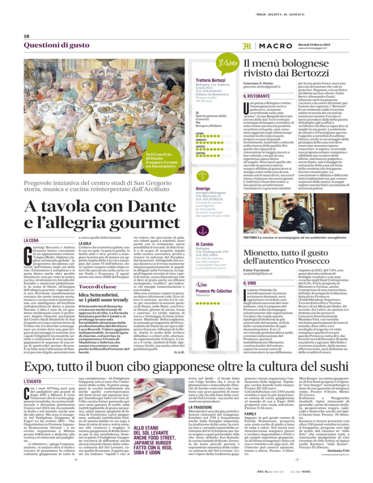 -MSGR - 20 CITTA - 16 - 24/03/15-N: 16 Questioni di gusto Martedì 24 Marzo 2015 www.ilmessaggero.it Trattoria Bertozzi Bologna, via Andrea Costa 84/2 Tel. 051.6141425 Chiuso la domenica Prezzo medio: 30-40 euro Sì Spirito gioioso della trattoria No Sempre affollato Nel Convivio di Dante il sapere è come un buon piatto Pregevole iniziativa del centro studi di San Gregorio storia, musica e cucina reinterpretate dall’Arciliuto A tavola con Dante e l’allegria gourmet LA CENA ianluigi Beccaria e Andrea Graziosi hanno raccontato in un appassionato volume, "Lingua Madre. Italiano e inglese nel mondo globale", la progressiva decadenza culturale dell'italiano negli usi della rete. Il fenomeno è complesso e si porta dietro anche altre perdite identitarie: una per tutte la nostra cucina, strattonata tra Arcadie del Presidio e meticciati globalizzanti. In nome di Dante, all'insegna dell'allegria gourmet, risponde così una divertente manifestazione romana che mette insieme storia, musica e cucina antica reinterpretata con intelligenza all'Arciliuto ([email protected]) dietro a piazza Navona. L'idea è nata da un gaudente intellettuale come il professore Angelo Chiaretti, presidente del Centro Studi Danteschi di San Gregorio in Conca nel territorio di Urbino che si è divertito a immaginare un evento dove una gaia brigata di personaggi in costume (tra i quali l'Alighieri) tra musiche antiche e recitazione di versi accompagnassero le sequenze di una cena di quattordici portate diverse. È un fatto noto l'attenzione di Dante al peccato di gola, accostato non G a caso a quello della lussuria. LA GOLA Cerbero che tormenta i golosi, con le sue tre gole, la pancia gonfia, la barba unta e atra, pronto a mangiare la terra pur di saziare un appetito implacabile è la vera immagine del canto VI dell'Inferno, dove i golosi vengono subito dopo coloro che peccarono nella carne come Paolo e Francesca. E ugualmente nel canto XXIII del Purgato- Tocco di classe Idea Settembrini, se i piatti sono trendy Il Settembrini di Roma ha creato un modo trendy di approccio al cibo. La formula funziona perché è totale e si prolunga in una sala formidabile dominata dalla professionalita del direttore Luca Boccoli. Valore aggiunto indispensabile, la sua brigata di charme, col sorriso, la competenza e l'ironia di Madeleine e Sabrina che sanno raccontare come poche la filosofia frizzante del locale. rio coloro che peccarono di gola, ora ridotti quasi a scheletri, sono puniti con la tentazione, senza possibilità di toccarli, di dolci frutti e di acqua di sorgente seguiti nella cornice successiva, pronti a trovare la salvezza del Paradiso, dai lussuriosi. Attingendo dal corpus dantesco si trovano numerose citazioni gastronomiche: le anguille affogate nella Vernaccia, la zuppa di legumi corretta al vino, i petti di starne, senza dimenticare che si deve al poeta anche un efficace neologismo, "scuffare", per indicare chi mangia rumorosamente e con avidità. Alla cena romana i sapori si portano dietro riferimenti colti. Ecco allora il castrone, servito tra le carni, per ricordare la tenzone poetica di Dante, nelle Rime, con Forese Donati, ghiotto di starne, lonza e castrone. Le cialde ripiene di zucca e formaggio di fossa richiamano Madonna Bellaccoglienza, la sensuale protagonista del Fiore, tradotto da Dante da un'opera allegorica francese, il Roman de la Rose. Anche la scelta delle verdure obbedisce a criteri colti, alternando sapientemente il bianco, il rosso e il verde, simboli di Fede, Speranza e Carità, ma anche colori dei gonfaloni guelfi. G.A.D. CUCINA: 6666666333 AMBIENTE: 6666666633 SERVIZIO: 6666666633 CANTINA: 6666666333 Amerigo Il menù bolognese rivisto dai Bertozzi Giacomo A. Dente [email protected] IL RISTORANTE no pensa a Bologna e subito l'immaginazione corre a goderecce, artusiane scorribande nella città "grassa", in una Bengodi dove più ancora delle due Torri svettano montagne di lasagne e tortellini. Il mito resiste ancora nei prodotti, un settore nel quale, anzi, sono stati raggiunti negli ultimi tempi risultati molto interessanti, proprio a causa di grandi investimenti, materiali e culturali, nella ricerca della qualità. Per quello che riguarda la ristorazione si viaggia ancora a due velocità, con più di una esperienza opaca dietro all'angolo. Non è però quello che succede in questa trattoria sempre affollata di golosi dove si mangia come nella casa di una nonna con le mani d'oro, ma con il ritmo e il piacere dei nostri giorni. L'indirizzo è fuori dal centro, a due passi da un laboratorio rinomato tra i gourmet cittadini U per la sua pasta fresca, ma è una piccola deviazione che vale la pena fare. Regnano, con un fisico da Obelix sui loro clienti, Fabio Berti e Alessandro Gozzi, talmente uniti da passione cucinari a da essere diventati, per fusione dei cognomi, i "Bertozzi". In un ambiente caldo troverete subito in tavola dei ciccioli da stuzzicare mentre l'occhio si lascia prendere dalla bella parata di bottiglie agli scaffali a certificare che Bacco saprà fare al meglio la sua parte. La selezione di salumi e il Parmigiano aprono l'appetito a tortellini di sublime fattura, anche se un assaggio della gramigna della casa non deve essere per nessuna ragione trascurato. A seguire, scorrendo una proposta sempre compatta e affidabile per numero delle offerte, meritano le polpette e, ancor di più, vale l'assaggio la variazione della casa sul tema della cotoletta alla bolognese, davvero stuzzicante. La conclusione è affidata a differenti dolci tradizionali ma, per restare ai piaceri della nonna, la zuppa inglese suscita felici cucchiaiate di memoria golosa. Savigno (Bologna) Via Marconi 14 Tel. 051.6708326 Grande la cucina e avvolgente la sensazione di essere coccolati dai sapori di una volta TRATTORIA La cucina si accompagna ad un ambiente accogliente Al Cambio Bologna Via Stalingrado 150 Tel. 051.32811 Lo chef ha talento, ma non sempre i suoi piatti riescono a convocare il cuore Mionetto, tutto i