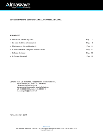 DOCUMENTAZIONE CONTENUTA NELLA CARTELLA STAMPA ALMAWAVE • Leader nel settore Big Data Pag. 1 • Le aree di attività e le soluzioni Pag. 3 • Monitoraggio dei social network Pag. 8 • L’Amministratore Delegato: Valeria Sandei Pag. 9 • Scheda di sintesi Pag. 10 • Il Gruppo AlmavivA Pag. 11 Contatti: Ilaria De Bernardis, Responsabile Media Relations, tel. 06.3993.4142, mob. 342.9849109, [email protected] Mariagrazia Scaringella, Media Relations, tel. 06.3993.3566, mob. 340.8455510, [email protected] Roma, dicembre 2014 Almawave Via di Casal Boccone, 188-190 - 00137 Roma - tel.+39 06 39931 - fax +39 06 3993 5775 www.almawave.it 1 ALMAWAVE Leader nel settore Big Data Big Data e innovazione tecnologica Almawave è uno dei principali player italiani a vocazione internazionale nel settore Big Data ed è la società di innovazione tecnologica del Gruppo Almaviva, gruppo italiano leader nel settore dell’Information & Communication Technology. Almawave nasce come start-up nel 2008 con l’obiettivo di proporre al mercato idee e soluzioni innovative, facili da usare, unendo visione di business e competenza tecnologica. Tecnologia semantico-ontologica Le soluzioni proposte dalla Società si caratterizzano per la capacità di gestire e analizzare grandi moli di dati, attraverso il proprio motore semantico-ontologico, estraendone le informazioni più significative per i propri clienti. In Almawave lavorano risorse con background e skills diversi: dall’approfondita conoscenza dei processi di business e delle soluzioni IT dei clienti, fino alle più avanzate tecnologie semantico-ontologiche. 14 milioni di euro di fatturato Lo sviluppo della società è testimoniato da un valore del fatturato che è cresciuto dai 4,5 milioni di euro del 2008 ai circa 11 milioni di euro del 2012, ai 14 milioni del 2013. ALMAWAVE Evoluzione del fatturato 15 20* 14 12 11 9 11 11 6 Ricerca e Sviluppo L’attenzione allo sviluppo e all’innovazione trova inoltre riscontro negli investimenti in R&D, che nel periodo 2008-2013 sono stati pari a circa 15 milioni di euro. 4 ,5 3 0 Almawave inoltre collabora con diverse università e con partner scientifici e tecnologici leader di mercato, tra cui: Oracle, IBM, Microsoft, Tibco, Microstrategy. Almawave Via di Casal Boccone, 188-190 - 00137 Roma - tel.+39 06 39931 - fax +39 06 3993 5775 www.almawave.it 2 Presenza globale Almawave si caratterizza per il forte impulso all’internazionalizzazione e una presenza globale: opera in Italia e all’estero, in particolare in Brasile. Almawave apre a San Francisco Nel giugno 2014 è stata inoltre aperta a San Francisco la nuova società Almawave USA Inc., subsidiary americana di Almawave, con l’obiettivo di portare nella Silicon Valley i prodotti e i servizi con tecnologia Made in Italy in area customer experience. I clienti Tra i principali clienti, Almawave annovera in Italia numerosi Ministeri e Amministrazioni Pubbliche, oltre a grandi gruppi e società private di grandi dimensioni presenti in diversi settori: telco, utilities, media, trasportation, banking, automotive. In Brasile Almawave lavora per le principali società di tlc e nei settori finanziario, automotive, media e entertainment. 194 persone Almawave impiega complessivamente 194 persone nelle sue 4 sedi in Italia (Roma, Milano, Trento e Firenze) e nelle 2 sedi in Brasile (São Paulo e Belo Horizonte), caratterizzate da un’età media molto bassa e pari a 34 anni. Le figure professionali di Almawave si caratterizzano per un elevato livello di specializzazione e per l’eterogeneità dei profili di competenze, che combinano percorsi di formazione tanto tecnologica quanto umanistica: oltre ai laureati in ingegneria, informatica, matematica e fisica, c’è infatti una rilevante presenza di laureati in lettere e filosofia e di specialisti della linguistica e comunicazione. I riconoscimenti internazionali Almawave è stata inclusa per la prima volta nella lista dei 10 più importanti operatori mondiali all’interno della Guida pubblicata nel 2014 da Gartner Group sul segmento dello Speech Analytics con la sua soluzione Iride Voice. Almawave è l’unica società italiana a comparire nella Guida. Almawave Via di Casal Boccone, 188-190 - 00137 Roma - tel.+39 06 39931 - fax +39 06 3993 5775 www.almawave.it 3 ALMAWAVE Le aree di attività e le soluzioni La mission di Almawave ALMAWAVE Le sedi Almawave governa le tecnologie sottostanti agli attuali driver di cambiamento: mobile, social, cloud e big data, proponendo soluzioni applicative “people centered”. Attraverso specifici Innovation Labs e Center of Excellence, offre soluzioni mirate ad ottenere maggiore qualità ed efficienza nei processi di Customer Interaction e Knowledge Management. Obiettivo di Almawave è rendere l’innovazione concreta, generare idee che si traducano rapidamente in soluzioni semplici ed intuitive, in grado di potenziare le capacità di esprimersi, creare, elaborare ed interagire di ogni individuo, proponendo un modello unico di “shared intelligence”. Il posizionamento competitivo In un contesto in cui i grandi competitor internazionali (Amdocs, Oracle) hanno le quote di mercato più alte con piattaforme già consolidate (PeopleSoft, Clarify, Siebel), l’offerta di Almawave si posiziona come particolarmente innovativa grazie a: • la capacità di interagire su più piattaforme e di ottenere e unire le informazioni e i dati da tutti i tipi di interazioni con clienti e database aziendali; • la tecnologia semantica per estrarre le informazioni chiave e i dati da interazioni scritte e orali; • la capacità di analizzare il sentiment dell’interazione e di catturarne aspetti inattesi; • l’offerta di un sistema dinamico di Business Intelligence in real-time per analizzare le informazioni e grandi moli di dati; • processi automatizzati ed efficienti, con interfaccia in linguaggio naturale per clienti, operatori e dipendenti; • una formazione dell’operatore più mirata ed 