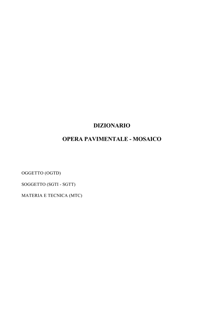 DIZIONARIO OPERA PAVIMENTALE - MOSAICO OGGETTO (OGTD) SOGGETTO (SGTI - SGTT) MATERIA E TECNICA (MTC) DIZIONARIO OGGETTO (OGTD) LISTA DEI LEMMI OGTD: opera pavimentale DIZIONARIO SOGGETTO (SGTI - SGTT) LISTA DEI LEMMI SGTI: Acheloo SGTI: Africa SGTI: Afrodite (vedi Venere) SGTI: Ambrosia SGTI: Amorino (vedi Erote) SGTI: Andromeda SGTI: Anfiteatro (vedi venatio, vedi anche venator) SGTI: Anfitrite SGTI: Animali SGTT: protomi di SGTT: torsi di SGTI: Annus SGTT: con cornucopia SGTT: busto semipanneggiato di SGTI: Apollo SGTI: Arianna SGTI: Ares (vedi Marte) SGTI: Arione SGTT: semipanneggiato SGTI: Artemide (vedi Diana) SGTI: Asaraton SGTI: Asia SGTI: Atleti SGTT: busti di SGTI: Atteone SGTT: volto riflesso nell'acqua di SGTI: Attore SGTI: Attributi di Apollo SGTI: Attributi di Dioniso SGTI: Auriga SGTT: come fanciullo SGTI: Autunno (vedi Stagioni) SGTT: busto di SGTT: busto alato di SGTT: figura intera di SGTT: come leopardo SGTT: come erote SGTI: Bacco (vedi Dioniso) SGTI: Barca SGTI: Biga\ Quadriga SGTI: Caccia\ Grande\ Piccola SGTI: Cacciatore (vedi anche Venator) SGTI: Calculator SGTI: Calendario (vedi Mesi) SGTI: Calliope (vedi Muse) SGTT: busto di SGTI: Cariti (vedi Grazie) SGTI: Centauro SGTI: Cigno SGTI: Ciparisso SGTI: Circo SGTI: Cisiari SGTI: Clio (vedi Muse) SGTT: con manoscritto SGTT: busto con dittico nero di SGTI: Contesa tra Apollo e Marsia SGTI: Dafne SGTT: figura intera di SGTI: Diana SGTT: a cavallo di un cervo SGTT: simulacro di Diana Efesina SGTI: Dioniso (vedi anche Iniziazione di e Trionfo di) SGTI: Dioscuri SGTI: Edipo SGTI: Egitto SGTT: busta stante con sistro SGTI: Elle SGTI: Endimione SGTI: Erato (vedi Muse) SGTT: busto di SGTI: Eracleia (vedi anche Ercole) SGTI: Ercole (vedi anche Eracleia, Trionfo di) SGTT: con skyphos SGTT: con balteon a tracolla SGTT: barbato non coronato con arco SGTT: semisdraiato coronato di edera con skyphos SGTI: Eros SGTT: con ali di uccello e cestello di fiori in mano SGTI: Erote SGTT: senza ali SGTT: vestito SGTI: Estate (vedi Stagioni) SGTT: busto di SGTT: busto alato di SGTT: figura intera di SGTT: figura intera alata di SGTT: come leone SGTT: come erote SGTI: Europa (vedi ratto di Europa) SGTI: Euterpe (vedi Muse) SGTI: Fanciulli\ Fanciulle SGTI: Faro SGTI: Fenice SGTI: Frisso SGTI: Frisso ed Elle (vedi singole voci) SGTI: Ganimede SGTT: con tirso SGTT: stante SGTT: con cintura, mantello e lancia SGTI: Gemelli (vedi Romolo e Remo) SGTI: Giganti SGTT: anguipedi SGTI: Gladiatore SGTI: Gorgone SGTT: con due grandi ali sulla testa SGTI: Grazie SGTI: Grifone SGTI: Ifigenia SGTI: Imene SGTI: Immolatio boum SGTI: India SGTI: Iniziazione di Dioniso (vedi anche Dioniso) SGTT: su tigre SGTT: su leone SGTT: su leopardo SGTI: Inverno (vedi Stagioni) SGTT: busto femminile di SGTT: busto femminile alato di SGTT: figura femminile intera di SGTT: figura maschile di SGTT: come cinghiale SGTI: Leda SGTT: semisdraiata senza armillae SGTT: semisdraiata sovrastata da cigno SGTI: Leda e il Cigno (vedi Leda) SGTI: Leone SGTT: protome di SGTT: tronco di SGTI: Licurgo SGTT: semiinginocchiato SGTT: con gambe avvinte dalla vite che nasce da Ambrosia SGTI: Licurgo e Ambrosia (vedi Licurgo) SGTI: Lotta fra animali SGTI: Lupa SGTI: Marsia (vedi anche Supplizio di e Contesa tra Apollo e Marsia) SGTI: Marte SGTI: Maschera SGTI: Mauretania SGTI: Melpomene (vedi Muse) SGTT: con leontè SGTT: busto di SGTI: Mensor SGTI: Mercurio SGTT: con sacca in mano SGTT: con rabdos SGTI: Mesi SGTI: Minerva SGTT: senza scudo SGTT: busto di SGTI: Mitra (vedi anche Simbologia mitriaca) SGTI: Moggio SGTI: Mostro marino SGTI: Muse SGTI: Medusa (vedi Gorgone) SGTI: Natura morta (vedi Asaraton e Xenia) SGTI: Nave SGTI: Nereidi SGTI: Nettuno (vedi anche Trionfo) SGTT: simulacro su capitello di SGTI: Nilo (vedi anche Paesaggio nilotico) SGTI: Oceano SGTT: con barba ornata di teste di delfino SGTT: senza chele SGTT: con ali SGTT: senza code di delfino SGTT: figura intera di SGTI: Olimpo SGTI: Oreste SGTI: Orfeo SGTT: senza copricapo frigio SGTT: semipanneggiato SGTI: Paesaggio nilotico (vedi anche Nilo) SGTI: Pan SGTT: con pedum SGTT: busto di SGTI: Pavone SGTI: Pesca ( vedi Vita Quotidiana) SGTI: Pescatore SGTT: vestito SGTI: Pesci SGTI: Pigmei SGTT: con cappello SGTI: Plutone (vedi Ratto di Proserpina) SGTI: Polimnia (vedi Muse) SGTT: busto di SGTI: Polifemo SGTI: Porto SGTI: Poseidone (vedi Nettuno) SGTI: Primavera (vedi Stagioni) SGTT: busto di SGTT: busto alato di SGTT: figura intera stante di SGTT: figura intera stante alata di SGTT: figura maschile di SGTT: come toro SGTT: come erote SGTI: Prometeo SGTI: Proserpina (vedi Ratto di ) SGTI: Psyche SGTT: con strumento musicale SGTI: Ratto di Europa SGTI: Ratto di Proserpina SGTI: Rea Silvia SGTI: Roma SGTI: Romolo e Remo SGTI: Rutellum SGTI: Sacerdote (vedi Vittimarius) SGTI: Sacrificio (vedi Immolatio boum e v.anche Vittimarius) SGTI: Saturno SGTT: coronato SGTI: Scilla SGTI: Selene SGTT: in volo SGTT: busto nimbato di SGTI: Sfinge SGTI: Sicilia SGTT: figura intera di SGTT: busto di SGTI: Sileno SGTT: nudo SGTI: Silvano SGTI: Simbologia mitriaca SGTI: Sirene SGTT: con coda SGTT: senza ali SGTI: Sole SGTI: Spagna SGTT: figura intera vestita di SGTI: Stagioni SGTI: Supplizio di Marsia (vedi anche Marsia) SGTI: Talia (vedi Muse) SGTT: busto di SGTI: Telamone SGTI: Tersicore (vedi Muse) SGTT: busto di SGTI: Tigre SGTT: protome di SGTT: torso di SGTI: Toro SGTT: protome di SGTT: torso di SGTT: anguipede SGTI: Trionfo di Dioniso (vedi anche Dioniso) SGTT: con Vittoria alata sul carro SGTT: con Arianna e Vittoria alata sul carro SGTT: con Arianna sul carro SGTI: Trionfo di Ercole (vedi anche Ercole) SGTI: Trionfo di Nettuno (vedi anche Nettuno) SGTT: nimbato SGTI: Tritone SGTT: con nebris SGTI: Ulisse SGTI: Urania (vedi Muse) SGTT: busto di SGTI: Venatio SGTI: Venator SGTI: Venere SGTT: seduta SGTT: sdraiata SGTT: con specchio in mano nell’atto di coprirsi SGTI: Venti SGTT: che soffiano SGTT: busti di SGTI: Vita quotidiana SGTI: Vittimarius 