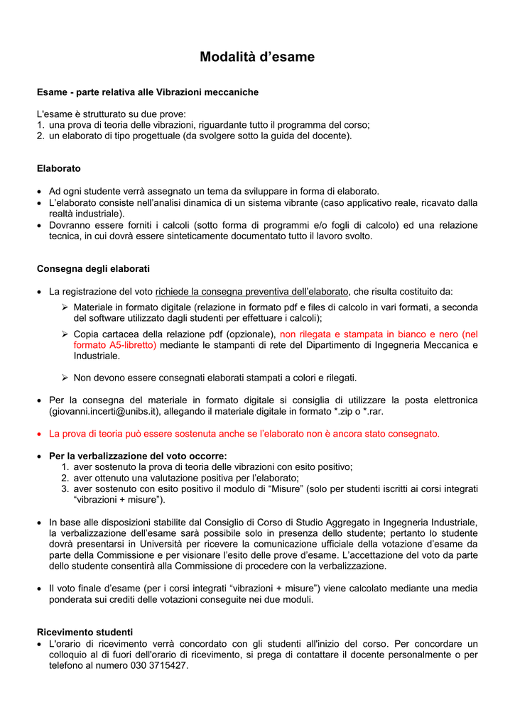 Modalità d’esame Esame - parte relativa alle Vibrazioni meccaniche L'esame è strutturato su due prove: 1. una prova di teoria delle vibrazioni, riguardante tutto il programma del corso; 2. un elaborato di tipo progettuale (da svolgere sotto la guida del docente). Elaborato Ad ogni studente verrà assegnato un tema da sviluppare in forma di elaborato. L’elaborato consiste nell’analisi dinamica di un sistema vibrante (caso applicativo reale, ricavato dalla realtà industriale). Dovranno essere forniti i calcoli (sotto forma di programmi e/o fogli di calcolo) ed una relazione tecnica, in cui dovrà essere sinteticamente documentato tutto il lavoro svolto. Consegna degli elaborati La registrazione del voto richiede la consegna preventiva dell’elaborato, che risulta costituito da: Materiale in formato digitale (relazione in formato pdf e files di calcolo in vari formati, a seconda del software utilizzato dagli studenti per effettuare i calcoli); Copia cartacea della relazione pdf (opzionale), non rilegata e stampata in bianco e nero (nel formato A5-libretto) mediante le stampanti di rete del Dipartimento di Ingegneria Meccanica e Industriale. Non devono essere consegnati elaborati stampati a colori e rilegati. Per la consegna del materiale in formato digitale si consiglia di utilizzare la posta elettronica ([email protected]), allegando il materiale digitale in formato *.zip o *.rar. La prova di teoria può essere sostenuta anche se l’elaborato non è ancora stato consegnato. Per la verbalizzazione del voto occorre: 1. aver sostenuto la prova di teoria delle vibrazioni con esito positivo; 2. aver ottenuto una valutazione positiva per l’elaborato; 3. aver sostenuto con esito positivo il modulo di “Misure” (solo per studenti iscritti ai corsi integrati “vibrazioni + misure”). In base alle disposizioni stabilite dal Consiglio di Corso di Studio Aggregato in Ingegneria Industriale, la verbalizzazione dell’esame sarà possibile solo in presenza dello studente; pertanto lo studente dovrà presentarsi in Università per ricevere la comunicazione ufficiale della votazione d’esame da parte della Commissione e per visionare l’esito delle prove d’esame. L’accettazione del voto da parte dello studente consentirà alla Commissione di procedere con la verbalizzazione. Il voto finale d’esame (per i corsi integrati “vibrazioni + misure”) viene calcolato mediante una media ponderata sui crediti delle votazioni conseguite nei due moduli. Ricevimento studenti L'orario di ricevimento verrà concordato con gli studenti all'inizio del corso. Per concordare un colloquio al di fuori dell'orario di ricevimento, si prega di contattare il docente personalmente o per telefono al numero 030 3715427. Indicazioni per la stesura dell’elaborato 1. Evitare il “copia-incolla” delle equazioni dai fogli di calcolo. 2. Evitare di dedicare tempo eccessivo alla realizzazione dei disegni schematici (si possono anche realizzare a mano e digitalizzare mediante scanner). 3. Evitare di inserire nella relazione disegni in tre dimensioni o fotografie (non sono necessari). 4. Evitare di inserire parti descrittive ridondanti (tratte da testi, dispense didattiche, siti web, ecc.), ma limitarsi esclusivamente alla spiegazione del lavoro svolto. 5. Se alla relazione vengono aggiunti alcuni allegati (fogli di calcolo, tabelle, ecc.), evitare di stamparli e fornirli esclusivamente in formato elettronico. 6. Prestare particolare cura ai grafici (leggibilità, unità di misura sugli assi). 7. Usare sempre le unità di misura del Sistema Internazionale per i calcoli numerici. 8. Verificare la qualità dei grafici, quando si effettua la conversione della relazione in formato pdf. 9. Per gli utenti di Microsoft Word, scrivere le equazioni con l’apposito strumento (Equation editor) e verificare che vengano visualizzate correttamente quando vengono convertite in pdf e stampate. 10. Nella stesura della relazione utilizzare il linguaggio della comunicazione tecnico-scientifica, evitando di riportare dettagli non necessari (ad es. passaggi matematici banali o dettagli legati alla sintassi di particolari comandi relativi al software di calcolo utilizzato). 11. Numerare sempre equazioni, figure e tabelle per effettuare correttamente i riferimenti nel testo. Se possibile utilizzare i comandi di numerazione automatica del “word processor”, in modo da evitare l’inserimento manuale della numerazione. 12. Non inserire figure e grafici troppo grandi (aumentano inutilmente il numero di pagine). 13. Raggruppare i grafici in pagine separate per ottimizzare la stampa. 14. Non utilizzare margini troppo grandi e spaziature troppo ampie fra le righe. 15. Rileggere la relazione, prima di consegnarla. 16. Verificare che le equazioni abbiano tutte le stesse proporzioni. 17. Prestare attenzione ai simboli matematici, che devono essere utilizzati correttamente. 18. Per quanto riguarda le derivate temporali, attenersi alla notazione standard dei testi di Meccanica; ad esempio: