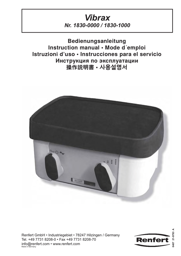 9LEUD[ 1U 5HQIHUW*PE+,QGXVWULHJHELHW+LO]LQJHQ*HUPDQ\ 7HO)D[ LQIR#UHQIHUWFRPZZZUHQIHUWFRP 0DGHLQ*HUPDQ\ $ #FEJFOVOHTBOMFJUVOH *OTUSVDUJPONBOVBMݯ.PEFEtFNQMPJ *TUSV[JPOJEݦVTP*ݯOTUSVDDJPOFTQBSBFMTFSWJDJP ̵͚͕͍͍͕͕͗ͣͬ͛ͪ͗ͣ͘͟͜͜͟͞͝͠͞͠ ⓥུ䫄☦✐ݯ瑪穧瓢湃瓚 Vibrax Nr. 1830-0000 / 1830-1000 ITALIANO Introduzione Da utilizzarsi solo in ambienti chiusi. Grazie di aver deciso di acquistare un vibratore Renfert Vibrax. Questo apparecchio pone un nuovo standard in fatto di funzionalità, prestazione ed ergonomia. Prima di aprire l’apparecchio, scollegarlo dalla rete di alimentazione estraendo la spina. Si prega di leggere attentamente queste istruzioni per l’uso e di osservare le avvertenze in esse contenute; in questo modo si garantisce una lunga durata e un funzionamento regolare dell’apparecchio. Simboli Nel presente manuale e sull’apparecchio si trovano dei simboli che hanno il significato seguente: Pericolo Pericolo immediato di lesioni. Tensione elettrica Pericolo derivante dalla tensione elettrica. Attenzione In caso di inosservanza sussiste il pericolo di danneggiare l’apparecchio. Nota Fornisce un'informazione utile per l'azionamento e per semplificare l'uso dell'apparecchio. Utensile incluso. Osservare le istruzioni per l’uso. Ulteriori simboli vengono spiegati nel corso del manuale. Avvertenze per il gestore È necessario istruire gli operatori dell'apparecchio sulla base di questo manuale riguardo al campo d'impiego, ai possibili pericoli durante l'uso e all'utilizzo del Vibrax. Conservare questo manuale in modo che sia sempre disponibile per l’operatore. Ulteriori avvertenze si trovano nel capitolo „Avvisi per il gestore“ alla fine di questo manuale. Istruzioni per l’uso 1. Installazione e messa in funzione 1.1 Installazione Per l’installazione, scegliere una superficie stabile adatta al peso del Vibrax. Si consiglia di installare il Vibrax su un piano massiccio e pesante. Si prega di installare l‘apparecchio in modo da poter accedere facilmente alla presa di corrente elettrica. 1.2 Applicazione del piano in gomma Prima di poter iniziare a lavorare con il Vibrax, è necessario fissare il piano in gomma fornito in dotazione sul tavolo vibrante. Nel far ciò, assicurarsi che il piano in gomma sia innestato saldamente sotto al bordo del tavolo vibrante lungo il suo perimetro completo (fig. 6). Fare attenzione che la scanalatura del ripiano in gomma venga correttamente inserita in posizione sotto al piano oscillante, lungo il perimetro completo (fig. 6). 1.3 Collegamento elettrico Prima di mettere in funzione l’apparecchio, assicurarsi che il valore di tensione riportato sulla targhetta dell’apparecchio corrisponda a quello dell’alimentazione di tensione disponibile in loco. • Mettere l’interruttore (A) in posizione verticale (OFF/spento) (Fig. 1). • Connettere il cavo di rete alla presa per l‘allacciamento elettrico (D) (Fig. 2). • Eseguire il collegamento cavo di rete / presa. Il Vibrax è ora pronto all’uso. 2. Uso 2.1 Elementi di comando Vedi figure 1 e 2. (A) Interruttore di accensione (ON) e impostazione del tipo di oscillazione forte/dolce (B) Commutatore intensità di vibrazione (C) Piano in gomma (D) Presa per allacciamento alla rete (E) Fusibile 2.2 Impiego Vedi figura 4. Il vibratore Vibrax si accende e si spegne tramite l’interruttore (A). Con l’accensione, si selezione anche il comando dell’oscillatore. Posizioni dell’interruttore: AUS (spento) ON, oscillazione a impulsi dolci ON, oscillazione a impulsi forti Grazie ai 4 livelli di potenza del commutatore e alle 2 forme di vibrazione a disposizione, è possibile adattare in modo ottimale l’intensità di vibrazione ai materiali da trattare. È possibile modificare la posizione del commutatore del livello di intensità (B) senza dover prima spegnere il Vibrax. Suggerimento: Finché non siete ancora pratici della macchina, vi consigliamo di impostare il commutatore al livello più basso prima di accendere il Vibrax. 3. Pulizia / Manutenzione Il Vibrax non necessita di manutenzione. 3.1 Pulizia del piano in gomma Un piano in gomma imbrattato può essere asportato e pulito facilmente: • Togliere il piano in gomma (fig. 5). • Pulire il piano in gomma con l’acqua e asciugarlo quindi con un panno. • Se necessario, applicare sul piano della vaselina o dello spray al silicone. • Riapplicare il piano in gomma. Fare attenzione che la scanalatura del ripiano in gomma venga correttamente inserita in posizione sotto al piano oscillante, lungo il perimetro completo (fig. 6). Suggerimento: Vi consigliamo di trattare regolarmente il piano in gomma con della vaselina o dello spray al silicone al fine di prolungarne la durata e di facilitare la rimozione dei materiali induriti. 3.2 Pulizia della struttura esterna Prima di eseguire la pulizia del corpo dell’apparecchio scollegare la spina dalla presa di corrente! Non pulire mai la macchina sotto l’acqua corrente e non immergerla mai nell’acqua. Per la pulizia, NON utilizzare dei prodotti a base di solventi. Pulire il corpo esterno con un panno umido. Per la pulizia del corpo esterno è possibile smontare le leve di comando: • Prendere la chiave per viti ad esagono cavo dal supporto nella leva di comando (Fig. 3) • Allentare la vite di fissaggio (Fig. 7). • Sfilare la leva di comando (Fig. 8). • Pulire il corpo esterno con un panno umido. • Reinserire la leva di comando. • Riavvitare la vite di fissaggio (Fig. 9). • Inserire nuovamente la chiave per viti ad esagono cavo nel supporto della leva. 3.3 Cambio del fusibile Prima di cambiare il fusibile, scollegare la spina dalla presa di corrente. Per cambiare il fusibile, utilizzare solamente dei fusibili che corrispondano ai dati riportati nel capitolo „Dati tecnici“. Non utilizzare mai dei fusibili con dei valori superiori. Il portafusibili (E) si trova sul retro dell’apparecchio vicino alla presa per il cavo di rete (Fig. 2). • S
