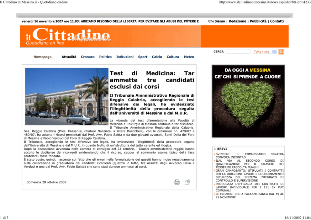 Il Cittadino di Messina.it - Quotidiano on-line http://www.ilcittadinodimessina.it/news.asp?idz=8&idn=4233 venerdì 16 novembre 2007 ore 11.03: ABBIAMO BISOGNO DELLA LIBERTA' PER EVITARE GLI ABUSI DEL POTERE E ABBIAMO Chi Siamo BISOGNO | Redazione DELLO STATO | Pubblicità PER EVITARE | Contatti GLI ABUSI DELLA LIBER CERCA Homepage Attualità Cronaca Politica Istituzioni Sport Calcio Cultura Tutto il sito Meteo Test di Medicina: Tar ammette tre candidati esclusi dai corsi Il Tribunale Amministrativo Regionale di Reggio Calabria, accogliendo le tesi difensive dei legali, ha evidenziato l’illegittimità della procedura seguita dall’Università di Messina e dal M.U.R. La vicenda dei test d’ammissione alla Facoltà di Medicina e Chirurgia di Messina continua a far discutere. Il Tribunale Amministrativo Regionale della Calabria, Sez. Reggio Calabria (Pres. Passanisi, relatore Nunziata, a latere Burzichelli), con le ordinanze nn. 479/07 e 480/07, ha accolto i ricorsi presentati dal Prof. Avv. Fabio Saitta e da due giovani avvocati, Santi Delia del Foro di Messina e Paolo Verduci del Foro di Reggio Calabria. Il Tribunale, accogliendo le tesi difensive dei legali, ha evidenziato l’illegittimità della procedura seguita dall’Università di Messina e dal M.U.R. in quanto frutto di un’istruttoria del tutto carente ed illogica. Dopo la discussione avvenuta nella camera di consiglio del 24 ottobre, i Giudici amministrativi reggini hanno accolto le doglianze dei ricorrenti evidenziando che il ricorso, seppur al sommario esame tipico della fase cautelare, fosse fondato. È stato posto, quindi, l’accento sul fatto che gli errori nella formulazione dei quesiti hanno inciso negativamente sulla collocazione in graduatoria dei candidati ricorrenti (quattro in tutto, tre assistiti dagli Avvocati Delia e Verduci e una dal Prof. Avv. Fabio Saitta) che sono stati dunque ammessi ai corsi. domenica 28 ottobre 2007 1 di 3 BREVI SVINCOLI: IL COMMISSARIO SINATRA CONVOCA INCONTRO ILAL VIA AL SECONDO CORSO DI QUALIFICAZIONE PER IL RILASCIO DEI TESSERINI RACCOLTA FUNGHI GRAN CAMPOSANTO: STIPULATI I CONTRATTI PER LA DIREZIONE LAVORI E COORDINAMENTO SICUREZZA DEL SISTEMA INTEGRATO DI CONTROLLO E SUPERVISIONE PROROGATA L'EFFICACIA DEI CONTRATTI DI LAVORO INDIVIDUALE PER I 111 EX PUC COMUNALI LE ELEZIONI RSU A PALAZZO ZANCA DAL 19 AL 22 NOVEMBRE 16/11/2007 11.04 Il Cittadino di Messina.it - Quotidiano on-line http://www.ilcittadinodimessina.it/news.asp?idz=8&idn=4233 Protestano in religioso silenzio i precari per le attività cimiteriali GIOVEDI 15 PRESENTAZIONE A PALAZZO ZANCA DEL VOLUME “ANNALI DELLA CITTA' DI MESSINA” Altre In corso davanti la Prefettura, la protesta dei precari della cooperativa “Agrinova 2000” di Messina operatori per le attività cimiteriali, che da sei anni lavorano ad orario ridotto a venti ore setti... Continua No alla violenza negli stadi, sì al rilancio del turismo sportivo Domani alle 9.00, al Cinetetaro Rosso di S. Secondo di Capo D'Orlando, il secondo appuntamento della camapgna di sensibilizzazione 'Contro la violenza negli stadi per il rilancio del turismo sportivo' Si svolgerà domani, alle 9, al Cineteatro "Rosso di S. Secondo" di Capo d'Orlando, la seconda tappa della campagna di sensibilizzazione "Contro la violenza negli stadi per il rilancio del turismo spo... Continua I Giovani messinesi incontrano Jean Leonard Touadi, assessore alle politiche giovanili del Comune di Roma. Faccia a faccia con l'amministratore di colore e uomo di fiducia di Veltroni I giovani sono da sempre la speranza per cambiare il mondo, ma devono essere messi in condizione di farlo. Le politiche giovanili di ogni comune dovrebbero essere all’avanguardia per far sviluppare l... Continua Prelievo di pazienza Ancora forti le proteste degli analisti nei confronti dell’Assessore Regionale alla Sanità La galla, accusato di appoggiare il decreto “Bindi meno 20%” Continua e si fa sempre più duro il braccio di ferro tra laboratori di analisi e servizio Sanitario regionale. Da ieri infatti le strutture pre-accreditate hanno cessato di erogare prestazioni agli u... Continua 2 di 3 16/11/2007 11.04 Il Cittadino di Messina.it - Quotidiano on-line http://www.ilcittadinodimessina.it/news.asp?idz=8&idn=4233 Piovono buone notizie La regione proclama lo stato di calamità naturale per la zona ionica Ben più attesa e voluta delle violente piogge abbattutesi nell’ultima settimana sul territorio messinese, è arrivata questa mattina l’ufficializzazione dello stato di calamità naturale, per le zone d... Continua Anche all'Amam aperto il rubinetto delle dimissioni Lettere di dimissioni da parte di quattro consiglieri della società. Prime dichiarazioni del presidente Domenico Battaglia Sono quattro i consiglieri d’amministrazione dell’Amam che stamattina hanno rassegnato le loro dimissioni. La notizia, data dal presidente dell’azienda municipalizzata Domenico Battaglia, arriverà in ... Continua Homepage Chi Siamo | Redazione | Pubblicità | Contatti © 2006 Tutti i diritti sono riservati Testata giornalistica on-line d'informazione, registrazione al Tribunale di Messina n. 12/2002 - PI 02680760838 Direttore Editoriale: Lillo Zaffino, Direttore Responsabile: Carmelo Arena. 3 di 3 16/11/2007 11.04