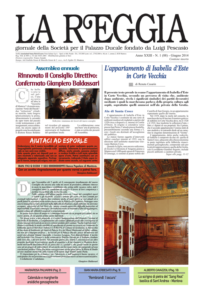 giornale della Società per il Palazzo Ducale fondato da Luigi Pescasio Tariffa Associazioni Senza Fini di Lucro: Poste Italiane S.p.A. - Sped. in Abb. Postale - D.L. 353/2003 (conv. in L. 27/02/2004 n. 46) art. 1, comma 2, DCB Mantova Reg. Trib. di MN n. 372 del 30.01.2001 - Distribuzione gratuita ai Soci Direttore responsabile: Franco Amadei Stampa: Arti Grafiche Grassi di Marcello Grassi & C. s.n.c., via S. Egidio 22, Mantova Assemblea annuale Rinnovato il Consiglio Direttivo: Confermato Gianpiero Baldassari C he bello vedere sul palco, l’una accanto all’altra, la “Gazzetta di Mantova” e la nostra associazione “Amici del Ducale”: due “istituzioni” cittadine storiche, tanto longeve (pluricentenaria la prima, ultracentenaria la seconda) da saper trarre dal passato vivide testimonianze e utili insegnamenti, senza celebrazioni, ma ancora capaci di progetti come ha sottolineato il direttore Renzo Boldrini Anno XXIII - N. 1 (88) - Giugno 2014 Contiene inserto L’appartamento di Isabella d’Este in Corte Vecchia di Renata Casarin Il presente testo prende in esame l’appartamento di Isabella d’Este in Corte Vecchia, secondo un percorso di visita che, ambiente dopo ambiente, rivela i significati simbolici dei partiti decorativi mediante i quali la marchesana parlava della propria cultura agli ospiti, soprattutto quelli ammessi nell’ala privata della Grotta. Ala di Santa Croce Nella foto: istantanea dei lavori del nuovo consiglio nel ricordare gli appuntamenti del prossimo 350° anniversario di fondazione del quotidiano locale. La collaborazione, come una buon’ aria di primavera, è stata avvertita dai presenti all’Assemblea. “Aiutaci ad Esporle Evidenziamo che il nostro incredibile ed ineguagliabile patrimonio culturale nulla vale se non sarà reso visibile. Tutto quanto giace nei depositi può essere mostrato e valorizzato solo con un adeguato apparato espositivo. Purtroppo le risorse, sempre più esigue, non con- sentono di poter realizzare quanto auspicabile. Solamente le sponsorizzazioni diffuse, anche piccole, possono aiutarci a rendere fruibile a tutti tante splendide opere d’arte. Potrai contribuire con un versamento, indicando il titolo sopra indicato come causale, sul seguente conto: L’appartamento di Isabella d’Este in Corte Vecchia è costituito da una serie di ambienti medioevali riadattati a partire dal 1520 circa e disposti a L intorno al Cortile d’Onore. In origine si estendeva verso piazza San Pietro, l’attuale piazza Sordello, presumibilmente secondo una forma a T, con i locali ora destinati all’accoglienza del pubblico. Le stanze furono oggetto d’interventi edilizi conclusi intorno al 1522, con la direzione dell’architetto mantovano Giovanni Battista Covo. Quando la figlia, non ancora sedicenne, di Ercole I e Eleonora d’Aragona giunse a Mantova nel 1490 quale sposa di Francesco II Gonzaga, si sistemò al piano nobile del Castello di San Giorgio, in un appartamento soprastante quello del marito. Nel 1519, dopo la morte del consorte, la marchesa decise di lasciare il maniero gotico e di stabilirsi in Corte Vecchia dove, tra il 1520 e il 1522, fece trasferire le collezioni d’arte, i libri e i dipinti di sua proprietà. Sia il primo, che il secondo appartamento l’estense dotò di uno studiolo e in entrambi diede ad un camerino la singolare denominazione di “Grotta”. L’appartamento, detto anche vedovile, di Isabella è composto da due ali: quella di Santa Croce, adiacente alla chiesa omonima in parte inglobata nelle fabbriche rinascimentali gonzaghesche, comprende sale per lo più di rappresentanza; quella della Grotta, con il cosiddetto Giardino Segreto, include piccoli ambienti a carattere privato. Segue alle pagg. 11-12 IBAN: IT43 Q 05204 11503 000000000993 Banca Popolare di Mantova. Con un sentito ringraziamento per quanto vorrai o potrai fare. Gianpiero Baldassari D opo l’assemblea del 5 aprile ed il conseguente insediamento del nuovo Consiglio che ancora una volta mi onoro di presiedere, abbiamo rimesso in moto la macchina e confidiamo che, prima delle vacanze estive, tutti i consiglieri siano in condizione di svolgere il lavoro di loro competenza e portino nuova linfa alla nostra Società. Nella colonna dell’ultima pagina troverete i nomi dei consiglieri nuovi o rieletti e gli incarichi assunti e potrete già avere con loro contatti per eventuali informazioni. A questo fine contiamo anche di poter aprire ai soci attuali ed a quelli futuri la segreteria nella nostra nuova sede in Palazzo del Capitano. Purtroppo sono emersi intoppi burocratici derivanti dalla difficoltà di eliminare, dagli ambienti che dovremo occupare, sottoservizi di Enti Terzi che stanno creando parecchie difficoltà impreviste ed imprevedibili. Vi assicuro comunque che nulla lasceremo di intentato al fine di raggiungere, quanto prima, gli obbiettivi auspicati e programmati. In questo breve lasso di tempo si è comunque lavorato sia su progetti precedenti, sia su nuove ipotesi, di cui quanto prima sarete informati. Nei giorni scorsi, a tale proposito, si è svolta l’inaugurazione dell’Oratorio Cavriani di Sacchetta di Sustinente, a completamento dei restauri effettuati grazie alla convergenza di alcune sinergie derivanti da un lavoro comune guidato dal Comitato “Sacha Caprianorum”. Hanno contribuito in modo sensibile al reperimento di quanto necessario per restaurare la bellissima opera il Marchese Federico CAVRIANI, il Comune di Sustinente, la Parrocchia di Sacchetta di Sustinente, gli Amici di Palazzo Te e dei Musei Mantovani ed infine - ultima, ma non per l’impegno profuso -, �la Società per il Palazzo Ducale, grazie all’interesse dei nostri due delegati Gianni Guastalla e Lorenzo Lasagna. Non dimentichiamo il merito dell’architetto Lisa Veronesi e della restauratrice Patrizia Garutti per il brillante risultato delle loro idee e del loro lavoro. Nei prossimi giorni, poi, andrà a concretizzarsi un altro progetto, ipotizzato i