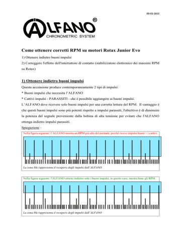 09-03-2015 Come ottenere corretti RPM su motori Rotax Junior Evo 1) Ottenere indietro buoni impulsi 2) Correggere l'effetto dell'interruttore di contatto (stabilizzatore elettronico dei massimi RPM su Rotax) 1) Ottenere indietro buoni impulsi Questa accensione produce contemporaneamente 2 tipi di impulsi: * Buoni impulsi che necessita l’ALFANO * Cattivi impulsi - PARASSITI - che è possibile aggiungere ai buoni impulsi. L’ALFANO deve ricevere solo buoni impulsi per una corretta lettura del RPM. Il vantaggio è che questi buoni impulsi sono più potenti rispetto a impulsi parassiti, l'obiettivo è di diminuire la potenza del segnale proveniente dalla bobina di alta tensione per evitare che l'ALFANO ottenga indietro impulsi parassiti. Spiegazione : Nella figura seguente: l’ALFANO mostra un RPM più alto del normale, perché riceve impulsi buoni + i cattivi. La zona blu rappresenta il recupero degli impulsi dall’ALFANO Nella figura seguente: l'ALFANO ottiene indietro solo i buoni impulsi, in questo caso, mostra bene gli RPM. La zona blu rappresenta il recupero degli impulsi dall’ALFANO Per risolvere questo problema, dobbiamo installare correttamente il cavo RPM e quando è necessario, di modificare questo cavo per ridurre ancora il segnale. A) L'installazione del cavo RPM sul filo candela alta tensione: è indispensabile seguire rigorosamente questo metodo perché una cattiva installazione, come descritto di seguito, aumenta dal 300 al 500% il segnale. Corretta installazione Figura 1 Figura 2 Installazione non corretta, l’ALFANO riceve troppo segnale, dal 300 al 500% in più Figura 3 Figura 4 B) Se ancora incontriamo aumenti anomali degli RPM dopo aver eseguito il punto A, è indispensabile poi modificare il cavo RPM per diminuire ancora la forza del segnale. Figura 5 Tagliare il cavo sul punto sopra indicato (figura 5), poi sovrapporre 2 pezzi di cavo e fissarli con 3 fascette come su (figura 6) di seguito, è molto importante che entrambi i cavi sono sovrapposti bene tra di loro, con una fascetta ogni due centimetri. Figura 6 - È quindi necessario effettuare prove perché la distanza di sovrapposizione dei due fili deve essere regolata individualmente. - Se c’è troppo segnale, l'RPM è troppo alto, quindi diminuire la distanza di sovrapposizione - Se non riceve abbastanza segnale l’RPM è troppo basso, quindi aumentare la distanza di sovrapposizione E 'probabile che la distanza di sovrapposizione sia diversa da un kart all'altro poiché dipende dalla tolleranza di fabbricazione dell’accensione Rotax e sulla sensibilità dell’ALFANO che può variare da un sistema all'altro. Sul PRO III EVO, se il cavo RPM è ben installato come descritto sopra (Figura 1 o 2), generalmente, non ha bisogno di altri interventi, quindi utilizzare il cavo RPM così com'è. Nel caso il problema persiste, iniziare con una sovrapposizione da 15 centimetri. Su M4GPS / M10 (modelli più sensibili) iniziare con una sovrapposizione di +/-3 cm. 2) Correggere l'effetto dell'interruttore di contatto L'accensione del Rotax Junior Evo è pilotata elettricamente e divide a due impulsi quando il motore raggiunge il regime massimo (15000 rpm), questo per stabilizzare la velocità del motore (l'interruttore di contatto è in azione). Quando l'interruttore di contatto è in funzione, l’ALFANO misura ad alta velocità la metà del numero di giri. Infatti, l'ALFANO rileva un impulso su due. Esempio : il motore gira a 15010 rpm, l’ALFANO mostra 7505 rpm. Per contrastare questo problema, abbiamo migliorato il nostro firmware in modo che l'ALFANO è in grado di rilevare quando gli impulsi diminuiscono rapidamente a metà, e in questo caso, per rendere l’ALFANO moltiplica per due impulsi ricevuti e mostra quindi la velocità di rotazione corretta del motore. Nel nuovo menu RPM, ci sarà un ulteriore opzione per attivare questa funzione. Scarica l’ultima versione di firmware dal website : alfano.com