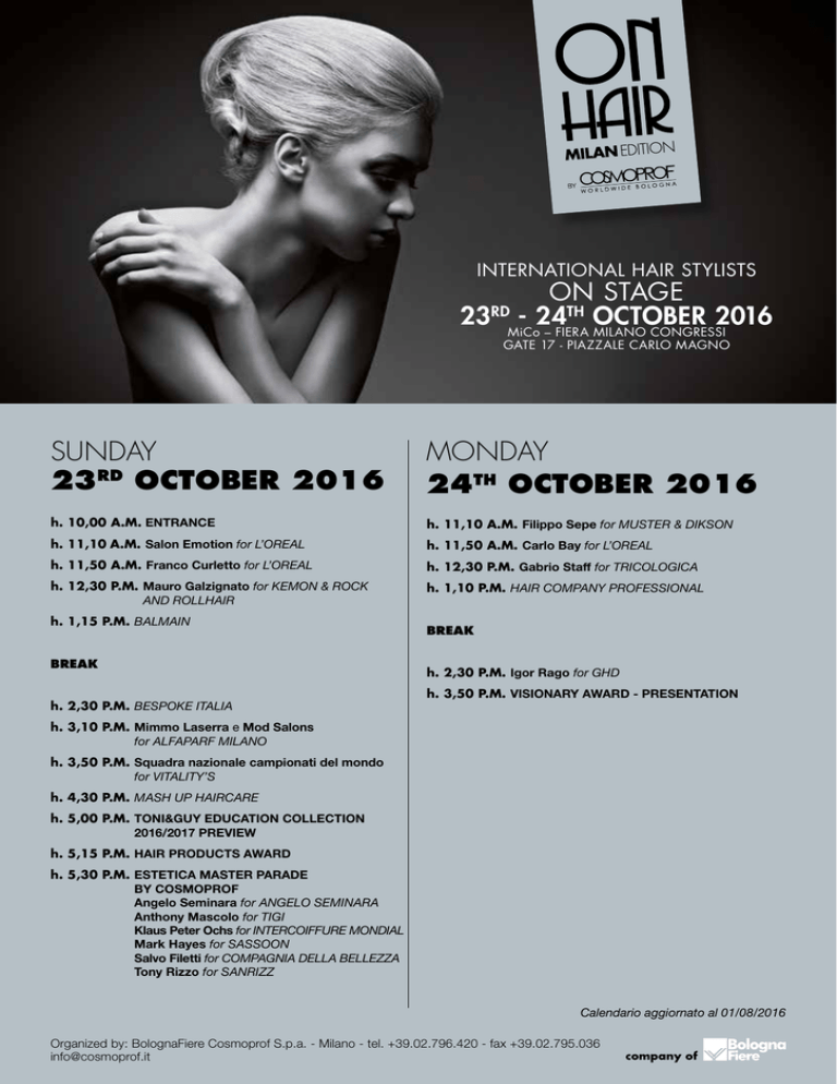 INTERNATIONAL HAIR STYLISTS ON STAGE TH 23 MiCo - 24 OCTOBER 2016 – FIERA MILANO CONGRESSI RD GATE 17 - PIAZZALE CARLO MAGNO SUNDAY 23RD OCTOBER 2016 MONDAY 24TH OCTOBER 2016 h. 10,00 A.M. ENTRANCE h. 11,10 A.M. Filippo Sepe for MUSTER & DIKSON h. 11,10 A.M. Salon Emotion for L’OREAL h. 11,50 A.M. Carlo Bay for L’OREAL h. 11,50 A.M. Franco Curletto for L’OREAL h. 12,30 P.M. Gabrio Staff for TRICOLOGICA h. 12,30 P.M. M auro Galzignato for KEMON & ROCK AND ROLLHAIR h. 1,10 P.M. HAIR COMPANY PROFESSIONAL h. 1,15 P.M. B ALMAIN BREAK h. 2,30 P.M. B ESPOKE ITALIA BREAK h. 2,30 P.M. Igor Rago for GHD h. 3,50 P.M. VISIONARY AWARD - PRESENTATION h. 3,10 P.M. M immo Laserra e Mod Salons for ALFAPARF MILANO h. 3,50 P.M. S quadra nazionale campionati del mondo for VITALITY’S h. 4,30 P.M. M ASH UP HAIRCARE h. 5,00 P.M. T ONI&GUY EDUCATION COLLECTION 2016/2017 PREVIEW h. 5,15 P.M. H AIR PRODUCTS AWARD h. 5,30 P.M. E STETICA MASTER PARADE BY COSMOPROF Angelo Seminara for ANGELO SEMINARA Anthony Mascolo for TIGI Klaus Peter Ochs for INTERCOIFFURE MONDIAL Mark Hayes for SASSOON Salvo Filetti for COMPAGNIA DELLA BELLEZZA Tony Rizzo for SANRIZZ Calendario aggiornato al 01/08/2016 Organized by: BolognaFiere Cosmoprof S.p.a. - Milano - tel. +39.02.796.420 - fax +39.02.795.036 [email protected]
