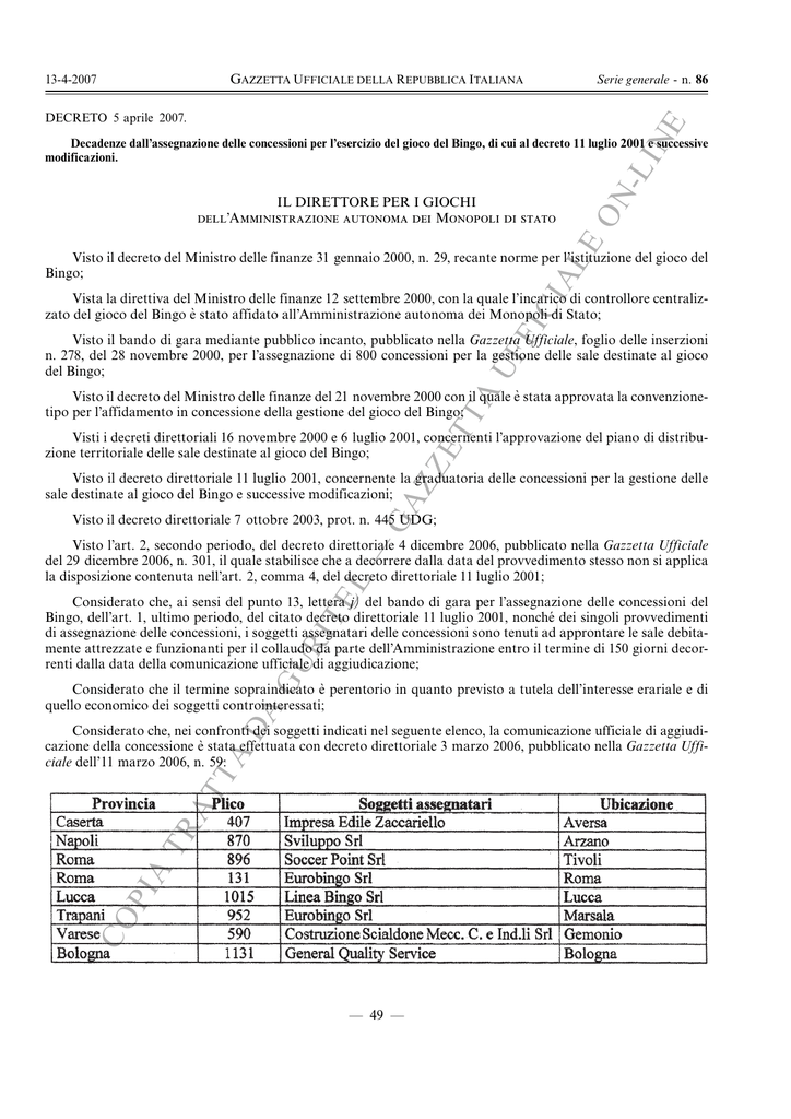 DECRETO 5 aprile 2007. Serie generale - n. 86 ON -L IN E GAZZETTA UFFICIALE DELLA REPUBBLICA ITALIANA 13-4-2007 Decadenze dall’assegnazione delle concessioni per l’esercizio del gioco del Bingo, di cui al decreto 11 luglio 2001 e successive modificazioni. UF FI CI AL E IL DIRETTORE PER I GIOCHI dell’Amministrazione autonoma dei Monopoli di stato Visto il decreto del Ministro delle finanze 31 gennaio 2000, n. 29, recante norme per l’istituzione del gioco del Bingo; Vista la direttiva del Ministro delle finanze 12 settembre 2000, con la quale l’incarico di controllore centralizzato del gioco del Bingo e' stato affidato all’Amministrazione autonoma dei Monopoli di Stato; Visto il bando di gara mediante pubblico incanto, pubblicato nella Gazzetta Ufficiale, foglio delle inserzioni n. 278, del 28 novembre 2000, per l’assegnazione di 800 concessioni per la gestione delle sale destinate al gioco del Bingo; GA ZZ ET TA Visto il decreto del Ministro delle finanze del 21 novembre 2000 con il quale e' stata approvata la convenzionetipo per l’affidamento in concessione della gestione del gioco del Bingo; Visti i decreti direttoriali 16 novembre 2000 e 6 luglio 2001, concernenti l’approvazione del piano di distribuzione territoriale delle sale destinate al gioco del Bingo; Visto il decreto direttoriale 11 luglio 2001, concernente la graduatoria delle concessioni per la gestione delle sale destinate al gioco del Bingo e successive modificazioni; Visto il decreto direttoriale 7 ottobre 2003, prot. n. 445 UDG; GU RI TE L — Visto l’art. 2, secondo periodo, del decreto direttoriale 4 dicembre 2006, pubblicato nella Gazzetta Ufficiale del 29 dicembre 2006, n. 301, il quale stabilisce che a decorrere dalla data del provvedimento stesso non si applica la disposizione contenuta nell’art. 2, comma 4, del decreto direttoriale 11 luglio 2001; Considerato che, ai sensi del punto 13, lettera j) del bando di gara per l’assegnazione delle concessioni del Bingo, dell’art. 1, ultimo periodo, del citato decreto direttoriale 11 luglio 2001, nonche¤ dei singoli provvedimenti di assegnazione delle concessioni, i soggetti assegnatari delle concessioni sono tenuti ad approntare le sale debitamente attrezzate e funzionanti per il collaudo da parte dell’Amministrazione entro il termine di 150 giorni decorrenti dalla data della comunicazione ufficiale di aggiudicazione; DA Considerato che il termine sopraindicato e' perentorio in quanto previsto a tutela dell’interesse erariale e di quello economico dei soggetti controinteressati; CO PI A TR AT TA Considerato che, nei confronti dei soggetti indicati nel seguente elenco, la comunicazione ufficiale di aggiudicazione della concessione e' stata effettuata con decreto direttoriale 3 marzo 2006, pubblicato nella Gazzetta Ufficiale dell’11 marzo 2006, n. 59: ö 49 ö