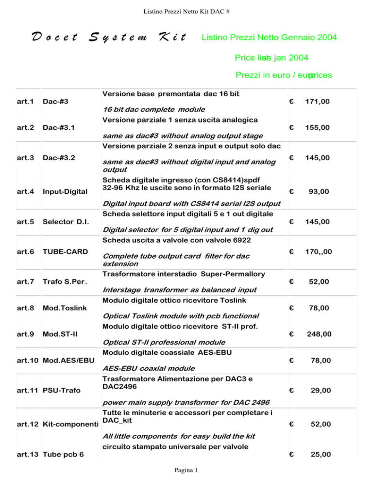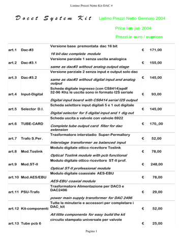 Listino Prezzi Netto Kit DAC # Docet System Kit Listino Prezzi Netto Gennaio 2004 Price list as jan 2004 Prezzi in euro / euro prices art.1 Dac-#3 art.2 Dac-#3.1 Versione base premontata dac 16 bit 16 bit dac complete module Versione parziale 1 senza uscita analogica same as dac#3 without analog output stage € 171,00 € 155,00 € 145,00 € 93,00 € 145,00 € 170,,00 € 52,00 € 78,00 € 248,00 € 78,00 € 29,00 € 52,00 € 25,00 Versione parziale 2 senza input e output solo dac art.3 art.4 Dac-#3.2 Input-Digital same as dac#3 without digital input and analog output Scheda digitale ingresso (con CS8414)spdf 32-96 Khz le uscite sono in formato I2S seriale Digital input board with CS8414 serial I2S output art.5 Selector D.I. Scheda selettore input digitali 5 e 1 out digitale Digital selector for 5 digital input and 1 dig out Scheda uscita a valvole con valvole 6922 art.6 TUBE-CARD art.7 Trafo S.Per. art.8 Mod.Toslink art.9 Mod.ST-II art.10 Mod.AES/EBU art.11 PSU-Trafo Complete tube output card filter for dac extension Trasformatore interstadio Super-Permallory Interstage transformer as balanced input Modulo digitale ottico ricevitore Toslink Optical Toslink module with pcb functional Modulo digitale ottico ricevitore ST-II prof. Optical ST-II professional module Modulo digitale coassiale AES-EBU AES-EBU coaxial module Trasformatore Alimentazione per DAC3 e DAC2496 power main supply transformer for DAC 2496 art.12 Kit-componenti Tutte le minuterie e accessori per completare i DAC_kit All little components for easy build the kit art.13 Tube pcb 6 circuito stampato universale per valvole Pagina 1 Listino Prezzi Netto Kit DAC # Universal pcb board for noval tubes art.14 DAC-2496 art.15 PSU-HT art.16 art.17 Nuova scheda DAC a 24 bit 96 Khz Complete dac as 24 bit 96 Khz Trasformatore alimentazione per TUBE-CARD power main transformer for tube card kit dac tube Kit completo del dac a 16 bit con scheda valvole 116 kit dac tube complete tube dac kit at 16 bit 224 complete tube dac kit at 24 bit 96 Khz Kit completo del dac a 24 bit con scheda valvole Pagina 2 € 362,00 € 29.00 € 400.00 € 600.00