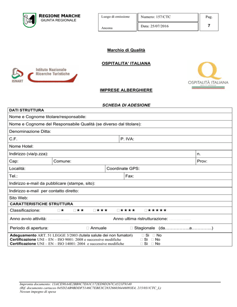 REGIONE MARCHE Luogo di emissione GIUNTA REGIONALE Ancona Numero: 157/CTC Pag. Data: 25/07/2016 7 Marchio di Qualità OSPITALITA’ ITALIANA IMPRESE ALBERGHIERE SCHEDA DI ADESIONE DATI STRUTTURA Nome e Cognome titolare/responsabile: Nome e Cognome del Responsabile Qualità (se diverso dal titolare): Denominazione Ditta: C.F. P. IVA: Nome Hotel: Indirizzo (via/p.zza): Cap: n. Comune: Prov: Località: Coordinate GPS: Tel.: Fax: Indirizzo e-mail da pubblicare (stampe, sito): Indirizzo e-mail per contatto diretto: Sito Web: CARATTERISTICHE STRUTTURA Classificazione: Anno avvio attività: ……..…..... Periodo di apertura: Anno ultima ristrutturazione: ……..…..... Annuale Adeguamento ART. 51 LEGGE 3/2003 (tutela salute dei non fumatori) Certificazione UNI – EN – ISO 9001: 2008 e successive modifiche Certificazione UNI – EN – ISO 14001: 2004 e successive modifiche Stagionale (da……………..a…………..) Si Si Si No No No Impronta documento: 13ACE98A4E2BB8C7E61C172ED9D267CA521F9140 (Rif. documento cartaceo 845D2AB9BDDF5146C7EBE3C283266036446093E4, 215/03//CTC_L) Nessun impegno di spesa REGIONE MARCHE Luogo di emissione GIUNTA REGIONALE Ancona PREZZI: Min Numero: 157/CTC Pag. Data: 25/07/2016 8 Max Camere singole (costo per camera) …................................................................€ Camere doppie Camere doppie (costo per camera) ….................................................................€ Camere singole Mezza pensione (per persona in doppia).............................................................€ Camere disabili Pensione completa (per persona in doppia).........................................................€ Appartamenti Appartamenti (per appartamento al giorno) ………………………….....................€ Appartamenti (1 settimana) ...............................................................................€ Prevalente tipologia di clienti: Turismo Prevalente area di provenienza: Tipo di gestione: Proprietà: Manageriale Proprietà diretta n …….. n ……. n …….. n …….. Posti letto Europea Residenziale Nazionale Extra-Europea Familiare Gestione in affitto Totale ADDETTI n ……. Camere totali Affari Locale/Regionale n …… Stagionali Fissi N. Dirigenti/manager Totale Dipendenti CARTE DI CREDITO SERVIZI BENESSERE Benessere e relax Terme SERVIZI IN CAMERA Cassaforte Internet Tutte SERVIZI DI INTRATTENIMENTO Spiaggia privata Giochi per bambini Locali di intrattenimento Parco giardino SERVIZI PER AFFARI Sala convegni Le principali Nessun servizio SERVIZI GENERALI Ammessi animali Postazione Internet WiFi gratis WiFi a pagamento Ristorante Bar Parcheggio Interno Parcheggio Esterno Miniclub Lavanderia Servizi per disabili SERVIZI SPORT Campo da Beach volley Centro Diving Equitazione Campi da golf(entro 5 km) Palestra Piscina Tennis Impianti di risalita (entro 200 m) Informazioni per l’inserimento in guide cartacee e/o elettroniche Isnart in proprio o in collaborazione con editori terzi, permetterà alle strutture che otterranno il marchio Ospitalità Italiana di essere inserite/segnalate all’interno di guide cartacee e/o elettroniche. Tale inserimento è a titolo completamente gratuito poiché rientra tra le azioni promozionali messe in atto da Isnart per le strutture certificate. Alcune delle informazioni presenti in questo modulo, saranno pertanto riportate nella suddetta guida. Condizioni generali per il rilascio del marchio Ospitalità Italiana • L’attività di valutazione per il rilascio del marchio è disciplinata dal “Regolamento per il rilascio e l’uso del logo marchio Ospitalità Italiana” consegnato unitamente alla presente scheda a formarne parte integrante e che la struttura richiedente si impegna a rispettare, dichiarando altresì di approvare espressamente la clausola del regolamento stesso che prevede nel foro di Roma il foro competente in via esclusiva per le eventuali controversie. Impronta documento: 13ACE98A4E2BB8C7E61C172ED9D267CA521F9140 (Rif. documento cartaceo 845D2AB9BDDF5146C7EBE3C283266036446093E4, 215/03//CTC_L) Nessun impegno di spesa REGIONE MARCHE GIUNTA REGIONALE Luogo di emissione Ancona Numero: 157/CTC Pag. Data: 25/07/2016 9 • ISNART scpa incaricherà per l’attività di verifica presso le strutture un ente di certificazione che opera in conformità alla norma UNI CEI EN ISO/IEC 17065:2012. L’operatore, sottoscrivendo la presente domanda, si impegna ad accogliere il valutatore, anche in forma mistery guest, e accetta di presentare e, ove richiesto, rendere disponibili i servizi e tutto il materiale (fatture, foto, brochure, biglietti da visita, etc.) necessario al buon esito della visita. La presente dichiarazione è resa ai sensi del DPR445/2000 – Disposizioni legislative in materia di documentazione amministrativa. Il Titolare/Rappresentante legale della Struttura: Data ………………………….. Timbro e Firma ………………….……………………………. Si approva espressamente e per iscritto ai sensi degli art. 1341 e 1342 del Codice Civile la clausola che prevede nel foro di Roma il foro competente in via esclusiva per le eventuali controversie. Data ………………………….. Timbro e Firma ………………….……………………………. Informativa e consenso al trattamento dei dati ai sensi del Decreto Legislativo n. 196/2003. La società ISNART scpa, nella persona del responsabile consigliere delegato Maria Stella Marini, Le garantisce che tutte le risposte da Lei fornite resteranno assolutamente riservate e saranno usate solo ai fini del corretto svolgimento del progetto, nel pieno rispetto del D.Lgs 196/2003 sulla tutela della Privacy. La informiamo di quanto segue: 1. 2. 3. Il trattamento a cui saranno sottoposti tutti i dati personali richiesti e/o acquisiti è diretto al solo fine di partecipazione al progetto marchio Ospitalità Italiana La comunicazione di tali dati è facoltativa, tuttavia la mancata co