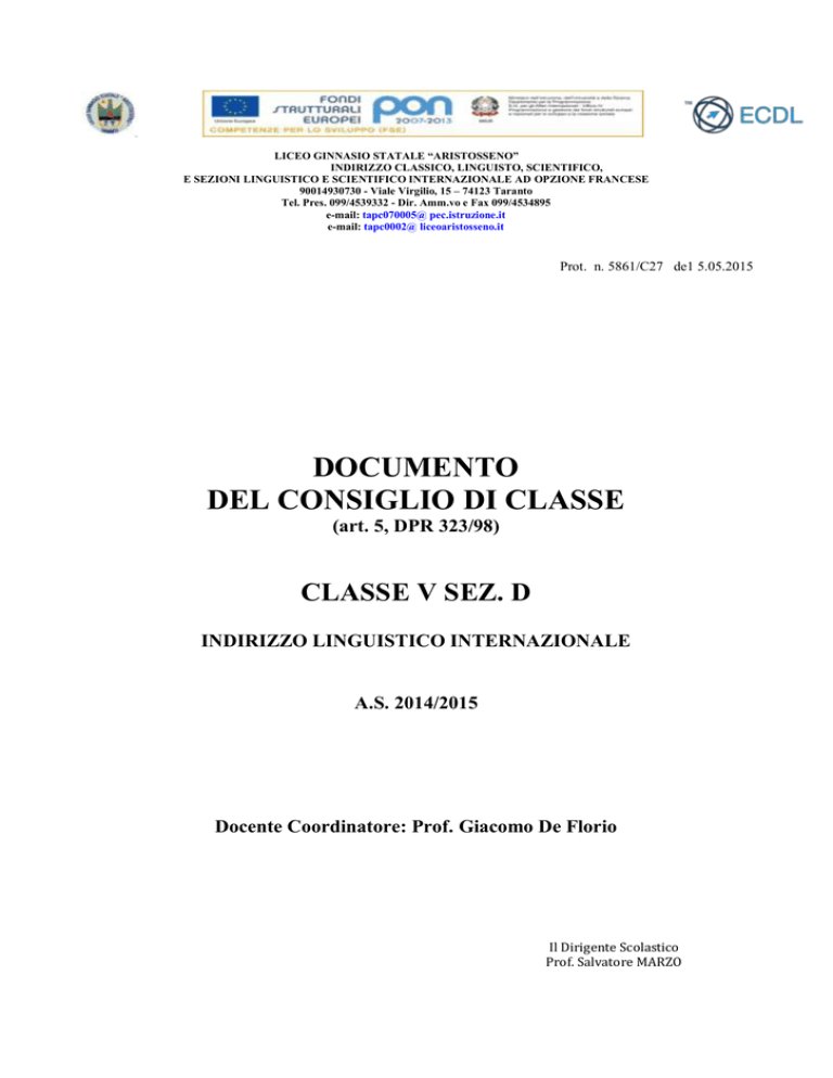 LICEO GINNASIO STATALE “ARISTOSSENO” INDIRIZZO CLASSICO, LINGUISTO, SCIENTIFICO, E SEZIONI LINGUISTICO E SCIENTIFICO INTERNAZIONALE AD OPZIONE FRANCESE 90014930730 - Viale Virgilio, 15 – 74123 Taranto Tel. Pres. 099/4539332 - Dir. Amm.vo e Fax 099/4534895 e-mail: tapc070005@ pec.istruzione.it e-mail: tapc0002@ liceoaristosseno.it Prot. n. 5861/C27 de1 5.05.2015 DOCUMENTO DEL CONSIGLIO DI CLASSE (art. 5, DPR 323/98) CLASSE V SEZ. D INDIRIZZO LINGUISTICO INTERNAZIONALE A.S. 2014/2015 Docente Coordinatore: Prof. Giacomo De Florio Il Dirigente Scolastico Prof. Salvatore MARZO Sommario PRESENTAZIONE DEL LICEO..................................................................................................................... 3 Indirizzo di studi ...................................................................................................................................................4 PRESENTAZIONE SINTETICA DELLA CLASSE ....................................................................................... 5 Prospetto di evoluzione della classe nel triennio ....................................................................................................6 Elenco dei candidati e crediti scolastici .................................................................................................................6 Elenco crediti degli anni precedenti .......................................................................................................................7 Consiglio di classe - Continuità didattica ...............................................................................................................9 OBIETTIVI GENERALI E SPECIFICI PROPRI DELL’INDIRIZZO .......................................................... 10 ATTIVITÀ CURRICOLARI, INTEGRATIVE E PROGETTUALI ............................................................. 11 I PERCORSI FORMATIVI ........................................................................................................................... 11 Attivitá integrative svolte nel corso del triennio ...................................................................................................14 SCHEDA INFORMATIVA RELATIVA ALLE PROVE DI SIMULAZIONE SVOLTE (LE DISCIPLINE, LE TIPOLOGIE, LE SIMULATE EFFETTUATE E LE RELATIVE GRIGLIE DI VALUTAZIONE) . 16 Griglia per la Valutazione della Prova Orale ........................................................................................................ 17 Prima Prova Scritta ............................................................................................................................................. 18 Scheda Di Correzione E Valutazione Seconda Prova Scritta ................................................................................ 20 Simulazione Seconda Prova Scritta ..................................................................................................................... 21 Simulazione Terza Prova Scritta .......................................................................................................................... 32 Scheda di Correzione e Valutazione Terza Prova Scritta...................................................................................... 33 Griglia di Valutazione Quarta Prova Scritta ......................................................................................................... 41 Griglia di Valutazione per il COMMENTAIRE DIRIGÉ ...................................................................................... 42 Griglia di Valutazione per il L’ESSAI BREF ....................................................................................................... 43 CONTENUTI DISCIPLINARI: SCHEDE RIASSUNTIVE FINALI DEI DOCENTI DELLE SINGOLE DISCIPLINE .................................................................................................................................................. 44 Scheda disciplinare di ITALIANO ..................................................................................................................... 45 Scheda disciplinare di LATINO .......................................................................................................................... 46 Scheda disciplinare di STORIA ........................................................................................................................... 47 Scheda disciplinare di FILOSOFIA ..................................................................................................................... 48 Scheda disciplinare di LINGUA E CIVILTA' INGLESE..................................................................................... 49 Scheda disciplinare di LINGUA E CIVILTA' FRANCESE ................................................................................. 50 Scheda disciplinare di STORIA IN LINGUA FRANCESE ................................................................................. 52 Scheda disciplinare di MATEMATICA............................................................................................................... 57 Scheda disciplinare di STORIA DELL’ARTE ..................................................................................................... 59 Scheda disciplinare di EDUCAZIONE FISICA ..................................................................................................60 Scheda disciplinare di RELIGIONE CATTOLICA ............................................................................................. 61 ALLEGATI .................................................................................................................................................... 62 Decreto Ministeriale N°95/2013 .......................................................................................................................... 62 Allegato N°1 al DM 95/13 ............................................................................................................