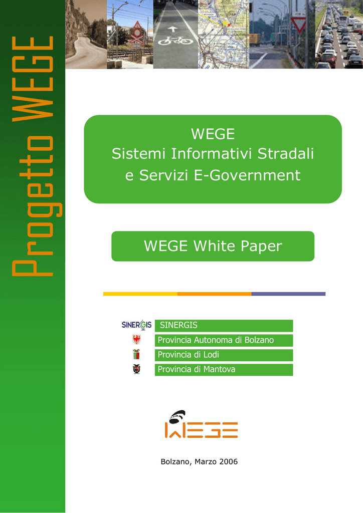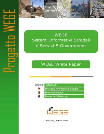 WEGE Sistemi Informativi Stradali e Servizi E-Government WEGE White Paper SINERGIS Provincia Autonoma di Bolzano Provincia di Lodi Provincia di Mantova Bolzano, Marzo 2006 WEGE White Paper Data: 03/03/2005 Rev. .1.0 SOMMARIO Il Progetto WEGE 2002 .......................................................................................... 3 1.0 1.1 Esposizione Generale..................................................................................................3 1.2 Riuso dei Software Sviluppati nei Progetti e-Government ..............................................5 2.0 WEGE 2002: Architettura e componenti ................................................................ 6 2.1 Prerequisiti Software ..................................................................................................7 3.0 Moduli WEGE .......................................................................................................... 8 3.1 WG-UTENTI ............................................................................................................. 10 3.2 WG-EDIT ................................................................................................................. 10 3.3 WG-CONFIG............................................................................................................. 12 3.4 WG-EVENTI ............................................................................................................. 13 3.5 WG-WEBEDIT .......................................................................................................... 15 3.6 WG-WEGESERVER.................................................................................................... 16 3.7 WG-PERCORSI ......................................................................................................... 17 3.8 WG-WEBGIS ............................................................................................................ 18 3.9 WG-PORTAL ............................................................................................................ 19 3.9.1 3.9.2 3.9.3 3.9.4 Il servizio per la gestione interattiva di pratiche amministrative ............................... 19 Servizio di consultazione della cartografia (GIS)...................................................... 20 Servizio interattivo di calcolo di percorsi ................................................................. 20 Servizi interattivi di comunicazione tra il cittadino e la PA ........................................ 20 4.0 Il Modello dei dati gestiti da WEGE .....................................................................21 4.1 Diagramma E/R della banca dati di produzione .......................................................... 23 5.0 Requisiti Hardware e Software............................................................................24 5.1 Caratteristiche Hardware per Data Base Server .......................................................... 25 5.2 Caratteristiche Hardware per Application Server ......................................................... 25 5.3 Caratteristiche Hardware per WebServer ................................................................... 26 WEGE White Paper [Pag. 2 di 26] WEGE White Paper Data: 03/03/2005 Rev. .1.0 1.0 IL PROGETTO WEGE 2002 Il progetto WEGE è uno dei progetti che ha ricevuto il finanziamento dalla legge del Ministero dell’Innovazione per i Progetti per l’e-government, classificandosi quindicesimo nel gruppo di progetti “Servizi ai cittadini e alle imprese”. L’obiettivo del progetto WEGE era la realizzazione di un sistema informativo territoriale dedicato alla gestione della problematica del CATASTO STRADE nel suo senso più ampio, non limitato alle sole problematiche di manutenzione. Il sistema che ci si proponeva di realizzare era un servizio base di comunicazione via Internet/Intranet, che agevolasse la collaborazione e lo scambio di informazioni sia tra i Servizi e gli Enti che interagiscono con il tema strade (G2G) che tra Ente Pubblico e Cittadino. Per servizi di base si intende la ricerca e la consultazione di informazioni, lo scarico di modulistica, l’inoltro telematico di richieste e della relativa risposta. Attualmente (Febbraio 2005) il progetto è stato completato; è stato collaudato dal CNIPA (ex AIPA) per l’80%. La parte che rimane da collaudare, quella del Portale WEGE, è attualmente in fase di test e sarà collaudata entro il mese di Maggio 2005. 1.1 ESPOSIZIONE GENERALE Finalità del progetto WEGE è acquisire una conoscenza completa e aggiornata della rete viabile provinciale, mettendo, inoltre, a disposizione del Dipartimento Viabilità e, più in generale, dell'Ente Provincia, uno strumento informatico che consenta di gestire: le informazioni relative alla rete stradale e agli elementi ad essa correlati, quali, ad esempio, l'andamento plano-altimetrico dell'asse stradale, le caratteristiche geometriche del corpo stradale, i manufatti presenti, le pertinenze, le reti tecnologiche, i vincoli, ecc.; la segnaletica stradale verticale ed orizzontale (disponibilità di un archivio informatico di dettaglio contenente le informazioni su ciascun impianto/cartello/segnale, quali l'ubicazione, la tipologia, le dimensioni, lo stato di conservazione, ...); le pratiche di concessione ed autorizzazione a seguito di richieste per occupazioni temporanee, accessi, attraversamenti, ecc.; le informazioni utili ai fini tributari, le pratiche per la concessione di spazi pubblicitari, le servitù; la manutenzione della pavimentazione stradale (acquisizione di dati sulla regolarità e stato di conservazione del manto stradale). Tutte le informazioni raccolte costituiscono una banca dati territoriale utilizzabile mediante specifici programmi informatici di gestione, quali quelli relativi a concessioni, espropri, tributi, monitoraggio del traffico, ecc.; accessibile via Web, permettendo la consultazione ed il download da postazioni remote; è perfettamente integrabil