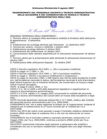 Ordinanza Ministeriale 9 agosto 2007 TRASFERIMENTI DEL PERSONALE DOCENTE E TECNICO AMMINISTRATIVO DELLE ACCADEMIE E DEI CONSERVATORI DI MUSICA E TECNICO AMMINISTRATIVO DEGLI ISIA SEQUENZA TEMPORALE DEGLI ADEMPIMENTI: 1. Termine ultimo di consegna della domanda di mobilità al Direttore della Istituzione di appartenenza 8 settembre 2007 2. Pubblicazione dei punteggi attribuiti agli interessati 21 settembre 2007 3. Termine per reclami, rinunce e rettifiche 1 ottobre 2007 4. Pubblicazione punteggi definitivi 9 ottobre 2007 5. Pubblicazione dei trasferimenti 15 ottobre 2007 6. Comunicazione delle cattedre disponibili per le utilizzazioni temporanee 18 ottobre 2007 7. Termine ultimo per la presentazione della domanda di utilizzazione temporanea 23 ottobre 2007 8. Pubblicazione delle utilizzazioni disposte 31 ottobre 2007 VISTO il Decreto Legislativo 30.3.2001, n. 165 e successive modifiche; VISTA la Legge 14.1.1994, n. 20; VISTO il Decreto Legislativo 16.4.1994, n. 297 e successive modifiche; VISTA la Legge n. 104/92 e successive modificazioni e integrazioni; VISTA la Legge 21 dicembre 1999, n.508 relativa alla riforma delle Accademie di belle arti, dell'Accademia nazionale di danza, dell'Accademia nazionale di arte drammatica, degli Istituti Superiori per le Industrie Artistiche, dei Conservatori di musica e degli Istituti musicali pareggiati; VISTA la legge 8 marzo 2000, n. 53; VISTO il T.U. 28.12.2000 n.445 delle disposizioni legislative e regolamentari in materia di documentazione amministrativa; VISTO il C.C.D.N. siglato il 31 maggio 2002 concernente la mobilità del personale docente e tecnico amministrativo dei Conservatori di musica delle Accademie e degli ISIA; VISTO l'accordo decentrato nazionale sottoscritto il 12.7.2005, relativo alla mobilità del personale tecnico amministrativo per l'a.a. 2005/2006; CONSIDERATO che non è stata raggiunta un'intesa con le organizzazioni sindacali di categoria per la sottoscrizione di un nuovo accordo per la mobilità per l'a.a. 2007/2008; VISTO l'art.2074 del codice civile secondo il quale il Contratto collettivo sottoscritto produce effetti anche dopo la scadenza, fino a che non sia intervenuto un nuovo contratto; CONSIDERATO che il Contratto collettivo nazionale decentrato, sottoscritto il 31 maggio 2002, per l'a.a. 2002/2003, continua a produrre effetti anche per l'a.a. 2007/2008; VALUTATO il preminente interesse degli aspiranti a partecipare alla mobilità e considerato che non si ravvisano impedimenti ricollegabili alla cura degli interessi pubblici; 1 ORDINA - Art. 1 CAMPO DI APPLICAZIONE, DECORRENZA DELL'ORDINANZA E DURATA 1. La presente Ordinanza disciplina la mobilità del personale docente, tecnico e amministrativo con rapporto di lavoro a tempo indeterminato, dei Conservatori di musica e delle Accademie di belle arti nonché del personale tecnico e amministrativo degli Istituti Superiori per le Industrie Artistiche, dell'Accademia Nazionale di Danza e dell'Accademia Nazionale di Arte Drammatica ad eccezione dei docenti di prima e seconda fascia in servizio presso le Scuole Libere del Nudo e presso la Scuola degli Artefici di Milano, per l'anno accademico 2007/2008. 2. Le norme contenute nella presente Ordinanza ministeriale disciplinano i termini e le modalità di applicazione delle disposizioni del Contratto Collettivo Decentrato Nazionale concernente la mobilità del suddetto personale, siglato il 31 maggio 2002 e dell'accordo decentrato nazionale sottoscritto il 12.7.2005 relativo alla mobilità del personale tecnico e amministrativo. - ART. 2 PUBBLICAZIONE 1. La presente Ordinanza ministeriale viene pubblicata all'Albo del Ministero e a quello delle singole Istituzioni, nonché sul sito internet www.miur.it. - ART. 3 COMPETENZA A DISPORRE I TRASFERIMENTI 1. I trasferimenti del personale di cui all'art. 1 comma 1 della presente Ordinanza ministeriale sono disposti dal Direttore Generale dell' Alta Formazione Artistica Musicale e Coreutica. - ART. 4 DOMANDA DI TRASFERIMENTO 1. Può essere presentata una sola domanda di trasferimento. 2. Le domande devono essere redatte secondo il modello Y1 e Y2 - Allegato C1 e C2 – rispettivamente dal personale docente e dal personale tecnico e amministrativo, seguendo le relative istruzioni, e presentate direttamente all'Istituzione in cui l'interessato presta servizio o spedite a mezzo raccomandata con ricevuta di ritorno entro il termine perentorio dell' 8 settembre 2007. In questo ultimo caso, al fine di assicurare la tempestività della procedura, l'interessato è tenuto a far pervenire copia della domanda, entro il medesimo termine, anche via fax. Le Istituzioni rilasciano ricevuta delle domande presentate a mano. 3. Il personale trasferito d'ufficio per incompatibilità ai sensi dell'art. 467 del D.Lgs n. 297/94 non può chiedere di tornare nella sede di provenienza, a meno che non siano cessate le cause di incompatibilità. 4. Le domande prodotte oltre i termini stabiliti ovvero in difformità degli appositi moduli non saranno prese in considerazione. - ART. 5 SEZIONI STACCATE 1. Le sezioni staccate vanno specificamente richieste, ai fini dei trasferimenti, con espressa preferenza. 2 - ART. 6 INDICAZIONI DELLE PREFERENZE 1. Le preferenze debbono essere indicate nell'apposita sezione del modulo-domanda e possono essere espresse per le Accademie di belle arti, i Conservatori e loro sezioni staccate. Solo per il personale tecnico e amministrativo possono essere espresse le preferenze anche per l'Accademia Nazionale di Danza e di Arte Drammatica e per gli Istituti Superiori per le Industrie Artistiche. 2. Le preferenze devono essere espresse indicando la denominazione delle sedi così come riportata negli elenchi ufficiali, pubblicizzati e comunque disponibili presso le Istituzioni. 3. Qualsiasi richiesta formulata in contrasto con le modalità indicate nel presente articolo è nulla. - ART. 7 RINUNCIA, REVOCA E RETTIFICHE ALLA DOMANDA DI TRASFERIMENTO 1. L'eventuale rinuncia alla domanda di 
