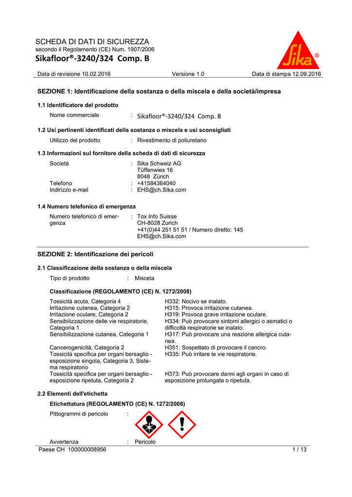 SCHEDA DI DATI DI SICUREZZA secondo il Regolamento (CE) Num. 1907/2006 Sikafloor®‐3240/324 Comp. B Versione 1.0 Data di revisione 10.02.2016 Data di stampa 12.09.2016 SEZIONE 1: Identificazione della sostanza o della miscela e della società/impresa 1.1 Identificatore del prodotto Nome commerciale : Sikafloor®‐3240/324 Comp. B 1.2 Usi pertinenti identificati della sostanza o miscela e usi sconsigliati Utilizzo del prodotto : Rivestimento di poliuretano 1.3 Informazioni sul fornitore della scheda di dati di sicurezza Società : Sika Schweiz AG Tüffenwies 16 8048 Zürich : +41584364040 : [email protected] Telefono Indirizzo e-mail 1.4 Numero telefonico di emergenza Numero telefonico di emergenza : Tox Info Suisse CH-8028 Zurich +41(0)44 251 51 51 / Numero diretto: 145 [email protected] SEZIONE 2: Identificazione dei pericoli 2.1 Classificazione della sostanza o della miscela Tipo di prodotto : Miscela Classificazione (REGOLAMENTO (CE) N. 1272/2008) Tossicità acuta, Categoria 4 Irritazione cutanea, Categoria 2 Irritazione oculare, Categoria 2 Sensibilizzazione delle vie respiratorie, Categoria 1 Sensibilizzazione cutanea, Categoria 1 Cancerogenicità, Categoria 2 Tossicità specifica per organi bersaglio esposizione singola, Categoria 3, Sistema respiratorio Tossicità specifica per organi bersaglio esposizione ripetuta, Categoria 2 H332: Nocivo se inalato. H315: Provoca irritazione cutanea. H319: Provoca grave irritazione oculare. H334: Può provocare sintomi allergici o asmatici o difficoltà respiratorie se inalato. H317: Può provocare una reazione allergica cutanea. H351: Sospettato di provocare il cancro. H335: Può irritare le vie respiratorie. H373: Può provocare danni agli organi in caso di esposizione prolungata o ripetuta. 2.2 Elementi dell'etichetta Etichettatura (REGOLAMENTO (CE) N. 1272/2008) Pittogrammi di pericolo Avvertenza Paese CH 100000008956 : : Pericolo 1 / 13 SCHEDA DI DATI DI SICUREZZA secondo il Regolamento (CE) Num. 1907/2006 Sikafloor®‐3240/324 Comp. B Versione 1.0 Data di revisione 10.02.2016 Indicazioni di pericolo : H315 H317 H319 H332 H334 H335 H351 H373 Consigli di prudenza : Prevenzione: P201 P260 P280 P284 Data di stampa 12.09.2016 Provoca irritazione cutanea. Può provocare una reazione allergica cutanea. Provoca grave irritazione oculare. Nocivo se inalato. Può provocare sintomi allergici o asmatici o difficoltà respiratorie se inalato. Può irritare le vie respiratorie. Sospettato di provocare il cancro. Può provocare danni agli organi in caso di esposizione prolungata o ripetuta. Procurarsi istruzioni specifiche prima dell'uso. Non respirare la polvere/ i fumi/ i gas/ la nebbia/ i vapori/ gli aerosol. Indossare guanti/ indumenti protettivi/ Proteggere gli occhi/ il viso. Quando la ventilazione del locale è insufficiente indossare un apparecchio di protezione respiratoria. Reazione: P304 + P340 + P312 IN CASO DI INALAZIONE: trasportare l’infortunato all’aria aperta e mantenerlo a riposo in posizione che favorisca la respirazione. Contattare un CENTRO ANTIVELENI o un medico in caso di malessere. P308 + P313 IN CASO di esposizione o di possibile esposizione, consultare un medico. Componenti pericolosi da segnalare in etichetta: Difenilmetanodiisocianato, isomeri e omologhi 9016-87-9 metilendifenilediisocianato 247-714-0 Etichettatura aggiuntiva: EUH204 Contiene isocianati. Può provocare una reazione allergica. 2.3 Altri pericoli Questa sostanza/miscela non contiene componenti considerati sia persistenti, bioaccumulabili che tossici (PBT), oppure molto persistenti e molto bioaccumulabili (vPvB) a concentrazioni di 0.1% o superiori. SEZIONE 3: Composizione/informazioni sugli ingredienti 3.2 Miscele Componenti pericolosi Nome Chimico Paese CH 100000008956 Classificazione Concentrazio2 / 13 SCHEDA DI DATI DI SICUREZZA secondo il Regolamento (CE) Num. 1907/2006 Sikafloor®‐3240/324 Comp. B Versione 1.0 Data di revisione 10.02.2016 N. CAS N. CE Numero di registrazione Difenilmetanodiisocianato, isomeri e omologhi 9016-87-9 metilendifenilediisocianato 26447-40-5 247-714-0 (REGOLAMENTO (CE) N. 1272/2008) Data di stampa 12.09.2016 ne [%] Acute Tox.4; H332 Skin Irrit.2; H315 Eye Irrit.2; H319 Resp. Sens.1; H334 Skin Sens.1; H317 Carc.2; H351 STOT SE3; H335 STOT RE2; H373 >= 50 - <= 100 Acute Tox.4; H332 Skin Irrit.2; H315 Eye Irrit.2; H319 Resp. Sens.1; H334 Skin Sens.1; H317 Carc.2; H351 STOT SE3; H335 STOT RE2; H373 >= 50 - <= 100 Per quanto riguarda il testo completo delle indicazioni di pericolo menzionate in questo paragrafo, riferirsi al paragrafo 16. SEZIONE 4: Misure di primo soccorso 4.1 Descrizione delle misure di primo soccorso Informazione generale : Allontanare dall'area di pericolo. Consultare un medico. Mostrare questa scheda di sicurezza al medico curante. Se inalato : Portare all'aria aperta. In caso di esposizione prolungata, consultare un medico. In caso di contatto con la pelle : Togliere immediatamente gli indumenti e le scarpe contaminate. Lavare con sapone e molta acqua. In caso di persistenza dei disturbi consultare un medico. In caso di contatto con gli occhi : Sciacquare immediatamente gli occhi con molta acqua. Rimuovere le lenti a contatto. Sciacquare tenendo l'occhio ben spalancato. Qualora persista irritazione agli occhi, consultare un medico. Se ingerito : Non provocare il vomito senza previe istruzioni mediche. Sciacquare la bocca con acqua. Non somministrare latte o bevande alcoliche. Non somministrare alcunchè a persone svenute. 4.2 Principali sintomi ed effetti, sia acuti e che ritardati Sintomi Paese CH 100000008956 : Manifestazione asmatica Tosse 3 / 13 SCHEDA DI DATI DI SICUREZZA secondo il Regolamento (CE) Num. 1907/2006 Sikafloor®‐3240/324 Comp. B Versione 1.0 Data di revisione 10.02.2016 Data di stampa 12.09.2016 Problemi respiratori Reazioni allergiche Eccessiva lacrimazione Eritema Mal di testa Dermatiti Per informazioni più dettagliate sugli effetti per la salute e i sintomi, vedere la Sezione 1