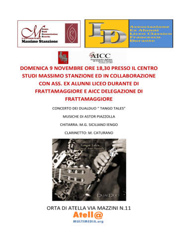 DOMENICA 9 NOVEMBRE ORE 18,30 PRESSO IL CENTRO STUDI MASSIMO STANZIONE ED IN COLLABORAZIONE CON ASS. EX ALUNNI LICEO DURANTE DI FRATTAMAGGIORE E AICC DELEGAZIONE DI FRATTAMAGGIORE CONCERTO DEI DUALDUO “ TANGO TALES” MUSICHE DI ASTOR PIAZZOLLA CHITARRA: M.G. SICILIANO IENGO CLARINETTO: M. CATURANO ORTA DI ATELLA VIA MAZZINI N.11 Domenica 9 novembre alle ore 18,30 il Centro Studi Massimo Stanzione sito in Orta di Atella alla via Mazzini n. 11, in collaborazione con l’Associazione ex allievi Liceo Durante di Frattamaggiore e l’Associazione Italiana di Cultura Classica delegazione di Frattamaggiore, è lieto di presentare il concerto musicale dei DUALDUO dal titolo “Tango Tales”. L’esibizione prevede una rielaborazione musicale del tema “Tango” sulle intuizioni jazzistiche ed avanguardiste del famoso Astor Piazzolla. Graditi ospiti della serata saranno la dott.ssa Teresa Maiello, presidente della DELEGAZIONE FRATTESE DELL’ASSOCIAZIONE ITALIANA DI CULTURA CLASSICA ed il presidente dell’ASSOCIAZIONE EX ALLIEVI LICEO DURANTE dott. Riccardo Acri, distintisi sul territorio grumese-frattese per le innumerevoli iniziative svolte in ambito culturale e sociale. La kermesse sonora verrà eseguita con la chitarra classica di Maria Giovanna Siciliano Iengo e con il clarinetto di Mauro Caturano. La serata sarà ripresa da Atella TV, la web-tv della cultura, ormai punto di riferimento imprescindibile per la diffusione della cultura nei nostri territori. Maria Giovanna Siciliano Iengo è stata vincitrice nel 1995 del “Concorso Internazionale della Chitarra N. Fago” di Taranto e si classifica, nello stesso anno, dopo una lunga serie di prove eliminatorie tenutesi nelle principali città italiane (Napoli, Caserta, Milano e Roma) alla finale del prestigioso Torneo Internazionale della Musica (TIM). Dal 1996 è redattrice di Guitart, rivista internazionale di chitarra classica svolgendo un’importante lavoro di ricerca sulla storia dell’interpretazione del repertorio chitarristico. Dal 1997 è componente del Guitart Quartet (GQ) (quartetto di chitarre) con il quale svolge una importante ed intensa attività artistica e concertistica. Nel maggio 2000 con il GQ è stata invitata ad aprire il XIV Festival Internazionale di Primavera “Andres Segovia” di Madrid. Nell’aprile 2000 è uscito sui mercati discografici italiani ed internazionali il CD “From Spain to South America” musiche di A. Piazzolla, de Falla, Brouwer, Albeniz, Torroba, che ha realizzato con il Guitart Quartet per la Niccolò recordings. Ha effettuato la prima registrazione mondiale della composizione “La banda del Barrio” dell’uruguaiano Ulisses Ferretti presente nel CD “IMAGENES” prodotto e distribuito dall’Università di Montevideo e la prima registrazione mondiale del “Concerto Italiano” del celebre compositore contemporaneo italiano Angelo Gilardino. Con il GQ tiene corsi di perfezionamento, master classes e seminari sulla “musica da camera con la chitarra e le nuove realtà multi-chitarristiche” presso i più prestigiosi Festival Internazionali della Chitarra. Nel luglio del 2000 ha suonato con S. Hackett (mitico fondatore dei Genesis), F. Gambale (ex Chick Corea band) e M. Colonna per il Guitar Event 2000, a Catania. Ha lavorato con l’attore Alessandro Haber con il quale ha realizzato uno spettacolo dal titolo Histoire du tango, storia del tango argentino con musiche di Troilo, Gardel e Piazzolla che sta riscuotendo un enorme successo di pubblico e lodevoli critiche della stampa. Nel 2001 entra nell’olimpo mondiale dei chitarristi: Leo Brouwer scrive infatti il «Concierto Italico» per il G.Q., primi italiani a cui il maestro cubano dedica un suo concerto, dopo quelli dedicati ai “grandi” della chitarra come J. Bream, J. Williams, C. Costiolis ecc. La prima esecuzione mondiale del “Concierto Italico” per quartetto di chitarre ed orchestra d’archi di Leo Brouwer si è svolta venerdi 20 luglio 2001 al Todi Arte Festival con replica il giorno dopo alla XIX Rassegna Internazionale di Orchestre ad Avellino. -Mauro Caturano si è classificato tra i primi in alcuni concorsi nazionali, sia come solista che in formazioni cameristiche. Si è esibito da solista con alcune delle migliori orchestre europee (Jeunesses Musicales di Belgrado, Accademia di Ostrava Rep. Ceca, Botosani – Romania). Ha fatto parte dell’Orchestre D’Armonie Des Jeunes De L’Union Europeenne nel 1994 e 1996 con tournee in Portogallo e Spagna. Nell’ottobre 2004 si è esibito nell’aula Nervi in Vaticano alla presenza di sua Santità Giovanni Paolo II. Nell’estate 2005 si è esibito nel “Teatro Manuel Artime” di Miami in Florida (USA) in occasione del Centenario dei Fratelli Lasalliani delle scuole Cristiane di Cuba e successivamente a New York.