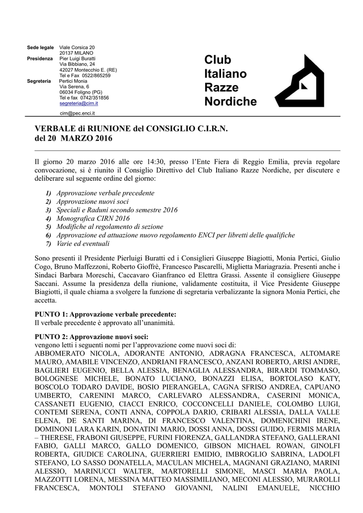 Sede legale Presidenza Segreteria Viale Corsica 20 20137 MILANO Pier Luigi Buratti Via Bibbiano, 24 42027 Montecchio E. (RE) Tel e Fax 0522/865259 Pertici Monia Via Serena, 6 06034 Foligno (PG) Tel e fax 0742/351856 [email protected] Club Italiano Razze Nordiche [email protected] VERBALE di RIUNIONE del CONSIGLIO C.I.R.N. del 20 MARZO 2016 Il giorno 20 marzo 2016 alle ore 14:30, presso l’Ente Fiera di Reggio Emilia, previa regolare convocazione, si è riunito il Consiglio Direttivo del Club Italiano Razze Nordiche, per discutere e deliberare sul seguente ordine del giorno: 1) 2) 3) 4) 5) 6) 7) Approvazione verbale precedente Approvazione nuovi soci Speciali e Raduni secondo semestre 2016 Monografica CIRN 2016 Modifiche al regolamento di sezione Approvazione ed attuazione nuovo regolamento ENCI per libretti delle qualifiche Varie ed eventuali Sono presenti il Presidente Pierluigi Buratti ed i Consiglieri Giuseppe Biagiotti, Monia Pertici, Giulio Cogo, Bruno Maffezzoni, Roberto Gioffrè, Francesco Pascarelli, Miglietta Mariagrazia. Presenti anche i Sindaci Barbara Moreschi, Caccavaro Gianfranco ed Elettra Grassi. Assente il consigliere Giuseppe Saccani. Assume la presidenza della riunione, validamente costituita, il Vice Presidente Giuseppe Biagiotti, il quale chiama a svolgere la funzione di segretaria verbalizzante la signora Monia Pertici, che accetta. PUNTO 1: Approvazione verbale precedente: Il verbale precedente è approvato all’unanimità. PUNTO 2: Approvazione nuovi soci: vengono letti i seguenti nomi per l’approvazione come nuovi soci di: ABBOMERATO NICOLA, ADORANTE ANTONIO, ADRAGNA FRANCESCA, ALTOMARE MAURO, AMABILE VINCENZO, ANDRIANI FRANCESCO, ANZANI ROBERTO, ARISI ANDRE, BAGLIERI EUGENIO, BELLA ALESSIA, BENAGLIA ALESSANDRA, BIRARDI TOMMASO, BOLOGNESE MICHELE, BONATO LUCIANO, BONAZZI ELISA, BORTOLASO KATY, BOSCOLO TODARO DAVIDE, BOSIO PIERANGELA, CAGNA SFRISO ANDREA, CAPUANO UMBERTO, CARENINI MARCO, CARLEVARO ALESSANDRA, CASERINI MONICA, CASSANETI EUGENIO, CIACCI ENRICO, COCCONCELLI DANIELE, COLOMBO LUIGI, CONTEMI SERENA, CONTI ANNA, COPPOLA DARIO, CRIBARI ALESSIA, DALLA VALLE ELENA, DE SANTI MARINA, DI FRANCESCO VALENTINA, DOMENICHINI IRENE, DOMINONI LARA KARIN, DONATINI MARIO, DOSSI ANNA, DOSSI GUIDO, FERMIS MARIA – THERESE, FRABONI GIUSEPPE, FURINI FIORENZA, GALLANDRA STEFANO, GALLERANI FABIO, GALLI MARCO, GALLO DOMENICO, GIBSON MICHAEL ROWAN, GINOLFI ROBERTA, GIUDICE CAROLINA, GUERRIERI EMIDIO, IMBROGLIO SABRINA, LADOLFI STEFANO, LO SASSO DONATELLA, MACULAN MICHELA, MAGNANI GRAZIANO, MARINI ALESSIO, MARINUCCI WALTER, MARTORELLI SIMONE, MASCI MARIA PAOLA, MAZZOTTI LORENA, MESSINA MATTEO MASSIMILIANO, MECONI ALESSIO, MURAROLLI FRANCESCA, MONTOLI STEFANO GIOVANNI, NALINI EMANUELE, NICCHIO MASSIMILIANO, NUSSDORFER GIOVANNA, PAOLETTI LUCA, PAROLIN ALESSANDRO, PERLO DANIELE, PICA CARLO, PINTO ALBERTO MARIA, POLEGRI UMBERTO, PORZIO LAURA, QUAGLIA MARIO, RAIMONDO GABRIELLA, RANFAGNI CINZIA, RENZETTI ELISABETTA, REZZONICO DANIELA, ROLLE SIMONE, ROMANATO IVANO, RUFFO ALBERTO, SAGGIN DANIELE, SARTORI SARA, SCARPONE DANTE, SCAVELLO INDIA, SENAY USTA, SGARZINI IRIS, SIGNORELLI ETTORE, SPANO EMANUELE, SPORTELLI RITA, SORCI VALERIA, STEFANINI EMANUELE, TERRUZZI LUIGI, TOMASINI RENATO, VERZELLESI IVAN, VERZELLESI MAURIZIO, VIGANO’ GIULIA, VISINI GIANLUCA, VITTORE VITO, VOLPI ERIO, ZANUTTO LUDOVICA, ZECCHINI ANTONIO PUNTO 3: Speciali e Raduni secondo semestre 2016 Le speciali e raduni assegnati al momento per il 2016 sono: - 10/1 Speciale Milano (escluso Siberian Husky) – già fatta - 31/1 Raduno Alaskan Malamute Alpe Giumello – già fatta - 19/3 Raduno Reggio Emilia – già fatta - 20/3 Speciale Akita Reggio Emilia – già fatta - 7/5 Raduno Akita Ercolano - 8/5 Speciale Ercolano - 14/5 Raduno Akita Firenze - 28/5 Raduno Rende (escluso Alaskan Malamute) - 8 o 9/10 Raduno Bastia Umbra - 1/11 Raduno o Mostra Speciale Akita Varese - 19/11 Speciale Roma In Sardegna è assegnato Raduno a Sassari per il 5 o 6/11, ed in Sicilia è assegnata Speciale a Messina per il 22 o 23/10. L’ENCI ha assegnato per quest’anno due suppletive, una a Pisa per il 4/6 ed una a Torino per il 3/7. La Monografica è conteggiata a parte e rimane da decidere data e luogo. La Saki riguardo a Sassari chiede se il gruppo cinofilo può chiamare un giudice dalla loro lista presentata, il presidente ricorda che per agevolare il gruppo cinofilo nelle isole scegliamo dalla giuria. Il consigliere Maffezzoni pone di nuovo l’attenzione sul fatto che tutti i gruppi cinofili che ottengono la speciale devono rispettare il principio dei premi richiesti e dei giudici. PUNTO 4: Monografica CIRN 2016 Per quanto riguarda la Monografica 2016 il consigliere Bruno Maffezzoni propone come luogo dove poter svolgere la manifestazione la fiera di Abbiate Grasso (MI), già da lui visionata. Tra i soci è presente la Sig.ra Raimondo che si prende incarico di verificare la disponibilità della fiera per le date di dicembre e la ricettività di un hotel nelle vicinanze dove poter effettuare la consueta cena sociale. PUNTO 5: Modifiche al Regolamento di Sezione Poiché questo punto necessita di approfondimento che non sono ancora stati fatti, il presidente propone di rimandare la discussione al prossimo consiglio dopo aver pensato bene a tutto quello che si può migliorare. PUNTO 6: Approvazione ed attuazione nuovo regolamento ENCI per libretti delle qualifiche Il presidente mette a conoscenza il consiglio della nuova delibera ENCI che consente alle associazioni specializzate di razza di richiedere e gestire i libretti delle qualifiche, il consiglio preferisce rifiutare questa possibilità. PUNTO 7: Varie ed eventuali Nelle varie ed eventuali il consigliere Miglietta riporta che alcuni soci hanno segnalato il ritardo nella pubblicazione delle notizie sul sito del CIRN, quindi propone di renderlo più attivo creando un nuovo sito con all’interno tutte le sezioni che possono inserire il materiale direttamente in modo autonomo. N