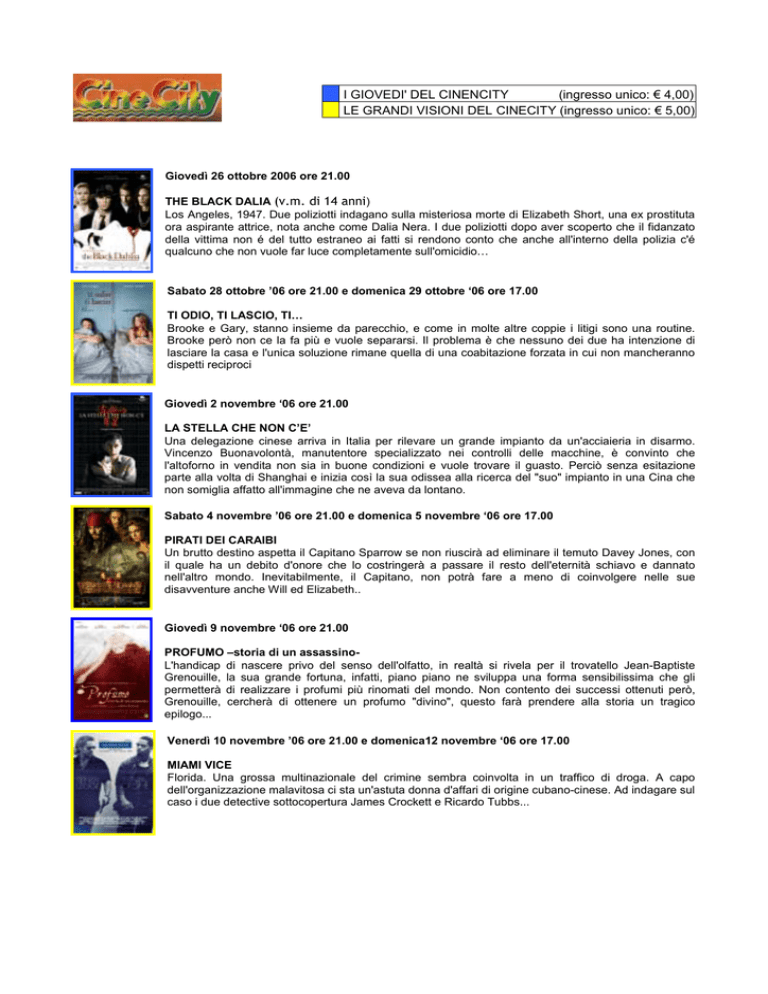 I GIOVEDI' DEL CINENCITY (ingresso unico: € 4,00) LE GRANDI VISIONI DEL CINECITY (ingresso unico: € 5,00) Giovedì 26 ottobre 2006 ore 21.00 THE BLACK DALIA (v.m. di 14 anni) Los Angeles, 1947. Due poliziotti indagano sulla misteriosa morte di Elizabeth Short, una ex prostituta ora aspirante attrice, nota anche come Dalia Nera. I due poliziotti dopo aver scoperto che il fidanzato della vittima non é del tutto estraneo ai fatti si rendono conto che anche all'interno della polizia c'é qualcuno che non vuole far luce completamente sull'omicidio… Sabato 28 ottobre ’06 ore 21.00 e domenica 29 ottobre ‘06 ore 17.00 TI ODIO, TI LASCIO, TI… Brooke e Gary, stanno insieme da parecchio, e come in molte altre coppie i litigi sono una routine. Brooke però non ce la fa più e vuole separarsi. Il problema è che nessuno dei due ha intenzione di lasciare la casa e l'unica soluzione rimane quella di una coabitazione forzata in cui non mancheranno dispetti reciproci Giovedì 2 novembre ‘06 ore 21.00 LA STELLA CHE NON C’E’ Una delegazione cinese arriva in Italia per rilevare un grande impianto da un'acciaieria in disarmo. Vincenzo Buonavolontà, manutentore specializzato nei controlli delle macchine, è convinto che l'altoforno in vendita non sia in buone condizioni e vuole trovare il guasto. Perciò senza esitazione parte alla volta di Shanghai e inizia così la sua odissea alla ricerca del "suo" impianto in una Cina che non somiglia affatto all'immagine che ne aveva da lontano. Sabato 4 novembre ’06 ore 21.00 e domenica 5 novembre ‘06 ore 17.00 PIRATI DEI CARAIBI Un brutto destino aspetta il Capitano Sparrow se non riuscirà ad eliminare il temuto Davey Jones, con il quale ha un debito d'onore che lo costringerà a passare il resto dell'eternità schiavo e dannato nell'altro mondo. Inevitabilmente, il Capitano, non potrà fare a meno di coinvolgere nelle sue disavventure anche Will ed Elizabeth.. Giovedì 9 novembre ‘06 ore 21.00 PROFUMO –storia di un assassinoL'handicap di nascere privo del senso dell'olfatto, in realtà si rivela per il trovatello Jean-Baptiste Grenouille, la sua grande fortuna, infatti, piano piano ne sviluppa una forma sensibilissima che gli permetterà di realizzare i profumi più rinomati del mondo. Non contento dei successi ottenuti però, Grenouille, cercherà di ottenere un profumo "divino", questo farà prendere alla storia un tragico epilogo... Venerdì 10 novembre ’06 ore 21.00 e domenica12 novembre ‘06 ore 17.00 MIAMI VICE Florida. Una grossa multinazionale del crimine sembra coinvolta in un traffico di droga. A capo dell'organizzazione malavitosa ci sta un'astuta donna d'affari di origine cubano-cinese. Ad indagare sul caso i due detective sottocopertura James Crockett e Ricardo Tubbs... Giovedì 16 novembre ‘06 ore 21.00 L’ORCHESTRA DI PIAZZA VITTORIO Il film documenta la nascita dell'Orchestra di Piazza Vittorio, nata dall'iniziativa di Mario Tronco (tastierista degli Avion Travel) e Agostino Ferrente (regista del film). L'Orchestra, riunisce musicisti di varie etnie che vivono nel quartiere Esquilino, noto per essere il più multietnico di Roma. Il progetto si prefigge appunto di far coesistere varie persone, varie visioni del mondo, varie culture, che giorno dopo giorno si confrontano nello stesso quartiere... Venerdì 17novembre ‘06 ore 21.00 e sabato 18 novembre ‘06 ore 21.00 SCOOP Una ragazza americana che studia giornalismo, sta trascorrendo un breve periodo a Londra, quando si trova ad indagare su alcuni misteriosi omicidi. Il destino vuole che proprio in questa circostanza si innamori di un aristocratico inglese Giovedì 23 novembre ‘06 ore 21.00 NUOVOMONDO Inizi del Novecento. Sicilia: una decisione cambierà la vita della famiglia Mancuso, scegliere di lasciarsi il passato alle spalle e iniziare una vita nuova nel Nuovo Mondo. Salvatore vende tutto per portare i figli e la vecchia madre in un posto dove ci sarà più lavoro e più pane per tutti. Salvatore Mancuso, è uno delle migliaia di emigranti italiani che misero in gioco tutto… Sabato 25 novembre ’06 ore 21.00 e domenica 26 novembre ‘06 ore 17.00 BABEL Il film é diviso in tre storie; durante un viaggio organizzato in Marocco, una donna che si trova in vacanza col marito viene ferita da un colpo di fucile sparato per sbaglio da due ragazzi. La coppia ha affidato i propri figli ad una tata messicana a San Diego, ma la donna non può assolutamente mancare al matrimonio del figlio. Nel contempo un ragazza giapponese sordomuta, vive la sua adolescenza con i disagi del suo handicap. Giovedì 30 novembre ‘06 ore 21.00 CROSSING THE BRIDGE Instambul, da sempre snodo culturale tra oriente ed occidente, vista in questo documentario dal punto di vista musicale, percorrendo i vari generi che dalla classica musica araba arrivano all'attuale sound dell'hip-hop Sabato 2 dicembre ‘06 ore 21.00 e domenica 3 dicembre ‘06 ore 17.00 WORLD TRADE CENTER Durante le operazioni di soccorso dopo gli attacchi terroristici alle "Torri Gemelle" dell'11 Settembre 2001, due agenti della Port Authority, rimangono sotto le macerie. Questa é la vera storia dei soccorsi ai due poliziotti e delle emozioni provate dai loro familiari. Giovedì 7 dicembre ‘06 ore 21.00 NON E’ PECCATO- LA QUINCENARIA Il film prende spunto dalle varie tensioni, di diverso genere, che si vivono in un quartiere latino in transizione, di una grande città americana. Sesso, conflitti di classe e razziali, sono i problemi che accompagnano Magdalena, che si avvicina a compiere i quindici anni e si prepara a festeggiare la "Quinceañera", la tipica festa messicana che segna il passaggio all'età adulta. Un paio di mesi prima del compleanno, nel bel mezzo dei preparativi per la festa, Magdalena, rimane incinta… Sabato 9 dicembre ’06 ore 21.00 e domenica 10 dicembre ‘06 ore 17.00 IL DIAVOLO VESTE PRADA Arrivata a New York, dopo essersi laureata ed aver trascorso una vita in una cittadina di provincia, Andy