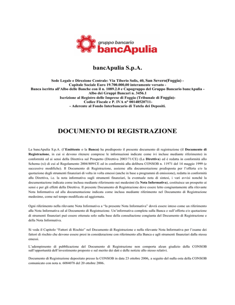 bancApulia S.p.A. Sede Legale e Direzione Centrale: Via Tiberio Solis, 40, San Severo(Foggia) Capitale Sociale Euro 19.700.000,00 interamente versato Banca iscritta all'Albo delle Banche con il n. 1089.2.0 e Capogruppo del Gruppo Bancario bancApulia Albo dei Gruppi Bancari n. 3456.1 Iscrizione al Registro delle Imprese di Foggia (Tribunale di Foggia)Codice Fiscale e P. IVA n° 00148520711- Aderente al Fondo Interbancario di Tutela dei Depositi. DOCUMENTO DI REGISTRAZIONE La bancApulia S.p.A. (l’Emittente o la Banca) ha predisposto il presente documento di registrazione (il Documento di Registrazione, in cui si devono ritenere comprese le informazioni indicate come ivi incluse mediante riferimento) in conformità ed ai sensi della Direttiva sul Prospetto (Direttiva 2003/71/CE) (La Direttiva) ed è redatta in conformità allo Schema (xi) di cui al Regolamento 2004/809/CE ed in conformità alla delibera CONSOB n. 11971 del 14 maggio 1999 (e successive modifiche). Il Documento di Registrazione, assieme alla documentazione predisposta per l’offerta e/o la quotazione degli strumenti finanziari di volta in volta emessi (anche in base a programmi di emissione), redatta in conformità alla Direttiva, i.e. la nota informativa sugli strumenti finanziari, la eventuale nota di sintesi, i vari avvisi nonché la documentazione indicata come inclusa mediante riferimento nei medesimi (la Nota Informativa), costituisce un prospetto ai sensi e per gli effetti della Direttiva. Il presente Documento di Registrazione deve essere letto congiuntamente alla rilevante Nota Informativa ed alla documentazione indicata come inclusa mediante riferimento nel Documento di Registrazione medesimo, come nel tempo modificata ed aggiornata. Ogni riferimento nella rilevante Nota Informativa a “la presente Nota Informativa” dovrà essere inteso come un riferimento alla Nota Informativa ed al Documento di Registrazione. Un’informativa completa sulla Banca e sull’offerta e/o quotazione di strumenti finanziari può essere ottenuta solo sulla base della consultazione congiunta del Documento di Registrazione e della Nota Informativa. Si veda il Capitolo “Fattori di Rischio” nel Documento di Registrazione e nella rilevante Nota Informativa per l’esame dei fattori di rischio che devono essere presi in considerazione con riferimento alla Banca e agli strumenti finanziari dalla stessa emessi. L’adempimento di pubblicazione del Documento di Registrazione non comporta alcun giudizio della CONSOB sull’opportunità dell’investimento proposto e sul merito dei dati e delle notizie allo stesso relativi. Documento di Registrazione depositato presso la CONSOB in data 23 ottobre 2006, a seguito del nulla osta della CONSOB comunicato con nota n. 6084078 del 20 ottobre 2006. Il presente Documento di Registrazione, unitamente alla Nota Informativa ed alla Nota di Sintesi, è a disposizione del pubblico, dalla data di pubblicazione dello stesso e per tutta la durata della sua validità, gratuitamente presso la sede sociale e tutte le filiali della Banca ed è consultabile sul sito Internet dell'Emittente www.bancapulia.it. 2 1. 2. 3. 4. 5. 6. 7. 8. 9. 10. 11. INDICE PERSONE RESPONSABILI .................................................................................................5 1.1 Persone responsabili del documento di registrazione ...........................................5 1.2 Dichiarazioni di responsabilità ............................................................................5 REVISORI LEGALI DEI CONTI..........................................................................................6 AVVERTENZE.....................................................................................................................7 3.1 FATTORI DI RISCHIO......................................................................................7 3.2 PRINCIPALI INDICATORI FINANZIARI, PATRIMONIALI E DI NATURA ECONOMICA ...................................................................................8 INFORMAZIONI SULL’EMITTENTE..............................................................................11 4.1 Storia ed evoluzione dell’Emittente...................................................................11 4.1.1 Denominazione legale.......................................................................................11 4.1.2 Luogo di registrazione dell’Emittente e suo numero di registrazione..................11 4.1.3 Data di costituzione e durata dell'Emittente .......................................................11 4.1.4 Domicilio e forma giuridica dell’Emittente, legislazione in base alla quale opera, paese di costituzione, nonché indirizzo e numero di telefono della sede sociale ..............................................................................................11 4.1.5 Qualsiasi evento recente verificatosi nella vita dell’Emittente sostanzialmente rilevante per la vita della società ..............................................11 4.2 Rating dell’Emittente ........................................................................................12 PANORAMICA DELLE ATTIVITA’ .................................................................................14 5.1 Principali attività...............................................................................................14 5.1.1 Breve descrizione delle principali attività dell’Emittente con indicazione delle principali categorie di prodotti venduti e/o servizi prestati.........................14 5.1.2. Indicazione dei nuovi prodotti e/o delle nuove attività, se significativi...............17 5.1.3 Principali Mercati .............................................................................................17 5.1.4 Posizione concorrenziale dell'Emittente.............................................................17 STRUTTURA ORGANIZZATIVA .....................................................................................18 6.1 
