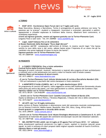 Nr. 37 – luglio 2010 A TORINO • ESOF 2010 – EuroScience Open Forum dal 2 al 7 luglio sedi varie Dopo Stoccolma, Monaco e Barcellona, Torino è protagonista di questa edizione con tema “la passione per la scienza”: studenti e insegnanti, ricercatori e scienziati, giornalisti e politici, appassionati e cittadini esplorano le frontiere della ricerca, dibattono temi controversi, si scambiano esperienze. eventi ad ingresso gratuito, mostre ad ingresso gratuito con la Torino+Piemonte Card. Lingotto Fiere e sedi varie - Tel. 011.505900 - www.esof2010.org • Legni. Adolf Vallazza fino al 26 settembre al Museo Nazionale della Montagna “Duca degli Abruzzi” In occasione dell’85° compleanno dell’artista di Ortisei, in mostra vecchi legni “che hanno sentito la voce della neve e del vento, adesso hanno preso l’impronta di un uomo che gli ha cambiato vita senza togliergli di dosso la storia che hanno”. Ingresso gratuito con la Torino+Piemonte Card. Tel. 011.6604104 – www.museomontagna.org IN PIEMONTE • A CUNEO E PROVINCIA: fino a inizio settembre Festival Estivo della Provincia Granda Rassegna di eventi culturali, musicali, folcloristici e teatrali alla scoperta di beni architettonici e culturali unici e che animeranno con suoni e colori le fresche notti d’estate cuneesi. Ingresso libero ad esclusione di alcuni eventi. Tel. 0171.690217 - www.festivalestivo.com …E con la Torino+Piemonte Card: Istituto Idrotermale di Lurisia a Roccaforte Mondovì (CN) - 15% sui trattamenti e pacchetti del centro benessere e linea cosmetica • A MONFORTE D’ALBA (CUNEO): dal 1 al 31 luglio Monfortinjazz 2010 Un programma di concerti all’aperto, nella suggestiva cornice dell’Auditorium Horszowsky situato nella parte più antica del paese, con vista spettacolare su collina, pianura del Cuneese e Alpi. Ingresso ridotto con la Torino+Piemonte Card. Tel. 0173.78129 / 334.9166399 - www.monfortearte.net … Gratis con la Torino+Piemonte Card: Castello Comunale Falletti di Barolo (CN) Ospita la biblioteca di Silvio Pellico, l’Enoteca Regionale, il Museo del vino e delle contadinerie. Tel. 0173.56277 – www.baroloworld.it • AD ASTI: dal 3 al 18 luglio Astimusica Nella cornice di Piazza Cattedrale si alterneranno nomi del panorama musicale contemporaneo, tra cui Simone Cristicchi, Malika Ayane, Baustelle, Nina Zilli, Alice, Gong, Africa Unite. Eventi gratuiti o a pagamento a seconda delle serate. Tel. 0141.399479 - www.comune.asti.it ..Gratis con la Torino+Piemonte Card: Museo Etnologico Missionario a Castelnuovo D. B. (AT) Esposizione di materiale dei popoli dei continenti extraeuropei raccolti dai missionari salesiani. Tel. 011.9877168 - www.colledonbosco.it • NEL DISTRETTO DEI LAGHI: dal 24 luglio al 29 agosto Fiori di Fuoco 2010 - 12° edizione Sette emozionanti spettacoli pirotecnici tra laghi e monti, ospitati in location naturali senza eguali, le notti si animano di colori proposti dalle migliori squadre mondiali di fuochi d’artificio. Ingresso libero a tutti gli eventi. Tel. 0323.30416 - www.distrettolaghi.it 1/3 …E con la Torino+Piemonte Card: Gruppo Guide Alpine Valle Ossola a Viganella (VB) - 10% su escursioni, arrampicate, trekking, canyoning e vie ferrate accompagnate dalle guide. Tel. 340.5551203 • AL SANTUARIO DI OROPA (BI): dal 1 al 5 luglio Anno Domini Multifestival Il decimo seminario di artisti cristiani da tutto il mondo per Workshop di musica, danza, teatro/animazione, arti grafiche e visive e motivazione, oltre che spettacoli presso il Teatro Sociale di Biella, nella serata del 4 luglio con ospite speciale Antonella Ruggiero. Tel. 338 7262173 - www.annodomini.org ..Gratis con la Torino+Piemonte Card: Museo dei tesori di Oropa al Santuario (BI) Esposizione di ori e gioielli, paramenti liturgici e memorie storiche del Santuario. Tel. 015.25551200 – www.santuariodioropa.it • PIEMONTE DAL VIVO! Questo mese la Torino+Piemonte Card ti offre delle agevolazioni per entrare nel vivo dello spettacolo con… la musica di: Traffic Free Festival (www.trafficfestival.com) Stresa Festival – Settimane Musicali di Stresa e del Lago Maggiore (www.stresafestival.eu) Baveno Festival Umberto Giordano (www.festivalgiordano.it) Vincoli Sonori (www.sferaculture.com) LIBRA... La musica nell’aria - Rassegna del contemporaneo musicale (www.librafestival.it) Folkermesse (www.ethnosuoni.it) Scatola Sonora (www.conservatoriovivaldi.it) Six Ways – Chitarristica Internazionale (www.sixways.it) Italia & Usa - Alba Music Festival (www.albamusicfestival.com) Monfortinjazz (www.monfortearte.net) Antidogma Musica - Festival di Musica Antica e Contemporanea (www.antidogmamusica.it) Festival Mistà (www.festivalmista.it) Musica Antica a Magnano(www.MusicaAnticaMagnano.com) il teatro di: Sul Filo del Circo (www.sulfilodelcirco.com) Teatri Andanti (www.teatrodelleselve.it) La Fabbrica delle Idee (www.progettocantoregi.it) Teatro al naturale (www.cdviaggio.it) Teatro Festival (www.tangramteatro.it) il teatro e la musica di: Teatro a Corte (www.fondazionetpe.it) Lago Maggiore LetterAltura (www.letteraltura.it) Tones on the stones (www.tonesonthestones.com) Festival delle Province (www.reteitalianaculturapopolare.org) Lo spettacolo della montagna (www.lospettacolodellamontagna.it) Festival Teatri di Confine (www.faberteater.com) la danza di: La piattaforma (www.lapiattaforma.didee.it) Vignaledanza - Festival di danza e di arti Integrate (www.vignaledanza.com) Acqui in Palcoscenico (www.ballettoteatroditorino.it) Festival dei Laghi (www.ballettoteatroditorino.it) il cinema di: Incontri cinematografici di Stresa (www.stresacinema.org) Per maggiori informazioni su questi e www.regione.piemonte.it/piemontedalvivo altri festival del Piemonte visita il sito 2/3 • A VARALLO (VERCELLI): dal 9 al 18 Luglio Varallo Alpàa 34 Giornate all’insegna di una mostra mercato di attività commerciali, artigianali, industriali ed enogastronomiche, oltre che momenti dedicati all’arte, alla cultura e alla m