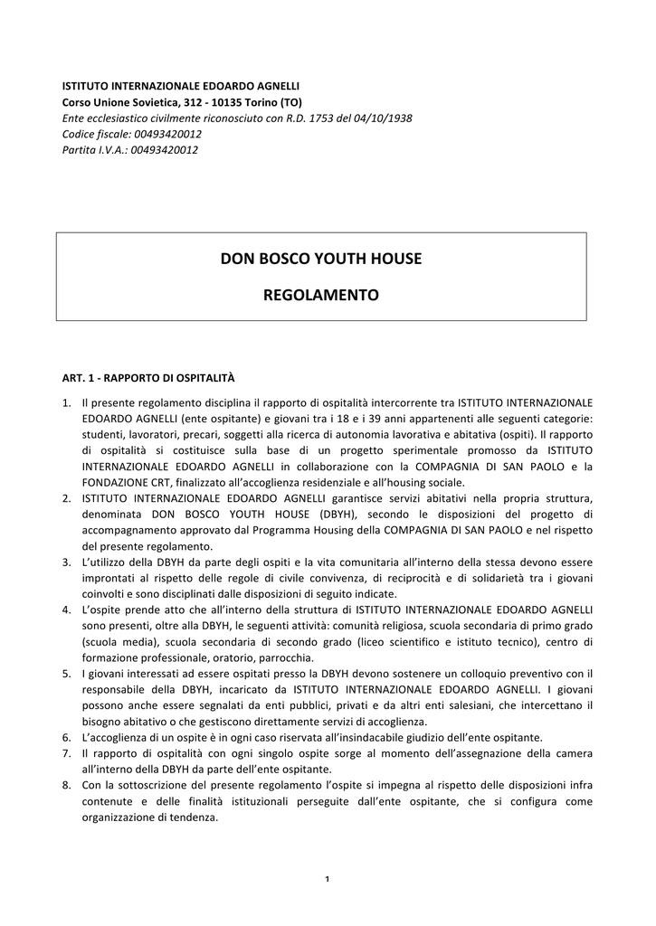 ISTITUTO INTERNAZIONALE EDOARDO AGNELLI Corso Unione Sovietica, 312 -‐ 10135 Torino (TO) Ente ecclesiastico civilmente riconosciuto con R.D. 1753 del 04/10/1938 Codice fiscale: 00493420012 Partita I.V.A.: 00493420012 DON BOSCO YOUTH HOUSE REGOLAMENTO ART. 1 -‐ RAPPORTO DI OSPITALITÀ 1. Il presente regolamento disciplina il rapporto di ospitalità intercorrente tra ISTITUTO INTERNAZIONALE EDOARDO AGNELLI (ente ospitante) e giovani tra i 18 e i 39 anni appartenenti alle seguenti categorie: studenti, lavoratori, precari, soggetti alla ricerca di autonomia lavorativa e abitativa (ospiti). Il rapporto di ospitalità si costituisce sulla base di un progetto sperimentale promosso da ISTITUTO INTERNAZIONALE EDOARDO AGNELLI in collaborazione con la COMPAGNIA DI SAN PAOLO e la FONDAZIONE CRT, finalizzato all’accoglienza residenziale e all’housing sociale. 2. ISTITUTO INTERNAZIONALE EDOARDO AGNELLI garantisce servizi abitativi nella propria struttura, denominata DON BOSCO YOUTH HOUSE (DBYH), secondo le disposizioni del progetto di accompagnamento approvato dal Programma Housing della COMPAGNIA DI SAN PAOLO e nel rispetto del presente regolamento. 3. L’utilizzo della DBYH da parte degli ospiti e la vita comunitaria all’interno della stessa devono essere improntati al rispetto delle regole di civile convivenza, di reciprocità e di solidarietà tra i giovani coinvolti e sono disciplinati dalle disposizioni di seguito indicate. 4. L’ospite prende atto che all’interno della struttura di ISTITUTO INTERNAZIONALE EDOARDO AGNELLI sono presenti, oltre alla DBYH, le seguenti attività: comunità religiosa, scuola secondaria di primo grado (scuola media), scuola secondaria di secondo grado (liceo scientifico e istituto tecnico), centro di formazione professionale, oratorio, parrocchia. 5. I giovani interessati ad essere ospitati presso la DBYH devono sostenere un colloquio preventivo con il responsabile della DBYH, incaricato da ISTITUTO INTERNAZIONALE EDOARDO AGNELLI. I giovani possono anche essere segnalati da enti pubblici, privati e da altri enti salesiani, che intercettano il bisogno abitativo o che gestiscono direttamente servizi di accoglienza. 6. L’accoglienza di un ospite è in ogni caso riservata all’insindacabile giudizio dell’ente ospitante. 7. Il rapporto di ospitalità con ogni singolo ospite sorge al momento dell’assegnazione della camera all’interno della DBYH da parte dell’ente ospitante. 8. Con la sottoscrizione del presente regolamento l’ospite si impegna al rispetto delle disposizioni infra contenute e delle finalità istituzionali perseguite dall’ente ospitante, che si configura come organizzazione di tendenza. 1 ART. 2 -‐ OFFERTA ABITATIVA 1. ISTITUTO INTERNAZIONALE EDOARDO AGNELLI assegna ad ogni singolo ospite una camera singola, dotata di servizi igienici. 2. All’interno della DBYH sono a disposizione degli utenti anche vari ambienti comuni, da gestire in condivisione con gli altri ospiti fruitori della struttura: cucina -‐ soggiorno, biblioteca -‐ sala studio, lavanderia, palestra, sala musica, sale giochi, campi di calcio a 5, campi da basket, cortili. ART. 3 -‐ ACCESSO ALLA DBYH 1. L’accesso alla DBYH è riservato agli ospiti che siano stati accolti da ISTITUTO INTERNAZIONALE EDOARDO AGNELLI e che abbiano sottoscritto per accettazione il presente regolamento, senza riserve del contenuto. 2. L’accesso agli ambienti comuni della DBYH è concesso anche ai visitatori, invitati dagli ospiti, dalle ore 9 alle ore 18 fino ad un massimo di 6 ore giornaliere e previa comunicazione al personale responsabile dell’ente ospitante. I visitatori, su richiesta del personale della DBYH, sono tenuti ad esibire un documento di identità e, se stranieri non appartenenti all’Unione Europea, anche copia del permesso di soggiorno. Durante le ore notturne non è consentito l’accesso a visitatori, né la permanenza. L’accesso da parte di minori è consentito soltanto quando essi facciano parte del nucleo familiare dell’ospite o quando siano accompagnati da familiari adulti. Per insindacabili motivi di sicurezza il personale dell’ente ospitante si riserva il diritto di limitare l’accesso dei visitatori o di allontanarli dalla struttura. 3. In nessun caso è consentito ospitare persone all’interno della camera assegnata. 4. Ogni assenza che si protragga per oltre un giorno deve essere comunicata dall’ospite, anche tramite mail, insieme alla data del rientro, al responsabile della DBYH al personale addetto. 5. Nel caso di assenze superiori ai 30 giorni, il rapporto di ospitalità si intenderà risolto e la camera dovrà essere liberata dall’ospite entro il termine indicato dal responsabile della DBYH. 6. La violazione delle disposizioni contenute nel presente articolo comporta: a) nei confronti del visitatore: l’allontanamento immediato e l’interdizione temporanea dalla DBYH; b) nei confronti dell’ospite: l’applicazione delle sanzioni di cui all’art. 12 del presente regolamento. 7. In caso di malattia grave e/o contagiosa contratta da un ospite, ISTITUTO INTERNAZIONALE EDOARDO AGNELLI potrà disporre l’allontanamento o il trasferimento dell’ospite dalla DBYH, salvo diverse disposizioni impartite dal Servizio Sanitario Nazionale. 8. Contestualmente alla sottoscrizione del presente regolamento, l’ospite dichiara di aver preso visione dell’informativa in materia di prevenzione incendi ed emergenze disponibile presso la struttura. ART. 4 -‐ CONSEGNA DELLE CHIAVI 1. L’ospite, al momento della consegna delle chiavi della camera assegnata, deve presentare a ISTITUTO INTERNAZIONALE EDOARDO AGNELLI: a) documento di riconoscimento (carta d’identità o passaporto o, per gli stranieri, permesso di soggiorno in corso di validità); b) codice fiscale; c) libretto universitario o dichiarazione del datore di lavoro attestante la sussistenza di un rapporto di lavoro. 2. Contestualmente l’ospite deve sottoscrivere, alla presenza di un 