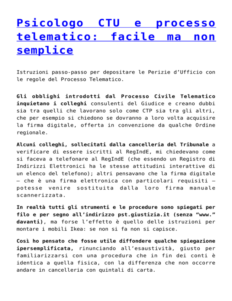 Psicologo CTU e processo telematico: facile ma non semplice Istruzioni passo-passo per depositare le Perizie d’Ufficio con le regole del Processo Telematico. Gli obblighi introdotti dal Processo Civile Telematico inquietano i colleghi consulenti del Giudice e creano dubbi sia tra quelli che lavorano solo come CTP sia tra gli altri, che per esempio si chiedono se dovranno a loro volta acquisire la firma digitale, offerta in convenzione da qualche Ordine regionale. Alcuni colleghi, sollecitati dalla cancelleria del Tribunale a verificare di essere iscritti al RegIndE, mi chiedevano come si faceva a telefonare al RegIndE (che essendo un Registro di Indirizzi Elettronici ha le stesse attitudini interattive di un elenco del telefono); altri pensavano che la firma digitale – che è una firma elettronica con particolari requisiti – potesse venire sostituita dalla loro firma manuale scannerizzata. In realtà tutti gli strumenti e le procedure sono spiegati per filo e per segno all’indirizzo pst.giustizia.it (senza “www.” davanti), ma forse l’effetto è quello delle istruzioni per montare i mobili Ikea: se non si fa non si capisce. Così ho pensato che fosse utile diffondere qualche spiegazione ipersemplificata, rinunciando all’esaustività, giusto per familiarizzarsi con una procedura che in fin dei conti è identica a quella fisica, con la differenza che non occorre andare in cancelleria con quintali di carta. Ogni tanto interviene qualche piccolo cambiamento, quindi è meglio non considerare quanto scrivo come definitivo e tanto meno esaustivo: ne sapremo di più quando avremo sperimentato i possibili errori. Occorre innanzitutto dotarsi di alcuni strumenti. I primi due sono: La PEC, che peraltro è già da tempo obbligatoria per i professionisti iscritti ad Albo. Quella che ci ha fornito l’Ordine (PEC di aruba con suffisso psypec) va benissimo; dovrebbe avvisarci quando la casella di posta è piena, e in ogni caso è abbastanza capiente. Se si ha grande traffico di PEC, meglio comunque, per prudenza, ricordarsi di verificare che ci sia spazio, perché se la casella fosse piena e non potessimo ricevere comunicazioni, sarà colpa nostra. Infatti d’ora in poi la cancelleria comunicherà con noi solo via PEC. Il cosiddetto token (chiavetta con firma digitale o Carta Nazionale o Regionale dei Servizi). Per semplificare, mi riferisco alla chiavetta di Aruba con la firma digitale, che probabilmente è quella più diffusa e più pratica. La si può anche ricevere a casa, ma per evitare passaggi di autentica di firma conviene andare di persona a prenderla da uno dei certificatori accreditati. Quelli attivi si trovano all’indirizzo http://www.agid.gov.it/identita-digitali/firme-elettroni che/certificatori-attivi; se si sceglie Aruba li si trova a questa pagina https://www.pec.it/CDRLaccreditati.aspx Poi bisogna appunto essere certi che la nostra PEC sia registrata sul Reginde (vedi sopra). Gli Ordini dovrebbero averlo fatto per noi, ma nel momento in cui abbiamo il token possiamo anche verificare; è possibile anche iscriversi individualmente. A questo punto possiamo accedere al sito pst.giustizia.it, quello che menzionavo sopra. “PST” vuol dire “Portale Servizi Telematici”, così ce lo ricordiamo più facilmente. Si deve accedere con la chiavetta inserita e utilizzando il browser residente sulla chiavetta, che in quella di aruba è Firefox. Chi ci ha venduto la chiavetta dovrebbe averci dato anche le istruzioni per utilizzarla, ma si trovano agevolmente. Quando si accede per la prima volta a pst.giustizia, di solito appare una finestra con un messaggio che dice che la connessione non è affidabile e che dobbiamo dichiararci consapevoli dei rischi. Non spaventiamoci, diciamogli di sì, clicchiamo su “Aggiungi eccezione”, scarichiamo il certificato che ci propongono e se è possibile diciamogli “Salva eccezione in modo permanente” e clicchiamo anche su “Conferma eccezione di sicurezza”. Non ci sono pericoli, ci stiamo autenticando sul sito del ministero di Giustizia. solo Quando avremo fatto tutte queste manovre ci troveremo in una pagina di Login. Clicchiamo su “smartcard”: ci verrà chiesto il PIN della nostra firma digitale, e, quando lo avremo inserito (facendo attenzione a non sbagliarlo, perché dopo tre volte veniamo bloccati), in alto apparirà? il nostro codice fiscale. A questo punto possiamo accedere ai servizi. Scegliamo un Tribunale (es. Milano), un Registro (es. Contenzioso Civile), un Ruolo (CTU) e potremo accedere ai fascicoli che ci riguardano. Se non siamo nel RegIndE, probabilmente ci verrà chiesto di mandare un verbale di nomina firmato digitalmente; sul pst.giustizia si trovano istruzioni anche per questa evenienza, meglio comunque verificare anche con l’Ordine. Questo, per la parte di consultazione, che è relativamente meno preoccupante. Vantaggi: per esempio, recuperare quel verbale di udienza per il giuramento in cui sono scritte tutte le scadenze, accedere ai fascicoli per via telematica eccetera. Il pst.giustizia, infatti, è uno dei PDA (Punti Di Accesso) registrandosi ai quali – come abbiamo appena fatto – possiamo usufruire di questi servizi di consultazione. Un po’ di suspense in più verrà sperimentata al momento dell’invio, e qui è meglio leggere bene le istruzioni, senza però lasciarsi scoraggiare, perché? vi diranno che occorre un terzo strumento necessario ovvero: un apposito “redattore”. Si tratta di un software che ha solo la funzione di preparare i nostri documenti inserendoli in una immaginaria “busta digitale” perché? possiamo spedirli nel formato digitale corretto e accettato. Di questi redattori-imbustatori se ne trovano diversi; il portale pst.giustizia.it rinvia a un elenco, ma bisogna fare attenzione, perché alcuni sono gratuiti, altri no. In pratica: uno ha la sua brava relazione in word, trasforma il file in pdf (non pdf da scanner, quello è vietato: solo il pdf generato da word, cosid