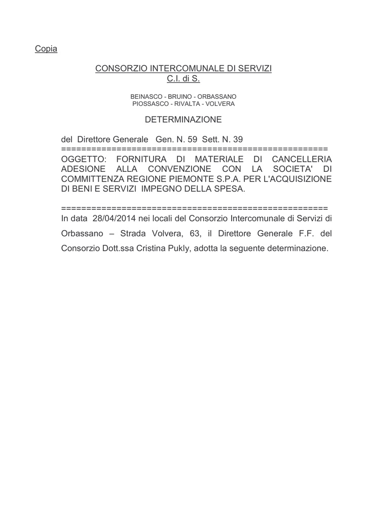 Copia CONSORZIO INTERCOMUNALE DI SERVIZI C.I. di S. BEINASCO - BRUINO - ORBASSANO PIOSSASCO - RIVALTA - VOLVERA DETERMINAZIONE del Direttore Generale Gen. N. 59 Sett. N. 39 ===================================================== OGGETTO: FORNITURA DI MATERIALE DI CANCELLERIA ADESIONE ALLA CONVENZIONE CON LA SOCIETA' DI COMMITTENZA REGIONE PIEMONTE S.P.A. PER L'ACQUISIZIONE DI BENI E SERVIZI IMPEGNO DELLA SPESA. ===================================================== In data 28/04/2014 nei locali del Consorzio Intercomunale di Servizi di Orbassano – Strada Volvera, 63, il Direttore Generale F.F. del Consorzio Dott.ssa Cristina Pukly, adotta la seguente determinazione. OGGETTO: FORNITURA DI MATERIALE DI CANCELLERIA ADESIONE ALLA CONVENZIONE CON LA SOCIETA' DI COMMITTENZA REGIONE PIEMONTE S.P.A. PER L'ACQUISIZIONE DI BENI E SERVIZI IMPEGNO DELLA SPESA. IL DIRETTORE GENERALE Premesso che - l’art. 11 della direttiva 2004/18/CE, in base alla quale “Gli Stati membri possono prevedere la possibilità per le amministrazioni aggiudicatrici di acquistare lavori, forniture e/o servizi facendo ricorso ad una centrale di committenza”; - l’art. 33 del D.Lgs. 163/2006, Codice dei contratti pubblici relativi a lavori, servizi e forniture emanato in attuazione della direttive 2004/17/CE e 2004/18/CE, che attribuisce alle stazioni appaltanti e agli enti aggiudicatori la possibilità di acquisire lavori, servizi e forniture facendo ricorso a centrali di committenza; - la Legge Finanziaria per l’anno 2007 (L. 27/12/2006 n. 296 - comma 455) che prevede, conformemente a quanto stabilito dai principi e dalle norme del diritto comunitario, ai fini del contenimento e della razionalizzazione della spesa per l’acquisto di beni e servizi, che le Regioni possono costituire centrali di acquisto che operino quali centrali di committenza, in conformità anche al dettato dell’art. 33 D.Lgs. 163/2006 e s.m.i., in favore delle amministrazioni ed enti regionali, degli enti locali, degli enti del Servizio Sanitario Nazionale e delle altre pubbliche amministrazioni aventi sede nel medesimo territorio; - la L.R. 19 del 6/08/2007, con la quale la Regione Piemonte ha promosso la costituzione della Società di Committenza Regione Piemonte S.p.A. (S.C.R. Piemonte S.p.A.) con il compito di ottimizzare le procedure di scelta degli appaltatori pubblici nelle materie di interesse regionale, con particolare riferimento ai settori delle grandi infrastrutture, dei trasporti e dell’edilizia sanitaria; - l’art. 3 comma 1 lett. b) della citata L.R. 19 del 6/08/2007, che individua i soggetti che hanno facoltà di ricorrere ad S.C.R. Piemonte S.p.A. sulla base di apposite convenzioni; Evidenziato che la S.C.R. Piemonte in data 28/08/2013, a seguito di espletamento di gara ad evidenza pubblica, ha sottoscritto la convenzione per la fornitura di cancelleria tradizionale ed ecologica per i soggetti di cui all’art. 3, l.r. 19/2007 per il periodo 28/08/2013-27/08/2015, con la società ERREBIAN S.p.A.con sede in Via dell’Informatica, 8 – Località Santa Palomba, Pomezia (RM); Accertato che il Consorzio ha la necessità di acquistare materiale di cancelleria per un importo annuo di circa 4.000,00 euro; Ritenuto di aderire, per l’acquisto di materiale di cancelleria, alla convenzione S.C.R Piemonte con decorrenza immediata e fino a tutta la durata della stessa; Precisato, altresì, che nella convenzione SCR Piemonte non è contemplata la fornitura di carta per fotocopie e del materiale di consumo per stampanti, fax (cartucce, toner…); Ritenuto, altresì, di affidare alla ditta Il Papiro C.so Novara, 38 Torino, per il periodo maggio/dicembre 2014, l’incarico per la fornitura della carta per fotocopie e del materiale di consumo per le stampanti, fax in dotazione al Consorzio il cui importo ammonta ad €. 1.500,00 come da preventivo pervenuto in data 22/03/2014; Preso atto che: l’Assemblea Consortile con deliberazione n. 4 del 19/03/2014 ha approvato il Bilancio di previsione 2014- pluriennale 2014/2016; il Consiglio di Amministrazione con deliberazione n. 11 del 26/03/2014 ha approvato il Piano Esecutivo di Gestione per l’anno 2014; Ritenuto necessario, procedere all’impegno della spesa per l’anno 2014 ammontante ad € 4.000,00 (IVA compresa) Attestata la regolarità tecnica della presente determinazione; DETERMINA 1. di dare atto che la S.C.R. Piemonte in data 28/08/2013, a seguito di espletamento di gara ad evidenza pubblica, ha sottoscritto la convenzione per la fornitura di cancelleria tradizionale ed ecologica per i soggetti di cui all’art. 3, l.r. 19/2007 per il periodo 28/08/2013-27/08/2015, con la società ERREBIAN S.p.A. con sede in Via dell’Informatica, 8 – Località Santa Palomba, Pomezia (RM); 2. di aderire alla convenzione S.C.R Piemonte per la fornitura di materiale di cancelleria con decorrenza immediata e fino a tutta la durata della stessa; 3. di dare atto che nella convenzione SCR Piemonte non è contemplata la fornitura di carta per fotocopie e del materiale di consumo per stampanti, fax (cartucce, toner…); 4. di affidare alla ditta Il Papiro s.r.l. C.so Novara, 38 Torino, per il periodo maggio/dicembre 2014, l’incarico per la fornitura della carta per fotocopie e del materiale di consumo per le stampanti, fax in dotazione al Consorzio il cui importo ammonta ad €. 1.500,00; 5. di impegnare l’importo di euro 4.000,00 (IVA compresa) per l’acquisto di materiale di cancelleria e di consumo per stampanti e fax in dotazione al Consorzio sul capitolo n. 421-01 “Cancelleria e spese varie” così dettagliato: • €. 2.500,00 impegno n. 2014/93 per il materiale fornito dalla Convenzione SCR con la ditta ERREBIAN S.P.A.; CIG: Z5C0EEAA32 • €. 1.500,00 impegno n. 2014/94 per il materia fornito dalla Ditta IL Papiro di Torino: CIG:ZBA0EEC388; 6. la presente determinazione acquista efficacia all’atto dell’apposizione del visto di regolarità contabile attestante la copertura finanzi