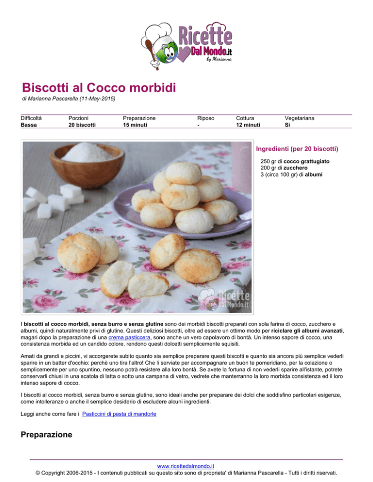 Biscotti al Cocco morbidi di Marianna Pascarella (11-May-2015) Difficoltá Bassa Porzioni 20 biscotti Preparazione 15 minuti Riposo - Cottura 12 minuti Vegetariana Si Ingredienti (per 20 biscotti) 250 gr di cocco grattugiato 200 gr di zucchero 3 (circa 100 gr) di albumi I biscotti al cocco morbidi, senza burro e senza glutine sono dei morbidi biscotti preparati con sola farina di cocco, zucchero e albumi, quindi naturalmente privi di glutine. Questi deliziosi biscotti, oltre ad essere un ottimo modo per riciclare gli albumi avanzati, magari dopo la preparazione di una crema pasticcera, sono anche un vero capolavoro di bontà. Un intenso sapore di cocco, una consistenza morbida ed un candido colore, rendono questi dolcetti semplicemente squisiti. Amati da grandi e piccini, vi accorgerete subito quanto sia semplice preparare questi biscotti e quanto sia ancora più semplice vederli sparire in un batter d'occhio: perchè uno tira l'altro! Che li serviate per accompagnare un buon te pomeridiano, per la colazione o semplicemente per uno spuntino, nessuno potrà resistere alla loro bontà. Se avete la fortuna di non vederli sparire all'istante, potrete conservarli chiusi in una scatola di latta o sotto una campana di vetro, vedrete che manterranno la loro morbida consistenza ed il loro intenso sapore di cocco. I biscotti al cocco morbidi, senza burro e senza glutine, sono ideali anche per preparare dei dolci che soddisfino particolari esigenze, come intolleranze o anche il semplice desiderio di escludere alcuni ingredienti. Leggi anche come fare i Pasticcini di pasta di mandorle Preparazione www.ricettedalmondo.it © Copyright 2006-2015 - I contenuti pubblicati su questo sito sono di proprieta' di Marianna Pascarella - Tutti i diritti riservati. 1. Per preparare i biscotti al cocco morbidi iniziate a mettere gli albumi in una ciotola e lavorateli con le fruste di una planetaria o di uno sbattitore elettrico, aggiungendo gradatamente lo zucchero durante la lavorazione. 2. Quando avrete montato gli albumi e terminato l'incorporazione dello zucchero unite il cocco grattugiato (tutto insieme) ed incorporatelo con una spatola, mescolando delicatamente per non smontare gli albumi. 3. Ottenuto un impasto morbido staccatene dei pezzetti e formate delle palline che andrete a sistemate su una teglia rivestita con della carta forno, leggermente distanziate, schiacciandole un po' con il dorso della mano. 4. Quando tutte le palline saranno pronte infornate i vostri biscotti in forno preriscaldato a 170° per 12-15 minuti, controllate la cottura, dovranno dorarsi appena, quindi sfornateli e lasciateli raffreddare completamente. 5. I vostri biscotti al cocco morbidi sono pronti! Categorie Biscotti Ricette Dolci Cucina per Bambini Ricette per Bambini Idee Buffet per Feste Ricette Feste per Bambini Ricette per Feste Ricette Vegetariane In Cucina con Marianna Ricette con soli Albumi Dolci senza latte Dolci senza glutine Dolci senza burro Ricette per Intolleranti Ricette per Intolleranti al latte Ricette per Celiaci Dolci senza glutine www.ricettedalmondo.it © Copyright 2006-2015 - I contenuti pubblicati su questo sito sono di proprieta' di Marianna Pascarella - Tutti i diritti riservati.