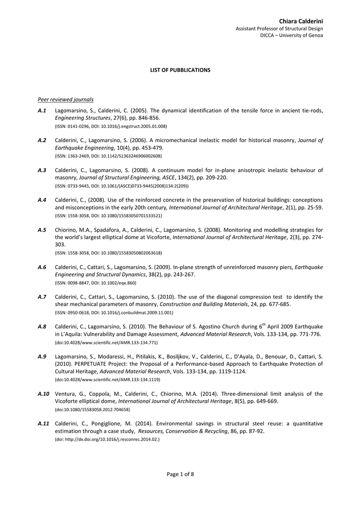 Chiara Calderini Assistant Professor of Structural Design DICCA – University of Genoa LIST OF PUBBLICATIONS Peer reviewed journals A.1 Lagomarsino, S., Calderini, C. (2005). The dynamical identification of the tensile force in ancient tie-rods, Engineering Structures, 27(6), pp. 846-856. (ISSN: 0141-0296, DOI: 10.1016/j.engstruct.2005.01.008) A.2 Calderini, C., Lagomarsino, S. (2006). A micromechanical inelastic model for historical masonry, Journal of Earthquake Engineering, 10(4), pp. 453-479. (ISSN: 1363-2469, DOI: 10.1142/S1363246906002608) A.3 Calderini, C., Lagomarsino, S. (2008). A continuum model for in-plane anisotropic inelastic behaviour of masonry, Journal of Structural Engineering, ASCE, 134(2), pp. 209-220. (ISSN: 0733-9445, DOI: 10.1061/(ASCE)0733-9445(2008)134:2(209)) A.4 Calderini, C., (2008). Use of the reinforced concrete in the preservation of historical buildings: conceptions and misconceptions in the early 20th century, International Journal of Architectural Heritage, 2(1), pp. 25-59. (ISSN: 1558-3058, DOI: 10.1080/15583050701533521) A.5 Chiorino, M.A., Spadafora, A., Calderini, C., Lagomarsino, S. (2008). Monitoring and modelling strategies for the world’s largest elliptical dome at Vicoforte, International Journal of Architectural Heritage, 2(3), pp. 274303. (ISSN: 1558-3058, DOI: 10.1080/15583050802063618) A.6 Calderini, C., Cattari, S., Lagomarsino, S. (2009). In-plane strength of unreinforced masonry piers, Earthquake Engineering and Structural Dynamics, 38(2), pp. 243-267. (ISSN: 0098-8847, DOI: 10.1002/eqe.860) A.7 Calderini, C., Cattari, S., Lagomarsino, S. (2010). The use of the diagonal compression test to identify the shear mechanical parameters of masonry, Construction and Building Materials, 24, pp. 677-685. (ISSN: 0950-0618, DOI: 10.1016/j.conbuildmat.2009.11.001) A.8 th Calderini, C., Lagomarsino, S. (2010). The Behaviour of S. Agostino Church during 6 April 2009 Earthquake in L’Aquila: Vulnerability and Damage Assessment, Advanced Material Research, Vols. 133-134, pp. 771-776. (doi:10.4028/www.scientific.net/AMR.133-134.771) A.9 Lagomarsino, S., Modaressi, H., Pitilakis, K., Bosiljkov, V., Calderini, C., D’Ayala, D., Benouar, D., Cattari, S. (2010). PERPETUATE Project: the Proposal of a Performance-based Approach to Earthquake Protection of Cultural Heritage, Advanced Material Research, Vols. 133-134, pp. 1119-1124. (doi:10.4028/www.scientific.net/AMR.133-134.1119) A.10 Ventura, G., Coppola, M., Calderini, C., Chiorino, M.A. (2014). Three-dimensional limit analysis of the Vicoforte elliptical dome, International Journal of Architectural Heritage, 8(5), pp. 649-669. (doi:10.1080/15583058.2012.704658) A.11 Calderini, C., Pongiglione, M. (2014). Environmental savings in structural steel reuse: a quantitative estimation through a case study, Resources, Conservation & Recycling, 86, pp. 87-92. (doi: http://dx.doi.org/10.1016/j.resconrec.2014.02.) Page 1 of 8 Chiara Calderini Assistant Professor of Structural Design DICCA – University of Genoa A.12 Calderini, C., Degli Abbati, S., Cotič, P., Kržan, M., Bosiljkov, V. (2014). Tests on masonry panels with plaster: correlation between structural damage and cracks, Bulletin of Earthquake Engineering, 13 (1), pp. 237-256. (doi: 10.1007/s10518-014-9632-y) A.13 Calderini, C., Lagomarsino, S., Rossi, M., Decanio, G., Mongelli, M., Roselli, I. (2014). Shaking table tests of an arch-pillars system and design of strengthening by the use of tie-rods, Bulletin of Earthquake Engineering, 13 (1), pp. 279-297. (Doi: 10.1007/s10518-014-9678-x) A.14 Calderini, C., Lagomarsino, S. (2015). Collapse of masonry arches under seismic loads: static tests on a scale model, Journal of Structural Engineering, 141(5), n. 4014137. (doi: 10.1061/(ASCE)ST.1943-541X.0001079 , 04014137) A.15 Rossi, M., Calderini, C., Lagomarsino, S. (2015). Experimental testing of the seismic in-plane displacement capacity of masonry cross vaults through a scale model, Bulletin of earthquake engineering, published on line 16 Sept. 2015. (doi: 10.1007/s10518-015-9815-1) A.16 Calderini, C., Pagnini, L., (2015). The debate on the strengthening of two slender masonry structures in early XX century: a contribution to the history of wind engineering, Journal of Wind Engineering and Industrial Aerodynamics, accepted for pubblication. A.17 Milani, G., Rossi, M., Calderini, C., Lagomarsino, S. (2015). Heterogeneous numerical modelling of a smallscale dry joint masonry cross vault, Engineering Structures, submitted for publication. A.18 Calderini, C., Degli Abbati, S. (2015). Diagonal compression tests on stone masonry panels: experimental results and analytical interpretations, International Journal of Masonry Research and Innovation, submitted for publication. A.19 Pongiglione, M., Calderini, C., (2015). Sustainable structural design: a comprehensive literature review, ASCE Journal of Structural Engineering, submitted for publication. National Journals B.1 Calderini, C. (2003). Cultura e tecnica del cemento armato nel restauro dei monumenti in Italia (19001945), Palladio – Rivista di Storia dell’Architettura e Restauro, 32, Dicembre-Luglio 2003, pp. 92-102. (ISSN: 0031-0379) B.2 Bonino, M., Calderini, C. (2004). Eventi sismici ed occasioni di progetto, da Messina a San Giuliano di Puglia. Parametro – Rivista Internazionale di Architettura ed Urbanistica, 251, Maggio-Giugno 2004, numero monografico “Movimenti moderni: architettura e terremoto 1883-2004”, Faenza, Bologna, pp. 2223. (ISSN: 0031-1731) B.3 Calderini, C. (2012). Forma e struttura, Casabella, n° 818, Ottobre 2012, p. 80 (ISSN: 0008-7181) B.4 Calderini C., (2015). Scelte di sostenibilità nel progetto strutturale: esempi di applicazione al restauro. Il progetto sostenibile. Edicom Edizioni, in corso di stampa. Page 2 of 8 Chiara Calderini Assistant Professor of Structural Design DICCA – University of Genoa Chapters of Books C.1 Calderini, C., (2001). “I monumenti della paura. Cul