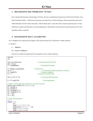 El Nino 1. DESCRIZIONE DEL PROBLEMA "El Nino" Fare l’analisi del fenomeno climatologico El Nino, dovuto ai cambiamenti di pressione nell’Oceano Pacifico. So uthern Oscillation Index = differenza di pressione atmosferica tra l’Isola di Pasqua e Darwin(Australia) misurata a livello del mare. Nel file elnino.mat (load –ASCII elnino.mat) vi sono tali valori, misurati ogni mese per 14 anni. Effettuare il grafico del fenomeno, ed il periodogramma. Determinare i due picchi di massima potenza ed il corrispondente indice e periodo. 2. DESCRIZIONE DELL’ALGORITMO Si è sviluppato uno script per poter leggere il file elnino.mat per poi visualizzare l’output richiesto. Lo Script è: • elnino.m 2.1 function "elnino.m " La function simula la trasmissione di un segnale su di un canale rumoroso. clear all; clc; load -ascii elnino.mat; data = elnino ; t = 1:length(data); Y = fft(data, length( data)); Y(1) = 0; N = length(Y); Fs = 1; freq = (0:N/2)*1/N; P = Y.*conj(Y)/N; % caricamento dal file di dati % orizzonte dei tempi % dft dei dati % eliminazione della componente continua % numero campioni % frequenza fondamentale % orizzonte delle frequenze % periodogramma % Indice e valore delle due componenti a potenza massima [picchi, ind] = sort(P(2:N/2+1), 'descend'); p1 = picchi(1); p2 = picchi(2); fr1 = freq(ind(1)+1); fr2 = freq(ind(2)+1); T1 = 1/fr1; T2 = 1/fr2; % menu del programma i = -1 ; while (i ~= 0) clc; disp('### EL NINO ###'); disp(sprintf('\nMENU\n----\n')); disp('[1] Grafico Dati'); disp('[2] Spettro Dati'); Guer r a Stefano Pagina 2 El Nino disp('[3] Periodogramma'); disp('[4] Grafici in una Finestra'); disp('[5] Indici Fenomeno'); disp('[0] Esci'); i = input(''); i = cast(i, 'uint8'); switch(i) case 0 clc; case 1 figure(1) subplot(1,1,1) plot(t, data, 'r.', t, data); xlabel('Mesi'); title('Southern Oscillation Index'); case 2 figure(1) subplot(1,1,1) stem(freq(2:N/2+1), abs(Y(2:N/2+1))); title('Grafico dello spettro'); xlabel('frequenze [Hz]'); ylabel('|Y(f)|'); grid on; case 3 figure(1) subplot(1,1,1) stem(freq(2:N/2+1), P(2:N/2+1)); title('Periodogramma'); xlabel('cicli/mesi'); ylabel('potenza'); grid on; case 4 figure(1) subplot(3,1,1) plot(t, data, 'r.', t, data); xlabel('Mesi'); title('Southern Oscillation Index'); subplot(3,1,2) stem(freq(2:N/2+1), abs(Y(2:N/2+1))); title('Grafico dello spettro'); xlabel('frequenze [Hz]'); ylabel('|Y(f)|'); grid on; subplot(3,1,3) stem(freq(2:N/2+1), P(2:N/2+1)); title('Periodogramma'); xlabel('cicli/mesi'); ylabel('potenza'); grid on; case 5 clc; disp('### EL NINO ###'); % Stampa sullo standard output dei risultati Risultato = fprintf('\n\t\t\t\t\tIndice\tPotenza\t\tFrequenza\tPeriodo\n'); fprintf(1, 'Picco massimo\t\t%d\t\t%6.5f\t%6.5f\t\t%6.5f\n',ind(1), p1, fr1, T1); fprintf(1, 'Picco successivo\t%d\t\t%6.5f\t%6.5f\t\t%6.5f\n',ind(2), p2, fr2, T2); j = input('Per tornare al menu permere un tasto qualsiasi: '); otherwise j = input('Selezione non valida. Per tornare al menu premere un tasto qualsiasi: '); end clc; end Guer r a Stefano Pagina 3 El Nino Lo script realizza un menù interattivo che propone varie visualizzazioni dei dati restituendo all’ occorrenza: [1] Grafico Dati [2] Spettro Dati [3] Periodogramma [4] Grafici in una Finestra [5] Indici Fenomeno [0] Esci 3. ECCEZIONI PREVISTE Non sono state previste eccezioni. 4. ESEMPI D’USO Il menù interattivo si presenta così: 4.1 Grafico Dati Guer r a Stefano Pagina 4 El Nino 4.2 Spettro Dati 4.3 Periodogramma Guer r a Stefano Pagina 5 El Nino 4.4 Tutti i precedenti Grafici in una sola finestra 4.5 Indici del fenomeno: (potenza massima) Guer r a Stefano Pagina 6 El Nino Guer r a Stefano Pagina 7