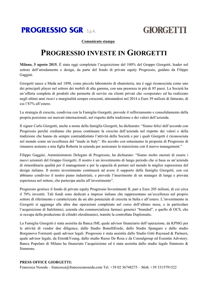 Comunicato stampa PROGRESSIO INVESTE IN GIORGETTI Milano, 5 agosto 2015. È stata oggi completata l’acquisizione del 100% del Gruppo Giorgetti, leader nel settore dell’arredamento e design, da parte del fondo di private equity Progressio, guidato da Filippo Gaggini. Giorgetti nasce a Meda nel 1898, come piccolo laboratorio di ebanisteria, ma è oggi riconosciuta come uno dei principali player nel settore dei mobili di alta gamma, con una presenza in più di 85 paesi. La Società ha un’offerta completa di prodotti che permette di servire sia clienti privati che «corporate» ed ha realizzato negli ultimi anni ricavi e marginalità sempre crescenti, attestandosi nel 2014 a Euro 39 milioni di fatturato, di cui l’87% all’estero. La strategia di crescita, condivisa con la Famiglia Giorgetti, prevede il rafforzamento e consolidamento della propria posizione sui mercati internazionali, nel rispetto della tradizione e dei valori dell’azienda. Il signor Carlo Giorgetti, anche a nome della famiglia Giorgetti, ha dichiarato: “Siamo felici dell’accordo con Progressio perché crediamo che possa continuare la crescita dell’azienda nel rispetto dei valori e della tradizione che hanno da sempre contraddistinto l’attività della Società e per i quali Giorgetti è riconosciuta nel mondo come un’eccellenza del “made in Italy”. Ho accolto con entusiasmo la proposta di Progressio di rimanere assieme a mia figlia Roberta in azienda per assicurare la transizione con il nuovo management.” Filippo Gaggini, Amministratore Delegato di Progressio, ha dichiarato: “Siamo molto onorati di essere i nuovi azionisti del Gruppo Giorgetti. Il nostro è un investimento di lungo periodo che si basa su un’azienda di straordinaria qualità per il management e per la capacità di portare nel mondo la miglior espressione del design italiano. Il nostro investimento continuerà ad avere il supporto della famiglia Giorgetti, con cui abbiamo condiviso il nostro piano industriale, e prevede l’inserimento di un manager di lunga e provata esperienza nel settore, che partecipa anche all’investimento”. Progressio gestisce il fondo di private equity Progressio Investimenti II, pari a Euro 205 milioni, di cui circa il 70% investiti. Tali fondi sono dedicati a imprese italiane che rappresentano un’eccellenza nel proprio settore di riferimento e caratterizzate da un alto potenziale di crescita in Italia e all’estero. L’investimento in Giorgetti si aggiunge alle altre due operazioni completate nel corso dell’ultimo mese, e in particolare l’acquisizione di Italchimici, azienda che commercializza farmaci generici “branded”, e quello di OCS, che si occupa della produzione di cilindri oleodinamici, tramite la controllata Duplomatic. La Famiglia Giorgetti è stata assistita da Banca IMI, quale advisor finanziario dell’operazione, da KPMG per le attività di vendor due diligence, dallo Studio BonelliErede, dallo Studio Spangaro e dallo studio Borgonovo Formenti quali advisor legali. Progressio è stata assistita dallo Studio Gitti Raynaud & Partners, quale advisor legale, da Ernst&Young, dallo studio Russo De Rosa e da Consulgroup ed Essentia Advsiory. Banca Popolare di Milano ha finanziato l’acquisizione ed è stata assistita dallo studio legale Simmons & Simmons. PRESS OFFICE GIORGETTI: Francesca Noseda – [email protected] Tel. +39 02 36748275 – Mob. +39 3315791522