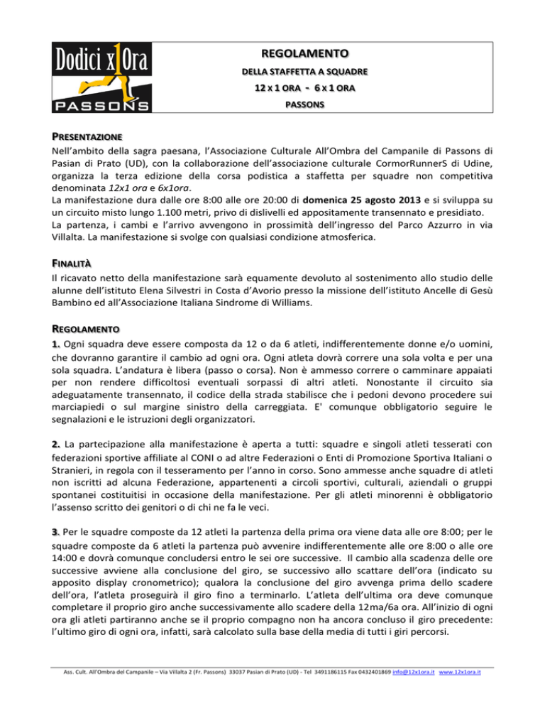 REGOLAMENTO DELLA STAFFETTA A SQUADRE 12 X 1 ORA - 6 X 1 ORA PASSONS PRESENTAZIONE Nell’ambito della sagra paesana, l’Associazione Culturale All’Ombra del Campanile di Passons di Pasian di Prato (UD), con la collaborazione dell’associazione culturale CormorRunnerS di Udine, organizza la terza edizione della corsa podistica a staffetta per squadre non competitiva denominata 12x1 ora e 6x1ora. La manifestazione dura dalle ore 8:00 alle ore 20:00 di domenica 25 agosto 2013 e si sviluppa su un circuito misto lungo 1.100 metri, privo di dislivelli ed appositamente transennato e presidiato. La partenza, i cambi e l’arrivo avvengono in prossimità dell’ingresso del Parco Azzurro in via Villalta. La manifestazione si svolge con qualsiasi condizione atmosferica. FINALITÀ Il ricavato netto della manifestazione sarà equamente devoluto al sostenimento allo studio delle alunne dell’istituto Elena Silvestri in Costa d’Avorio presso la missione dell’istituto Ancelle di Gesù Bambino ed all’Associazione Italiana Sindrome di Williams. REGOLAMENTO 1. Ogni squadra deve essere composta da 12 o da 6 atleti, indifferentemente donne e/o uomini, che dovranno garantire il cambio ad ogni ora. Ogni atleta dovrà correre una sola volta e per una sola squadra. L’andatura è libera (passo o corsa). Non è ammesso correre o camminare appaiati per non rendere difficoltosi eventuali sorpassi di altri atleti. Nonostante il circuito sia adeguatamente transennato, il codice della strada stabilisce che i pedoni devono procedere sui marciapiedi o sul margine sinistro della carreggiata. E' comunque obbligatorio seguire le segnalazioni e le istruzioni degli organizzatori. 2. La partecipazione alla manifestazione è aperta a tutti: squadre e singoli atleti tesserati con federazioni sportive affiliate al CONI o ad altre Federazioni o Enti di Promozione Sportiva Italiani o Stranieri, in regola con il tesseramento per l’anno in corso. Sono ammesse anche squadre di atleti non iscritti ad alcuna Federazione, appartenenti a circoli sportivi, culturali, aziendali o gruppi spontanei costituitisi in occasione della manifestazione. Per gli atleti minorenni è obbligatorio l’assenso scritto dei genitori o di chi ne fa le veci. 3. Per le squadre composte da 12 atleti la partenza della prima ora viene data alle ore 8:00; per le squadre composte da 6 atleti la partenza può avvenire indifferentemente alle ore 8:00 o alle ore 14:00 e dovrà comunque concludersi entro le sei ore successive. Il cambio alla scadenza delle ore successive avviene alla conclusione del giro, se successivo allo scattare dell’ora (indicato su apposito display cronometrico); qualora la conclusione del giro avvenga prima dello scadere dell’ora, l’atleta proseguirà il giro fino a terminarlo. L’atleta dell’ultima ora deve comunque completare il proprio giro anche successivamente allo scadere della 12ma/6a ora. All’inizio di ogni ora gli atleti partiranno anche se il proprio compagno non ha ancora concluso il giro precedente: l’ultimo giro di ogni ora, infatti, sarà calcolato sulla base della media di tutti i giri percorsi. Ass. Cult. All’Ombra del Campanile – Via Villalta 2 (Fr. Passons) 33037 Pasian di Prato (UD) - Tel 3491186115 Fax 0432401869 [email protected] www.12x1ora.it REGOLAMENTO DELLA STAFFETTA A SQUADRE 12 X 1 ORA - 6 X 1 ORA PASSONS Se un atleta non è più in grado di concludere la propria gara, deve darne comunicazione agli addetti al cambio i quali provvederanno a conteggiargli i giri percorsi fino a quel momento. Non può essere sostituito da un altro atleta per quella frazione d’ora. La squadra rimane comunque nella competizione. Gli atleti in attesa del cambio devono collocarsi nello spazio appositamente predisposto, posizionandosi in ordine crescente di pettorale rispetto alla linea del traguardo. 4. Nella lista di presentazione degli atleti, ogni squadra deve indicare chiaramente il nominativo del o dei propri responsabili ed i relativi recapiti telefonici. Ogni squadra deve garantire la presenza di almeno un responsabile durante tutta la durata della manifestazione. Nella lista di presentazione, ogni squadra deve evidenziare il nominativo degli atleti tesserati con relativo numero di tessera, mentre per ogni atleta non tesserato deve essere fornita una certificazione di idoneità fisica per attività non competitive. 5. La quota di iscrizione è di 120 euro per le squadre composte da 12 atleti, di 60 euro le squadre composte da 6 atleti e di 30 euro per gli atleti singoli, oltre a 20 euro a titolo di cauzione per i microchip che verrà restituita alla consegna degli stessi. La quota di iscrizione unitamente alla cauzione e all’assicurazione di cui al punto successivo dovrà essere versata in contanti o bonificata sul conto IT11E0634067684510700844031 presso la Cassa di Risparmio FVG SpA intestato all'Associazione Culturale All'Ombra del Campanile di Passons di Pasian di Prato entro il 19/08/2013 indicando il nome della squadra e/o del relativo responsabile. L’iscrizione della squadra alla manifestazione sarà completata compilando la lista degli atleti on line sul sito www.12x1ora.it o inviandola all’indirizzo di posta elettronica [email protected] oppure al numero di fax 0432401869 dalle ore 8 alle ore 20. 6. Unitamente al versamento di cui al punto precedente, dovranno essere versati anche 2 euro per la copertura assicurativa (Free Sport) per ogni atleta non tesserato con federazioni sportive affiliate al CONI o ad altre Federazioni o Enti di Promozione Sportiva o non in regola con il tesseramento per l’anno in corso. 7. Il ritrovo tra i responsabili di squadra e l’organizzazione è fissato alle 7 di domenica 25 agosto presso il luogo della partenza per una riunione tecnica. Durante la riunione si provvederà ad illustrare le modalità della staffetta e ad ogni squadra verranno consegnati tre microchip (uno è di riserva) che ogni atleta dovrà usare alternativamente. Al termine della mani