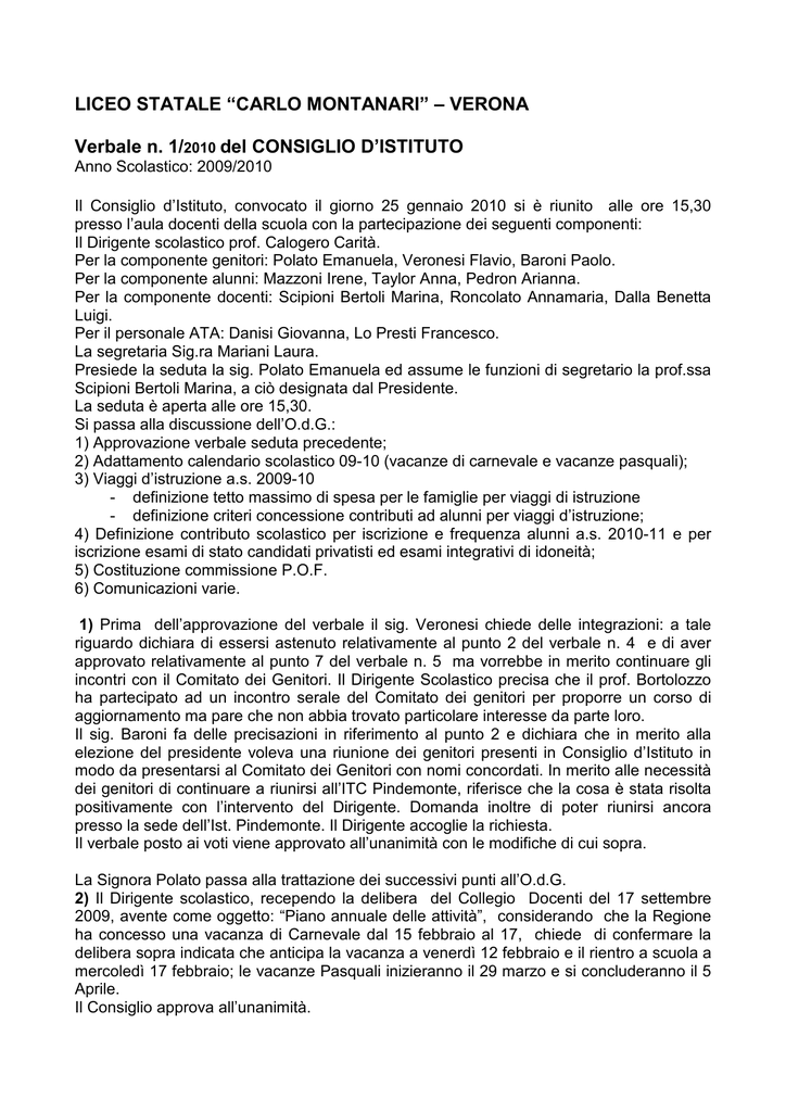 LICEO STATALE “CARLO MONTANARI” – VERONA Verbale n. 1/2010 del CONSIGLIO D’ISTITUTO Anno Scolastico: 2009/2010 Il Consiglio d’Istituto, convocato il giorno 25 gennaio 2010 si è riunito alle ore 15,30 presso l’aula docenti della scuola con la partecipazione dei seguenti componenti: Il Dirigente scolastico prof. Calogero Carità. Per la componente genitori: Polato Emanuela, Veronesi Flavio, Baroni Paolo. Per la componente alunni: Mazzoni Irene, Taylor Anna, Pedron Arianna. Per la componente docenti: Scipioni Bertoli Marina, Roncolato Annamaria, Dalla Benetta Luigi. Per il personale ATA: Danisi Giovanna, Lo Presti Francesco. La segretaria Sig.ra Mariani Laura. Presiede la seduta la sig. Polato Emanuela ed assume le funzioni di segretario la prof.ssa Scipioni Bertoli Marina, a ciò designata dal Presidente. La seduta è aperta alle ore 15,30. Si passa alla discussione dell’O.d.G.: 1) Approvazione verbale seduta precedente; 2) Adattamento calendario scolastico 09-10 (vacanze di carnevale e vacanze pasquali); 3) Viaggi d’istruzione a.s. 2009-10 - definizione tetto massimo di spesa per le famiglie per viaggi di istruzione - definizione criteri concessione contributi ad alunni per viaggi d’istruzione; 4) Definizione contributo scolastico per iscrizione e frequenza alunni a.s. 2010-11 e per iscrizione esami di stato candidati privatisti ed esami integrativi di idoneità; 5) Costituzione commissione P.O.F. 6) Comunicazioni varie. 1) Prima dell’approvazione del verbale il sig. Veronesi chiede delle integrazioni: a tale riguardo dichiara di essersi astenuto relativamente al punto 2 del verbale n. 4 e di aver approvato relativamente al punto 7 del verbale n. 5 ma vorrebbe in merito continuare gli incontri con il Comitato dei Genitori. Il Dirigente Scolastico precisa che il prof. Bortolozzo ha partecipato ad un incontro serale del Comitato dei genitori per proporre un corso di aggiornamento ma pare che non abbia trovato particolare interesse da parte loro. Il sig. Baroni fa delle precisazioni in riferimento al punto 2 e dichiara che in merito alla elezione del presidente voleva una riunione dei genitori presenti in Consiglio d’Istituto in modo da presentarsi al Comitato dei Genitori con nomi concordati. In merito alle necessità dei genitori di continuare a riunirsi all’ITC Pindemonte, riferisce che la cosa è stata risolta positivamente con l’intervento del Dirigente. Domanda inoltre di poter riunirsi ancora presso la sede dell’Ist. Pindemonte. Il Dirigente accoglie la richiesta. Il verbale posto ai voti viene approvato all’unanimità con le modifiche di cui sopra. La Signora Polato passa alla trattazione dei successivi punti all’O.d.G. 2) Il Dirigente scolastico, recependo la delibera del Collegio Docenti del 17 settembre 2009, avente come oggetto: “Piano annuale delle attività”, considerando che la Regione ha concesso una vacanza di Carnevale dal 15 febbraio al 17, chiede di confermare la delibera sopra indicata che anticipa la vacanza a venerdì 12 febbraio e il rientro a scuola a mercoledì 17 febbraio; le vacanze Pasquali inizieranno il 29 marzo e si concluderanno il 5 Aprile. Il Consiglio approva all’unanimità. 3) Viene quindi presentato dal Dirigente Scolastico l’elenco delle classi che parteciperanno ai Viaggi d’Istruzione completo di date, mete, nome degli insegnanti accompagnatori e dei docenti di riserva. il Dirigente Scolastico fa presente che, quest’anno, le classi che non prenderanno parte ai Viaggi d’Istruzione sono 15; 43 quelle che parteciperanno. Il Dirigente Scolastico richiede di confermare il tetto massimo di spesa per le famiglie per la partecipazione degli alunni ai viaggi d’istruzione a 300,00 Euro, con uno scarto tollerato del 10% sul costo. Il Budget complessivo di Euro 8000,00 destinato alla concessione di contributi, rimane lo stesso dell’anno precedente; vengono previsti due scaglioni di reddito per l’erogazione del contributo mantenendo le stesse fasce dell’anno precedente. Il contributo erogato dalla scuola non potrà comunque superare il 50% del costo complessivo. E’ concessa una deroga in casi eccezionali, a discrezione del Dirigente, per alunni meritevoli che si trovano in comprovate condizioni di disagio economico e familiare. I Docenti che organizzeranno i viaggi d’istruzione si faranno promotori per illustrare i criteri per l’assegnazione dei contributi. Il sig. Baroni chiede delucidazioni in merito all’utilità del viaggio d’istruzione, ad esempio quello che prevede come meta la città di Padova, e le relative motivazioni. La prof.ssa Roncolato precisa che tutti i docenti organizzatori dei viaggi devono compilare un modulo indicando l’itinerario e le motivazioni. Il Dirigente Scolastico interviene chiarendo che prima vi è la proposta del viaggio da parte del Docente al C.di Cl., una volta approvato, il viaggio rientra nell’attività didattica della classe, la proposta passa al Coll. Doc. che entra nel merito della proposta. Il sig. Baroni chiede che tutti i pasti, le guide e gli ingressi ai musei siano inseriti nel preventivo di spesa. Il Dirigente puntualizza che i pacchetti prevedono solo la mezza pensione e alcuni anche il servizio guide. I pasti esterni sono a carico delle famiglie, così anche gli ingressi ai musei non statali che non prevedono la gratuità per gli studenti. La prof.ssa Roncolato chiede di estendere anche alle classi terze la possibilità di usufruire i 5 giorni scolastici per i viaggi d’istruzione. Il Dirigente risponde che non è possibile cambiare il Regolamento Scolastico, se ne discuterà in sede di modifica al suddetto regolamento. Il CdI approva all’unanimità Allegato n. 1: Elenco Viaggi d’Istruzione a.sc. 2009/10 e Estratto Delibera C.d.I. Criteri concessione contributi viaggi d’istruzione. 4) Il Dirigente Scolastico illustra la situazione finanziaria dell’Istituto, dei finanziamenti ministeriali sempre più esigui e non sufficienti per far fronte alle