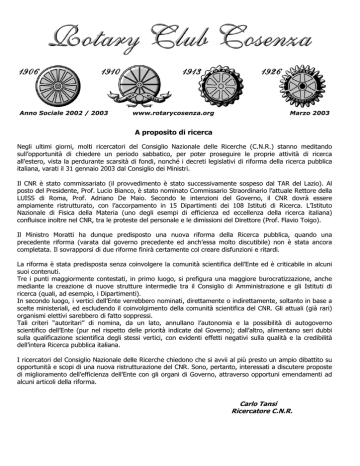 Anno Sociale 2002 / 2003 www.rotarycosenza.org Marzo 2003 A proposito di ricerca Negli ultimi giorni, molti ricercatori del Consiglio Nazionale delle Ricerche (C.N.R.) stanno meditando sull’opportunità di chiedere un periodo sabbatico, per poter proseguire le proprie attività di ricerca all’estero, vista la perdurante scarsità di fondi, nonché i decreti legislativi di riforma della ricerca pubblica italiana, varati il 31 gennaio 2003 dal Consiglio dei Ministri. Il CNR è stato commissariato (il provvedimento è stato successivamente sospeso dal TAR del Lazio). Al posto del Presidente, Prof. Lucio Bianco, è stato nominato Commissario Straordinario l’attuale Rettore della LUISS di Roma, Prof. Adriano De Maio. Secondo le intenzioni del Governo, il CNR dovrà essere ampiamente ristrutturato, con l’accorpamento in 15 Dipartimenti dei 108 Istituti di Ricerca. L’Istituto Nazionale di Fisica della Materia (uno degli esempi di efficienza ed eccellenza della ricerca italiana) confluisce inoltre nel CNR, tra le proteste del personale e le dimissioni del Direttore (Prof. Flavio Toigo). Il Ministro Moratti ha dunque predisposto una nuova riforma della Ricerca pubblica, quando una precedente riforma (varata dal governo precedente ed anch’essa molto discutibile) non è stata ancora completata. Il sovrapporsi di due riforme finirà certamente col creare disfunzioni e ritardi. La riforma è stata predisposta senza coinvolgere la comunità scientifica dell’Ente ed è criticabile in alcuni suoi contenuti. Tre i punti maggiormente contestati, in primo luogo, si prefigura una maggiore burocratizzazione, anche mediante la creazione di nuove strutture intermedie tra il Consiglio di Amministrazione e gli Istituti di ricerca (quali, ad esempio, i Dipartimenti). In secondo luogo, i vertici dell’Ente verrebbero nominati, direttamente o indirettamente, soltanto in base a scelte ministeriali, ed escludendo il coinvolgimento della comunità scientifica del CNR. Gli attuali (già rari) organismi elettivi sarebbero di fatto soppressi. Tali criteri “autoritari” di nomina, da un lato, annullano l’autonomia e la possibilità di autogoverno scientifico dell’Ente (pur nel rispetto delle priorità indicate dal Governo); dall’altro, alimentano seri dubbi sulla qualificazione scientifica degli stessi vertici, con evidenti effetti negativi sulla qualità e la credibilità dell’intera Ricerca pubblica italiana. I ricercatori del Consiglio Nazionale delle Ricerche chiedono che si avvii al più presto un ampio dibattito su opportunità e scopi di una nuova ristrutturazione del CNR. Sono, pertanto, interessati a discutere proposte di miglioramento dell’efficienza dell’Ente con gli organi di Governo, attraverso opportuni emendamenti ad alcuni articoli della riforma. Carlo Tansi Ricercatore C.N.R. 01/04 giugno 2003 BRISBANE ROTARY CONVENTION Certi di fare cosa gradita, segnaliamo che è in fase di organizzazione un viaggio/soggiorno in occasione della Convention Mondiale del Rotary che si svolgerà in Australia dal 1° al 4 giugno p.v. ll progetto di viaggio prevede un costo per persona in doppia, pensione completa, di € 3.900,00, iscrizione inclusiva assicurazione Elvia medico/bagaglio: € 30,00. Tasse aeroportuali e visto (gratuito per turismo) a parte. E’ necessario il Passaporto in corso di validità. Partenza il 20 maggio con volo di linea Qantas per Singapore; il 22 si partirà per Sydney. 23 maggio SYDNEY: Prima colazione. Visita guidata di SYDNEY. Seguirà la crociera sulla nave che permette di vedere lo spettacolo unico di Sydney vista dalla baia. Pranzo buffet a bordo. Nel pomeriggio tempo libero. Cena seafood al ristorante The Waterfront nel famoso quartiere storico dei Rocks. 24 maggio SYDNEY/AYERS ROCK: Prima colazione. Trasferimento in aeroporto e volo per AYERS ROCK, il centro rosso dell’Australia. Visita di ULURU e ULURU KATA TJUTA CULTURAL CENTRE. Cena e pernottamento. 25 maggio ULURU, le OLGAS e KINGS CANYON: Prima colazione. Ci si sveglia presto per ammirare l’alba sopra il grande monolito (Uluru), spettacolo emozionante perché la colorazione che assume è sorprendente. Escursione alle Olga la catena montuosa formata da 36 cupole che evocano forme di giganti pietrificati. Visita alla magnifica Valley of the Winds. Pranzo. Prosegue l’escursione al KINGS CANYON. Cena e pernottamento. 26 maggio ALICE SPRINGS: Prima colazione. Visita del Kings Canyon; pranzo al Kings Canyon Resort. Proseguimento attraverso il bush, il tipico deserto australiano verso ALICE SPRINGS. Cena e pernottamento. 27 maggio 2003 ALICE SPRINGS/CAIRNS: Prima colazione. Visita di Alice Springs, sosta alla Scuola di volo e al rettilario, famoso nel mondo per le sue uniche specie di rettili. Pranzo libero. Trasferimento in aeroporto e volo per CAIRNS. Cena e pernotto 28 maggio 2003 CAIRNS: Prima colazione. Cairns è la città piu’ settentrionale del Queensland ed è situata in una bellissima baia naturale da dove partono le crociere per le isole della Grande Barriera Corallina. Giornata in crociera fra le isole. Buffet lunch. La barca ha parte del fondo in vetro per osservare il fondale marino in tutta la sua bellezza. Rientro in albergo. Cena con cuisine new age australiana al Red Ochre Grill. 29 maggio 2003 CAIRNS – La foresta pluviale Escursione alla foresta pluviale di Wooroonooran, si cammina fra cascate, eucalipti, alberi millenari, giochi d’acqua spettacolari, si visitano allevamenti di coccodrilli e canguri. Rientro in albergo. Cena in ristorante caratteristico. 30 maggio 2003 escursione fra gli aborigeni al KURANDA Village Escursione e visita alla tribù aborigena di Kuranda. Pranzo incluso. Rientro in albergo. Cena libera. Pernottamento. 31 maggio CAIRNS/BRISBANE Trasferimento in aeroporto e volo per BRISBANE. All’arrivo giro veloce della città. Proseguimento per la bellissima costa e sistemazione al PARK ROYAL SURFERS PARADISE Hotel. Pranzo libero. Cena. Pernottamento. 01 /04 giugno 