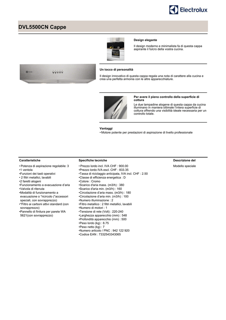 DVL5500CN Cappe Design elegante Il design moderno e minimalista fa di questa cappa aspirante il fulcro della vostra cucina. Un tocco di personalità Il design innovativo di questa cappa regala una nota di carattere alla cucina e crea una perfetta armonia con le altre apparecchiature. Per avere il pieno controllo della superficie di cottura Le due lampadine alogene di questa cappa da cucina illuminano in maniera ottimale l’intera superficie di cottura offrendo una visibilità ideale necessaria per un controllo totale. Vantaggi • Motore potente per prestazioni di aspirazione di livello professionale Caratteristiche Specifiche tecniche Descrizione del • Potenza di aspirazione regolabile: 3 •1 ventola •Funzioni dei tasti operativi • 2 filtri metallici, lavabili •2 faretti alogeni •Funzionamento a evacuazione d’aria •Valvola di ritenuta •Modalità di funzionamento a evacuazione o *ricircolo (*accessori speciali, con sovrapprezzo) •*Filtro ai carboni attivi standard (con sovrapprezzo) •Pannello di finitura per parete WA 5621(con sovrapprezzo) • Prezzo lordo incl. IVA CHF : 900.00 •Prezzo lordo IVA escl. CHF : 833.35 •Tassa di riciclaggio anticipata, IVA incl. CHF : 2.50 •Classe di efficienza energetica : D •Colore : Cromo •Scarico d'aria mass. (m3/h) : 380 •Scarico d'aria min. (m3/h) : 160 •Circolazione d’aria mass. (m3/h) : 180 •Circolazione d’aria min. (m3/h) : 100 •Numero illuminazione : 2 •Filtro metallico : 2 filtri metallici, lavabili •Numero di motori : 1 •Tensione di rete (Volt) : 220-240 •Larghezza apparecchio (mm) : 548 •Profondità apparecchio (mm) : 500 •Peso lordo (kg) : 8.75 •Peso netto (kg) : 7 •Numero articolo / PNC : 942 122 920 •Codice EAN : 7332543343065 Modello speciale
