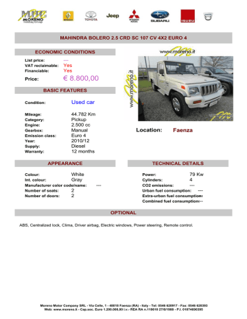 MAHINDRA BOLERO 2.5 CRD SC 107 CV 4X2 EURO 4 ECONOMIC CONDITIONS List price: VAT reclaimable: Financiable: --Yes Yes Price: € 8.800,00 BASIC FEATURES Condition: Used car Mileage: Category: Engine: Gearbox: Emission class: Year: Supply: Warranty: 44.782 Km Pickup 2.500 cc Manual Euro 4 2010/12 Diesel 12 months Location: APPEARANCE Colour: White Int. colour: Gray Manufacturer color code/name: Number of seats: 2 Number of doors: 2 Faenza TECHNICAL DETAILS Power: 79 Kw Cylinders: 4 CO2 emissions: --Urban fuel consumption: --Extra-urban fuel consumption: --Combined fuel consumption:--- --- OPTIONAL ABS, Centralized lock, Clima, Driver airbag, Electric windows, Power steering, Remote control. Moreno Motor Company SRL - Via Celle, 1 - 48018 Faenza (RA) - Italy - Tel: 0546 620917 - Fax: 0546 620393 Web: www.moreno.it - Cap.soc. Euro 1.200.000,00 i.v.- REA RA n.118610 27/6/1988 - P.I. 01074690395 NOTES Moreno Motor Company SRL - Via Celle, 1 - 48018 Faenza (RA) - Italy - Tel: 0546 620917 - Fax: 0546 620393 Web: www.moreno.it - Cap.soc. Euro 1.200.000,00 i.v.- REA RA n.118610 27/6/1988 - P.I. 01074690395